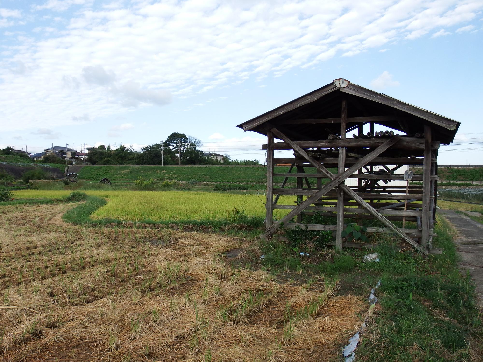 駅から15分ほどで広い空間にでてきました。たまねぎ小屋があります。自分にとってはかけがえのない思い出がいっぱいつまったたまねぎ小屋、農作業小屋の一種ですが、こんな骨組みだけの農作業小屋は泉州独特のものでは。ただの農作業小屋になってしまったたまねぎ小屋も少なくないですが、この骨組みにたまねぎをひっかけて干すのが本来の目的です。