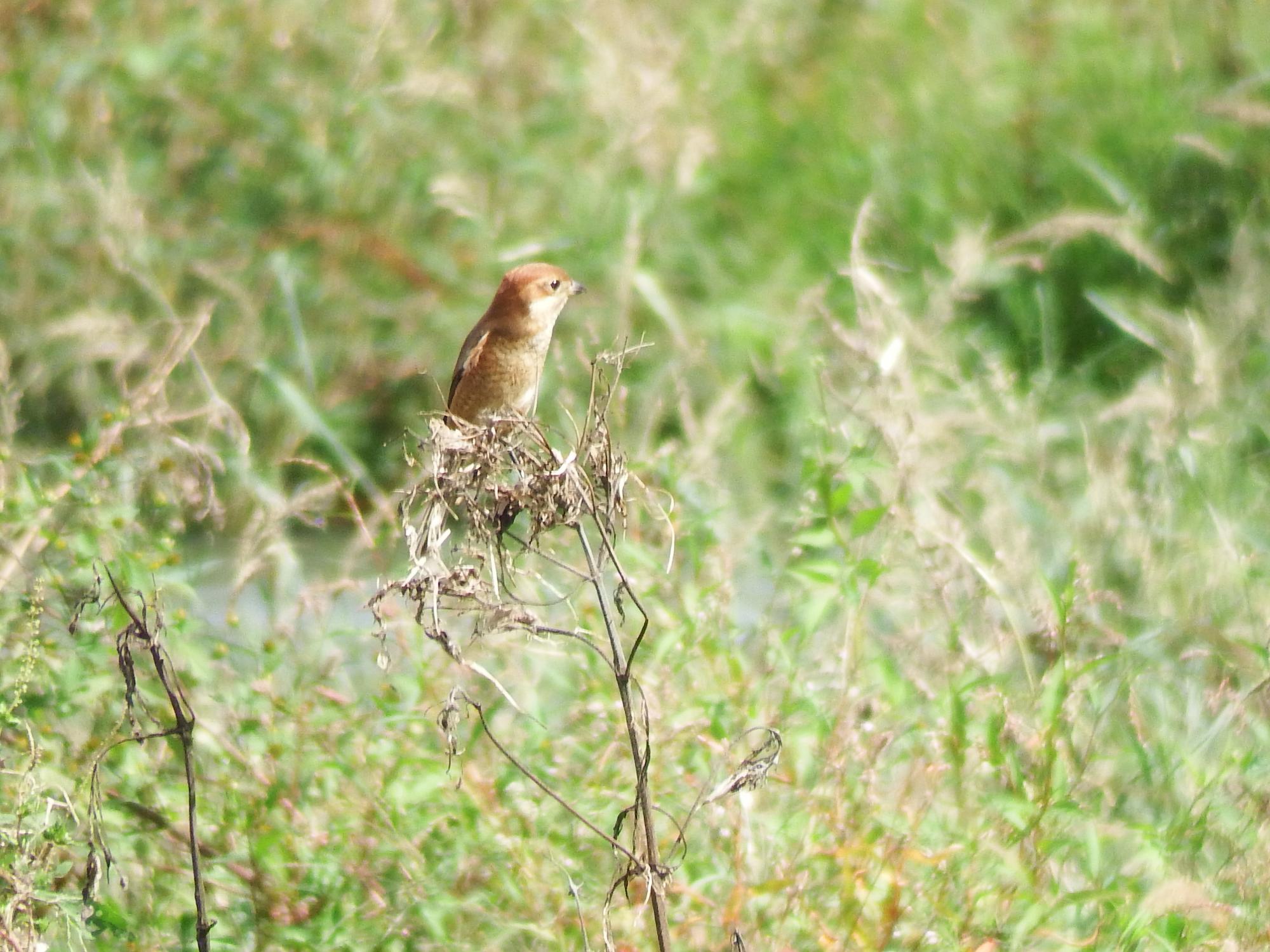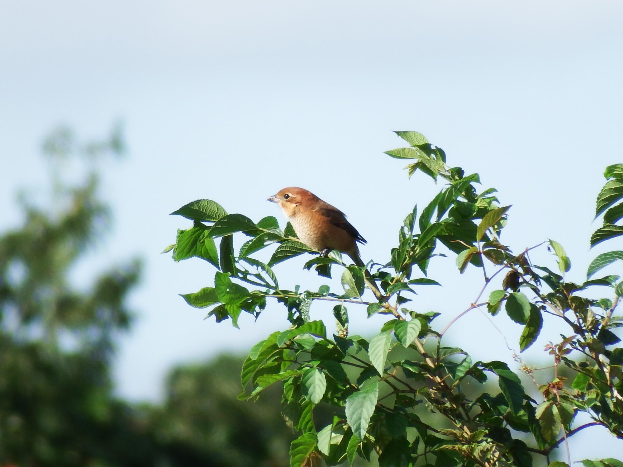 間近の梢にモズの♀、やんちゃな感じの♂と比べて優し気です。