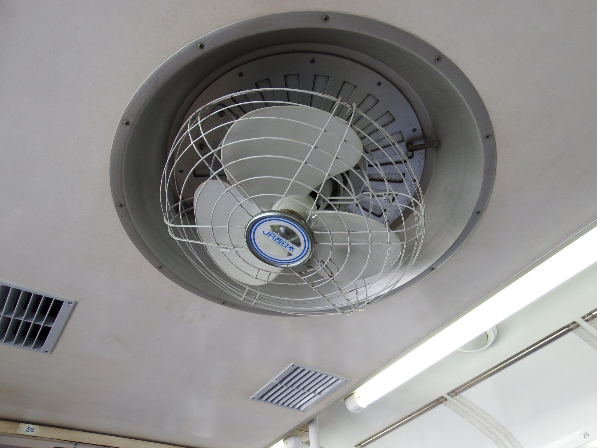 HL102編成クハ103-162の車内、なんかがらーんとしているなぁ、と、中吊りも荷物棚上にも全く広告がないことに気が付きました。グローブ型ベンチレーターの内側には扇風機、JNRのロゴに代わってJR西日本マークがついてます。