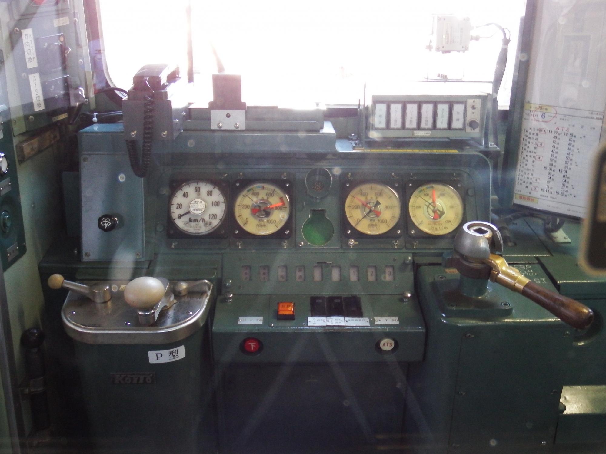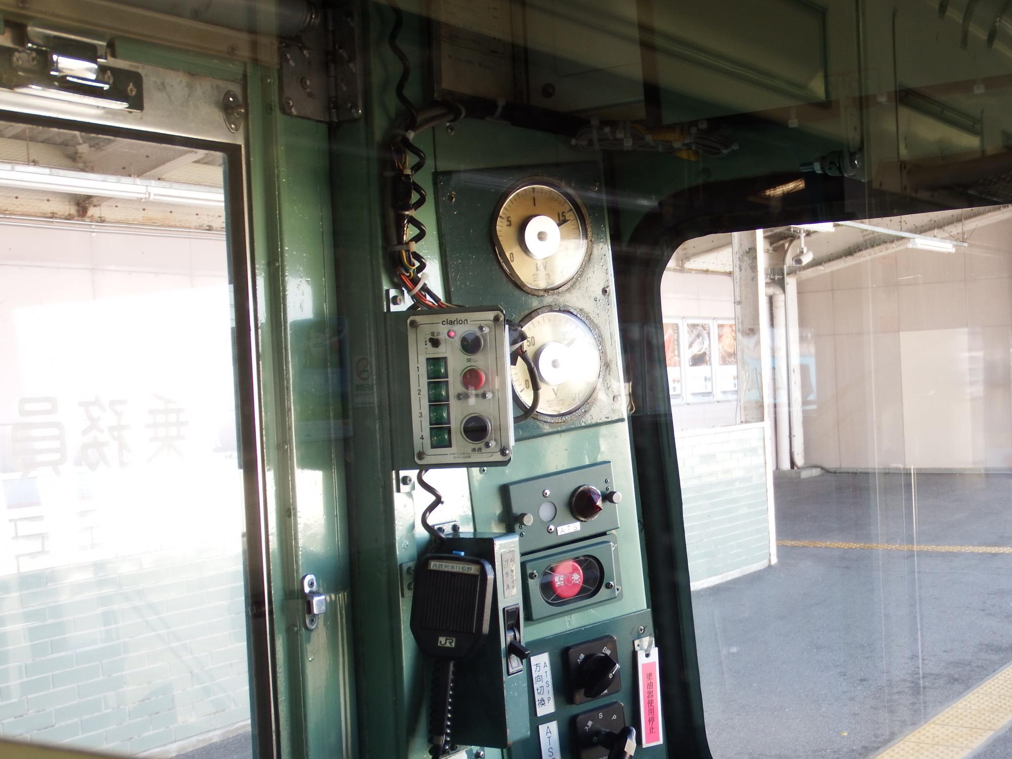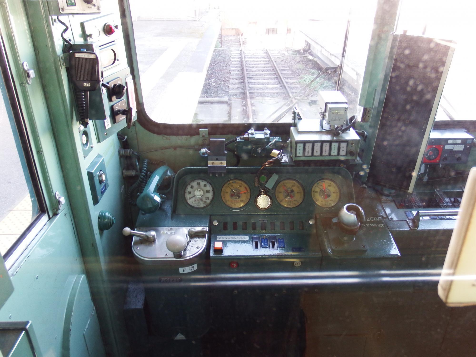 クハ103-162の運転台、昔の公衆電話の10円玉専用青電話のような受話器、LEDじゃなくて豆球が入っていると思われるパイロットランプ、スイッチ類のダイヤル式やトグル式のつまみ、これぞアナログ、殆ど昭和の町工場です。