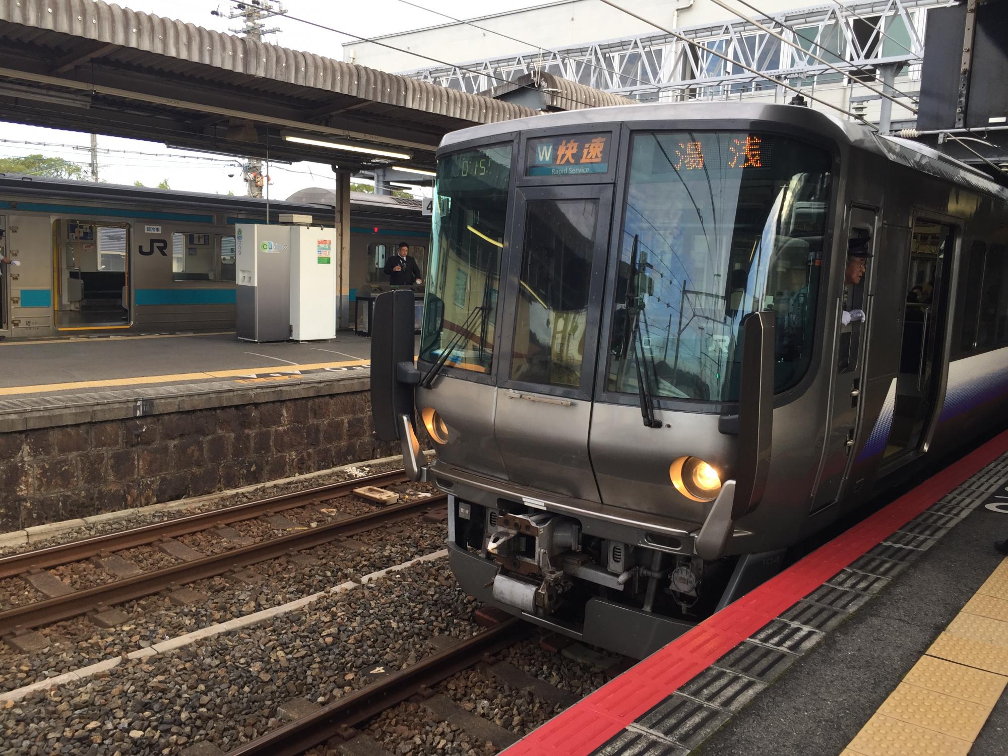 103系運用情報と列車番号が掲載されているえきから時刻表の路線時刻表を見比べて、和泉鳥取で8時台に4本の103系あるいは205系があることをチェック、おまけに283系のくろしお1号通過もこの時間帯です。