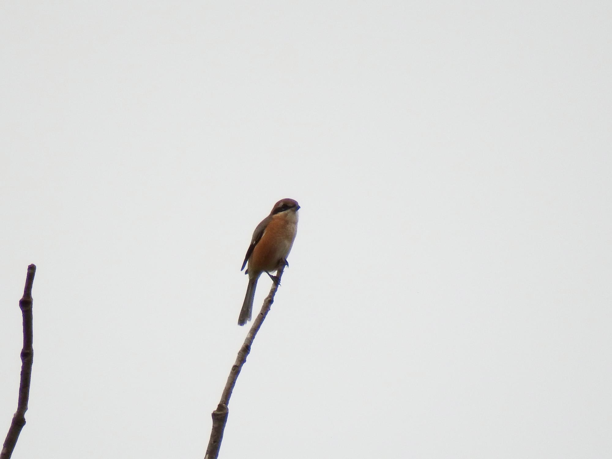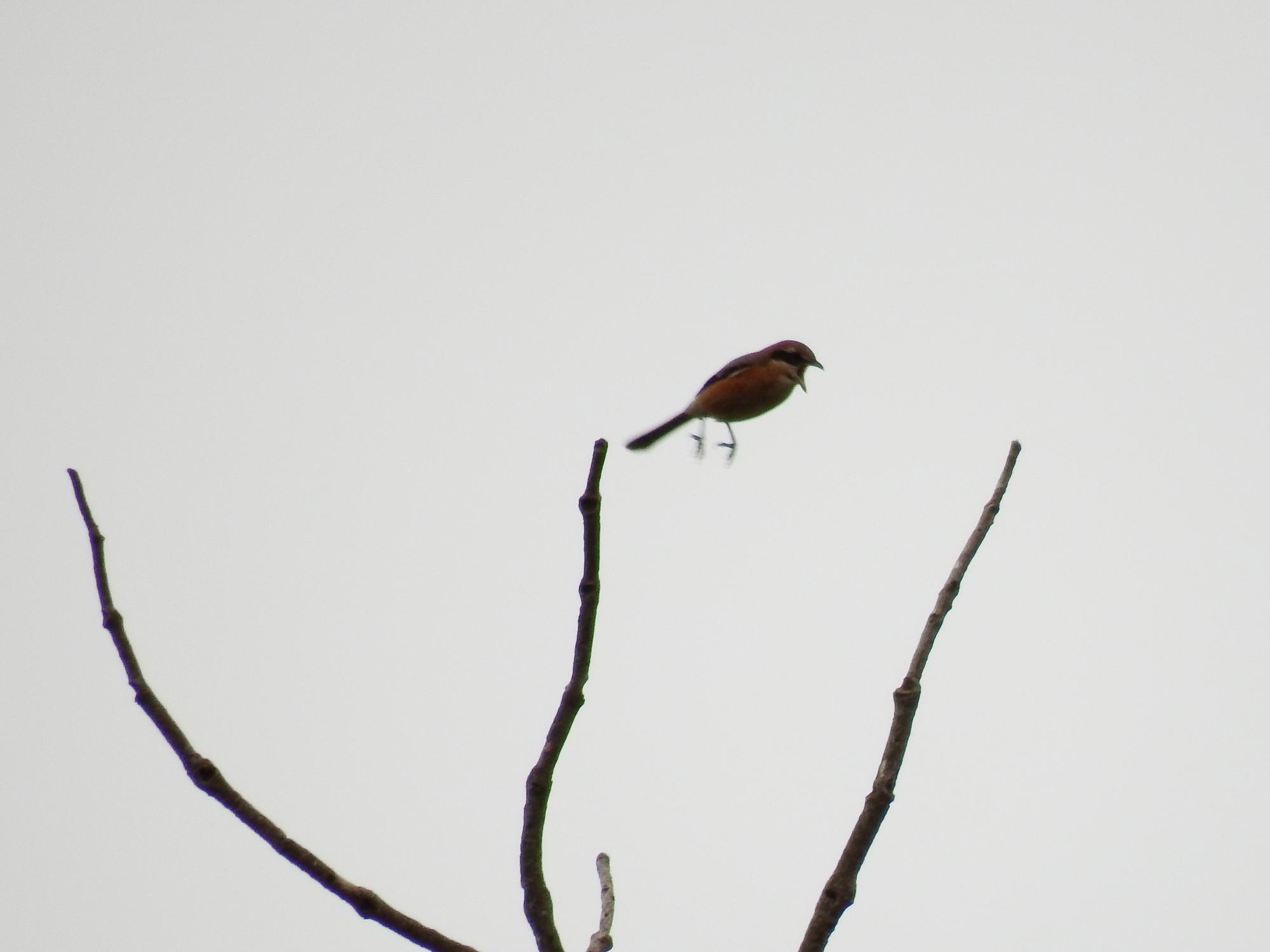 日本庭園の池の向こう側の梢のモズ、こんなシーンが撮れるとかなり嬉しい。
