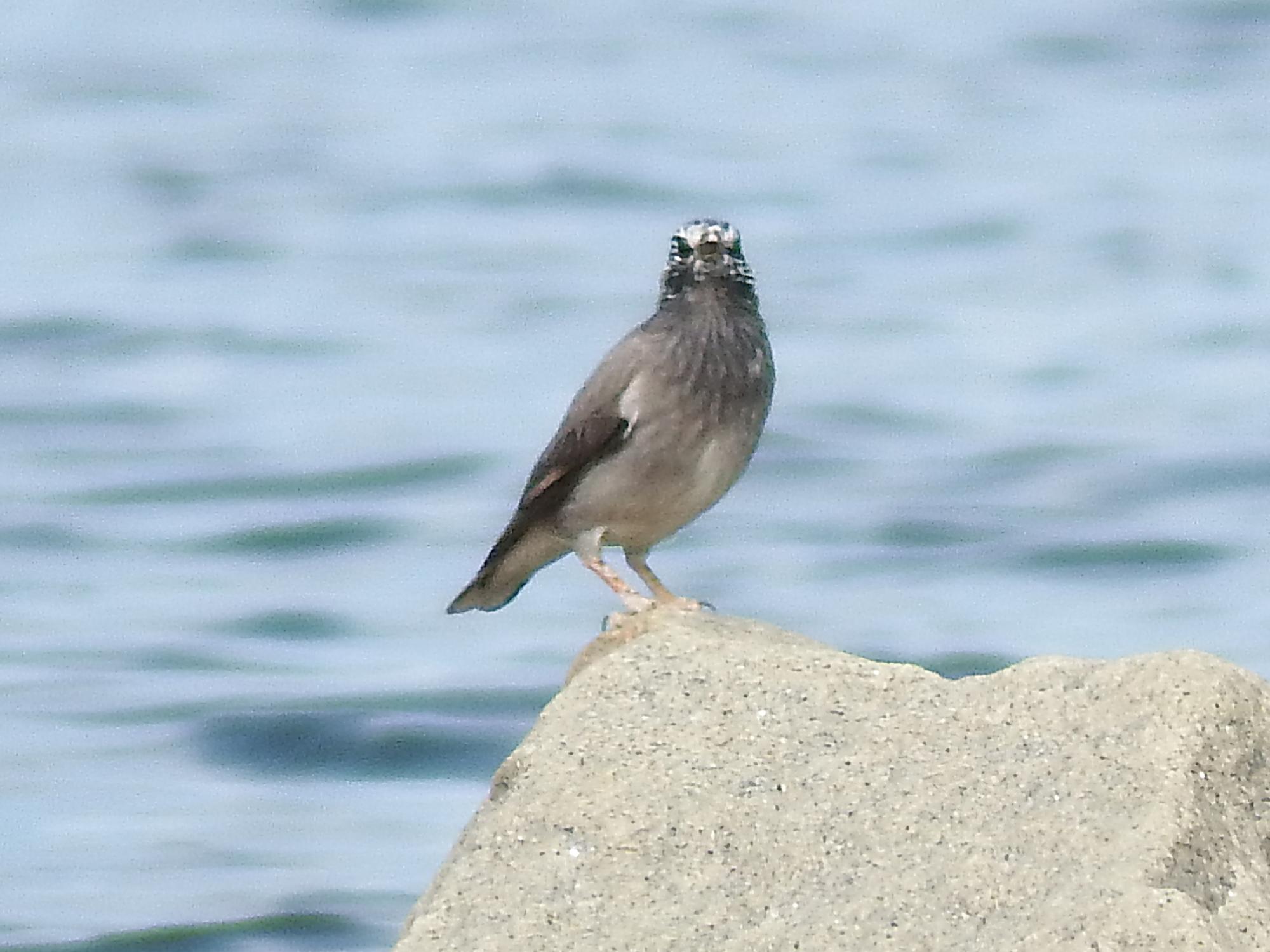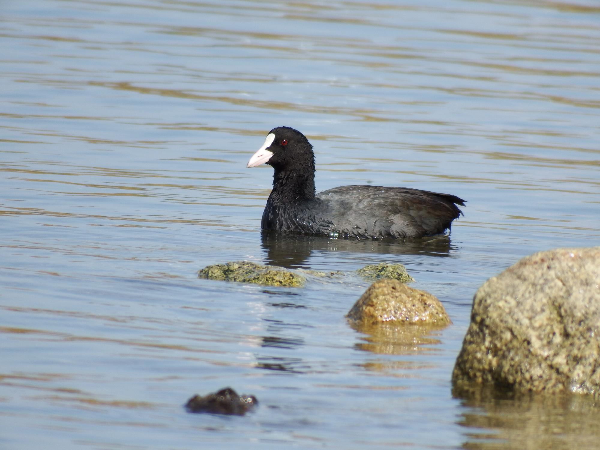 オオバンが1羽、他にオオバンはいないので、春に会った足を怪我をしている子の可能性が高いです。岩に乗っているのは、ちょっと見かけない顔つきのムクドリ。