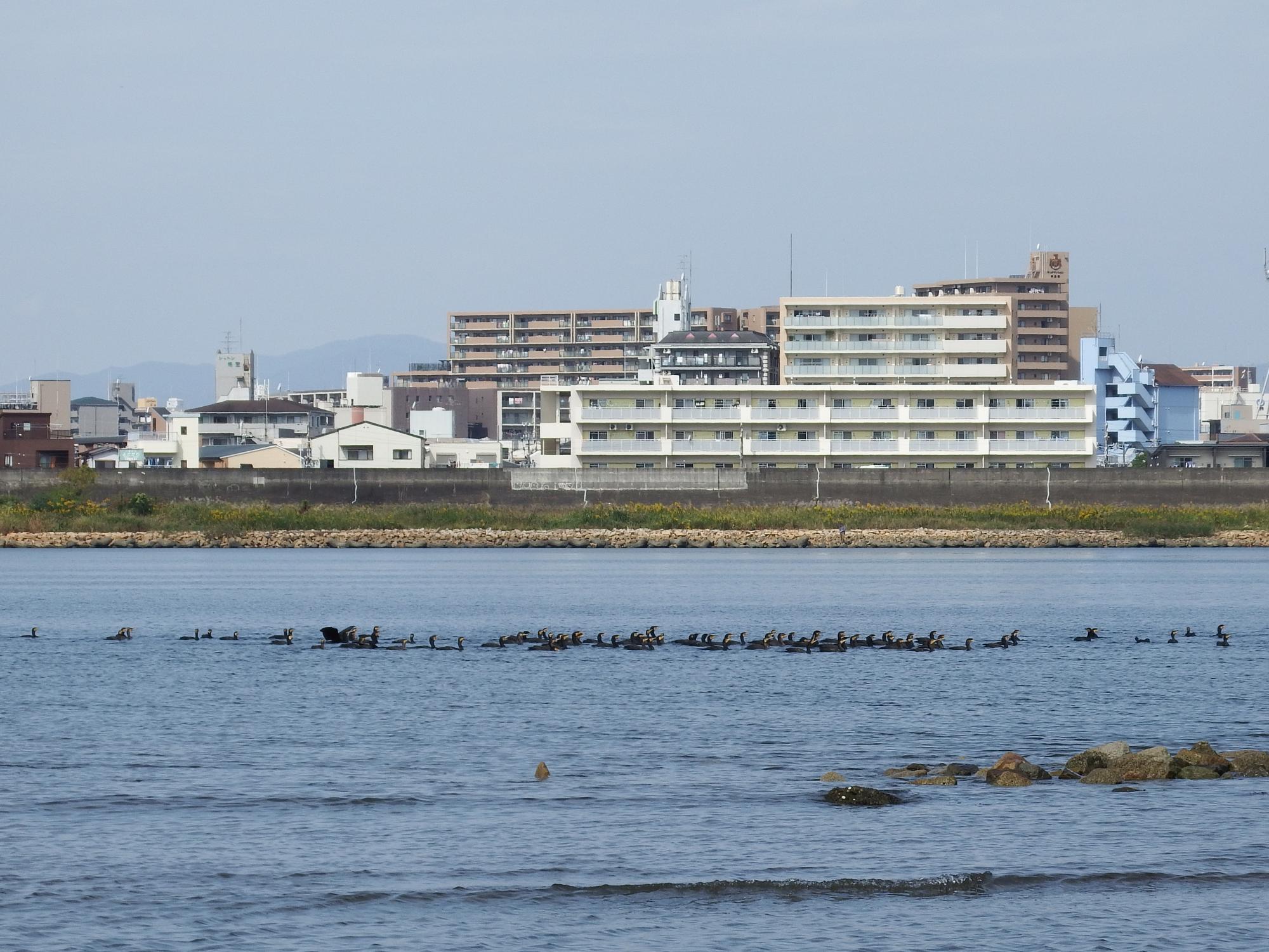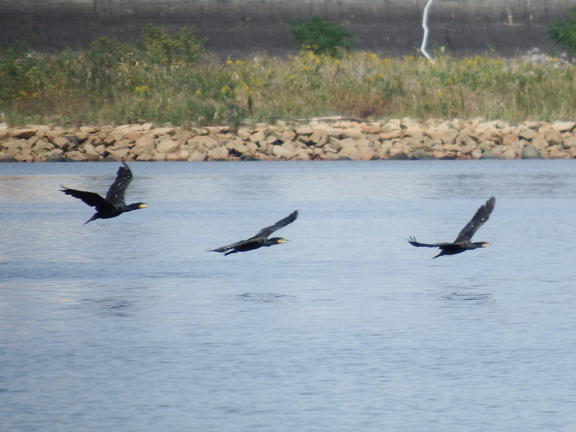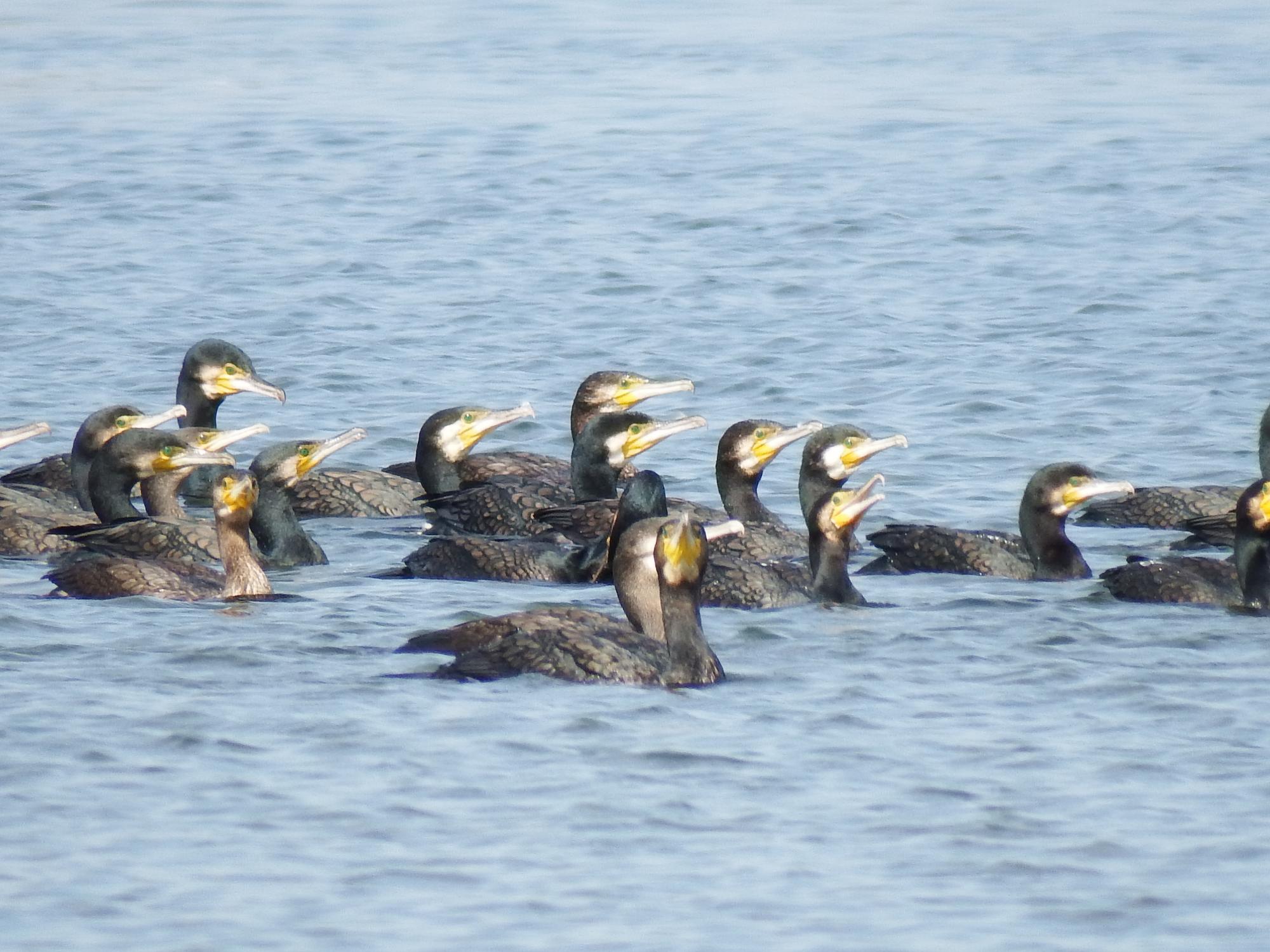 カワウの緊急ミーティングが開催されている模様、カワウたちの連絡網があって連絡を受けたカワウがどんどん集まってきているみたいです。既に集まっているカワウたちが遅れてやってくる仲間を見守っています。