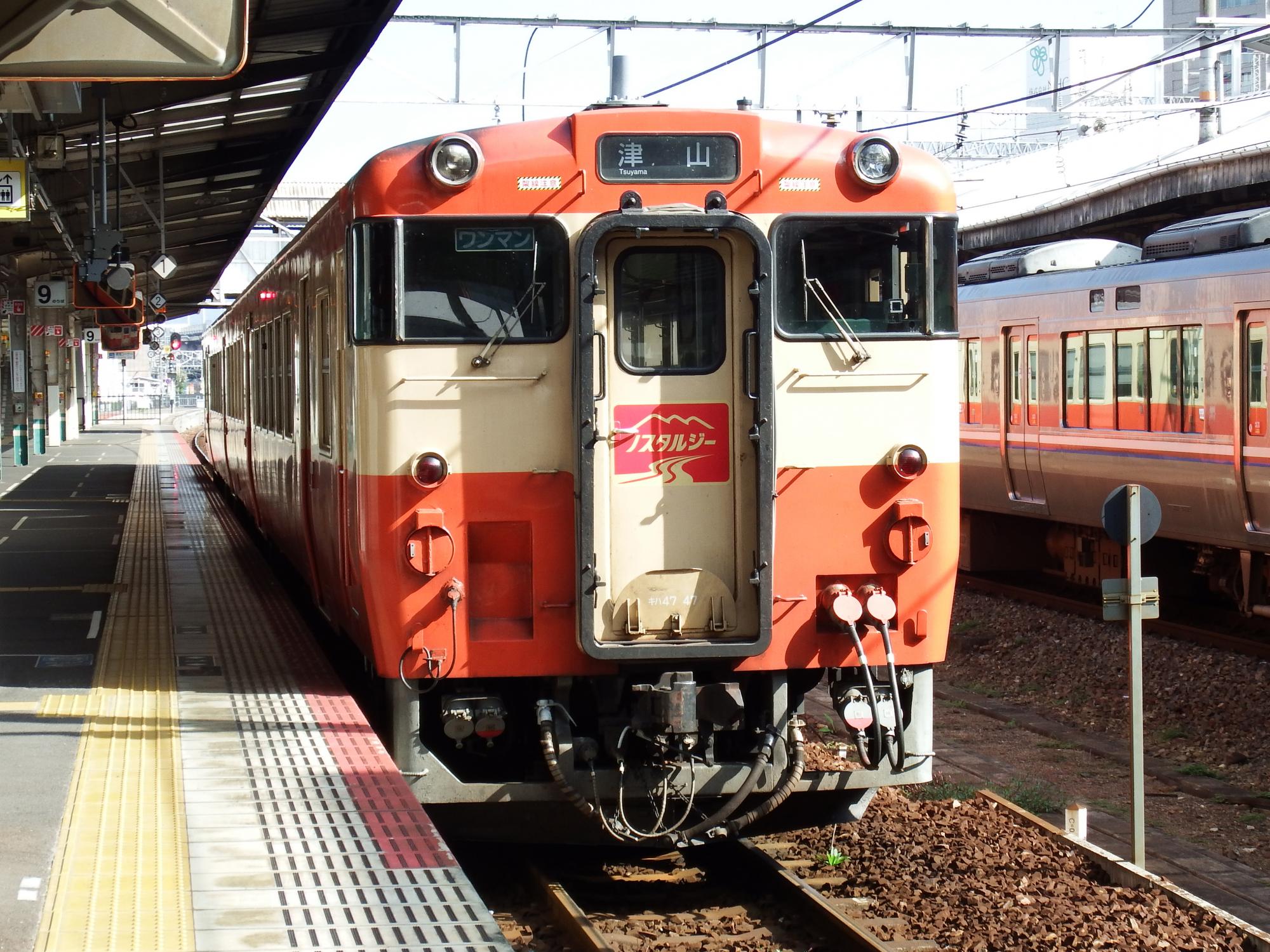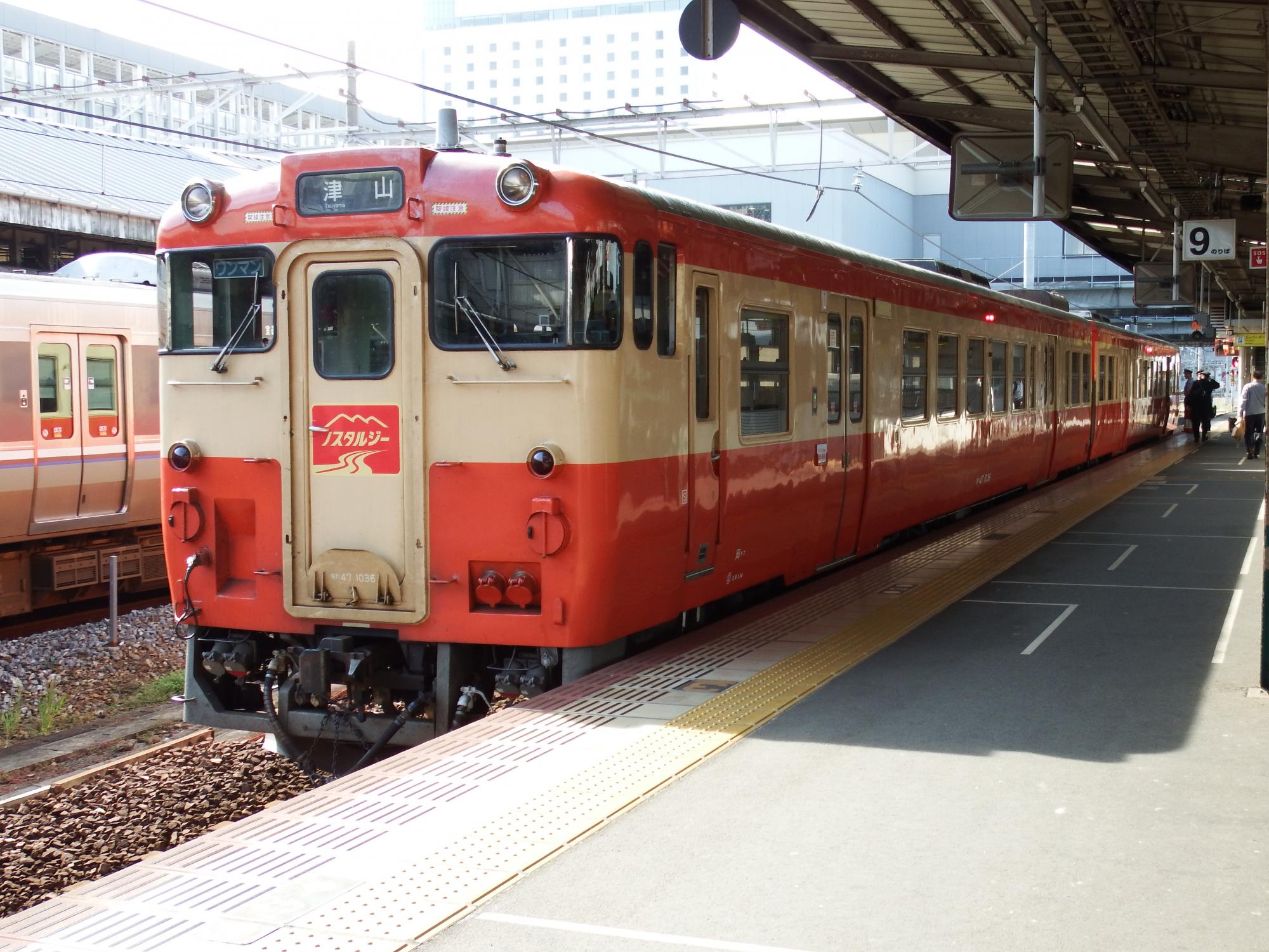 津山線ホームにキハ47のノスタルジートレインが入線してきたので移動。津山側はキハ47-1036、写真をバシバシ撮っていたら、運転手さんが声をかけてきて、中に入って撮っていただいて結構ですよ、と。
