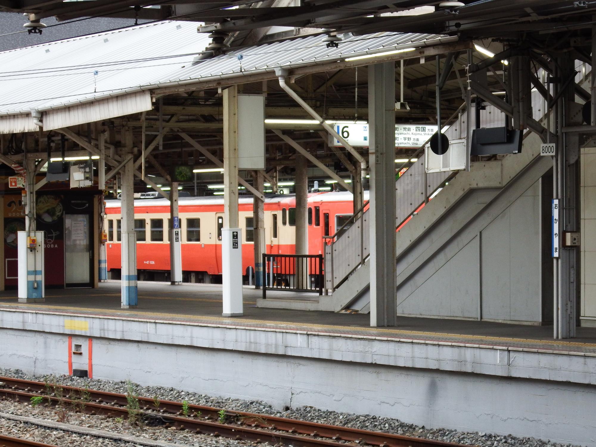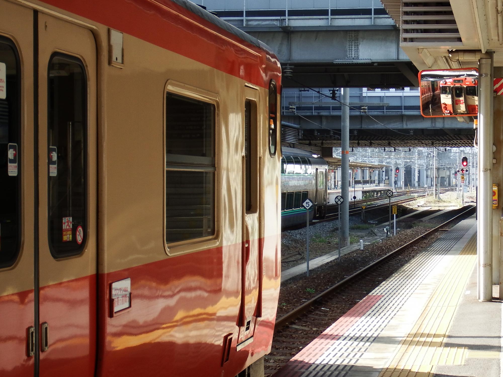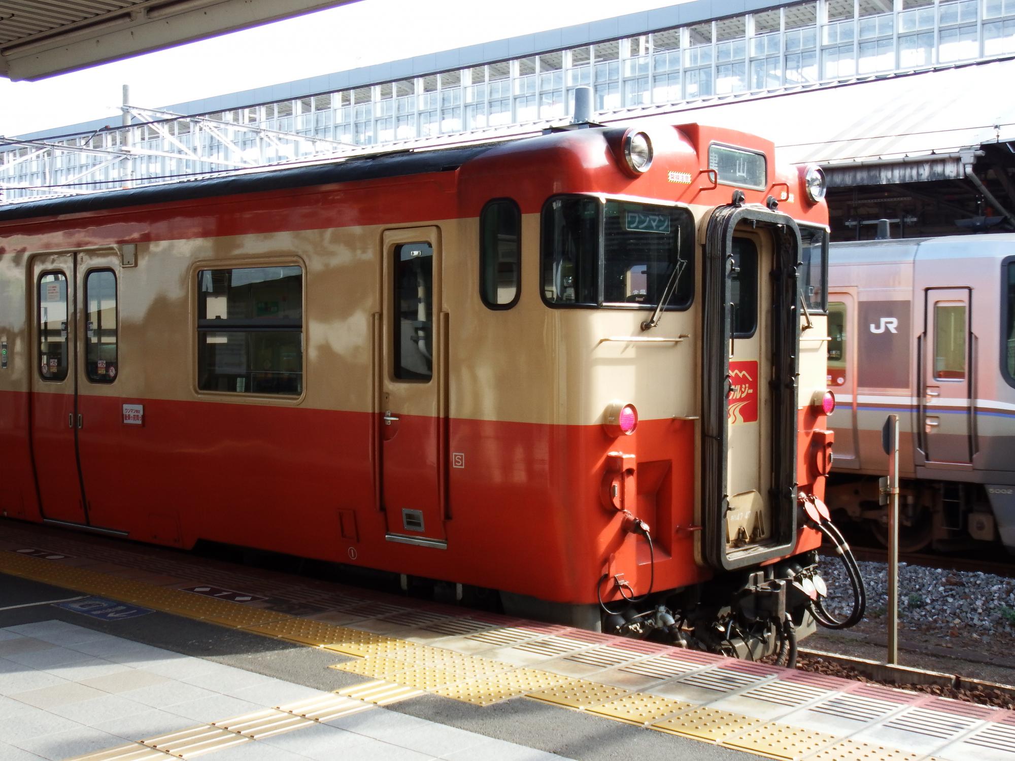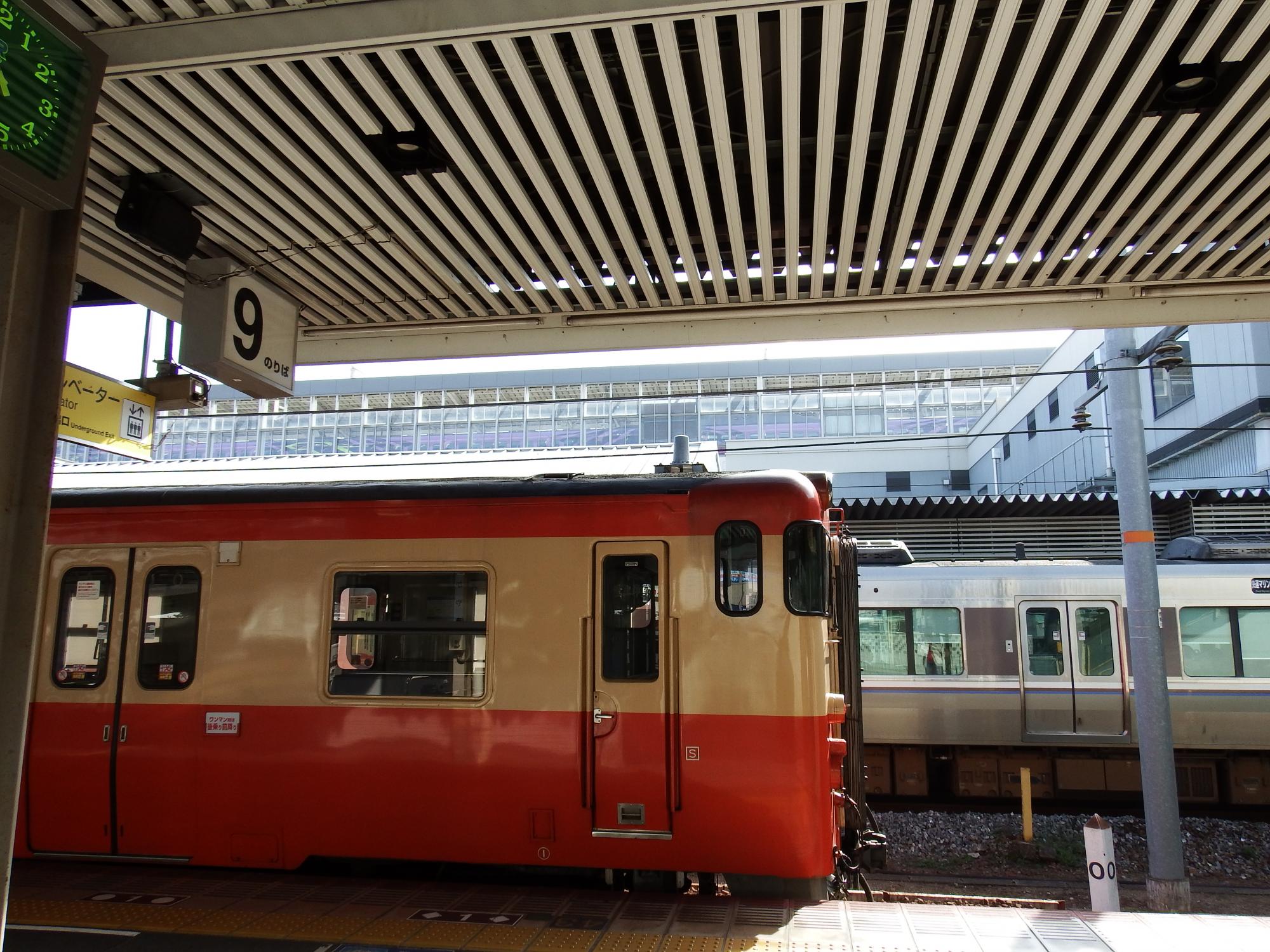 キハ47ノスタルジートレインがタラコ色と一緒の4連になって入線してきました。