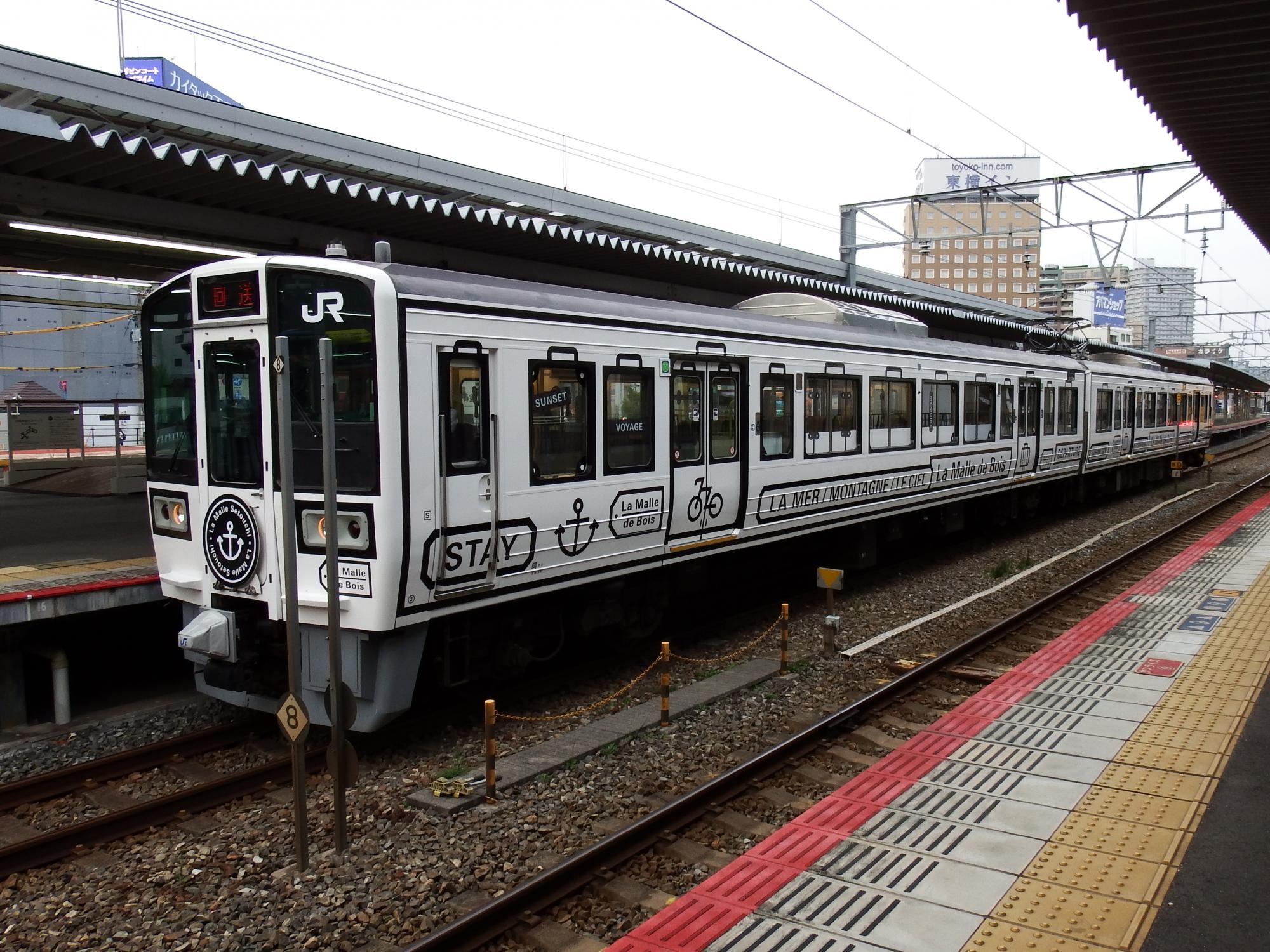 岡山から高松、宇野、尾道への観光列車として運用されています。自転車を積み込めるようになっているのですが、回送電車なのに車内に自転車が見えます。おそらく自転車はただの飾りです。薄っぺらい印象の強い企画、ツッコミどころはまだまだあるのですが、止めておきます。中国でよく見かける日本のお菓子のパチモンみたいな恥ずかしさが漂い、213系がカワイソス。