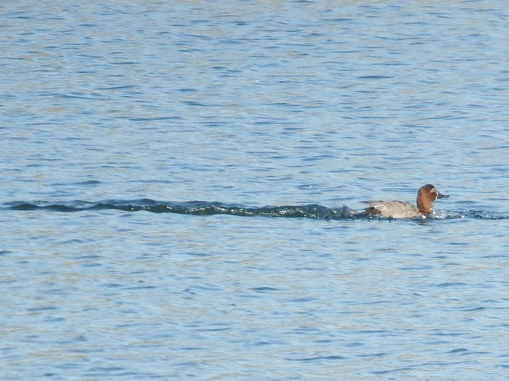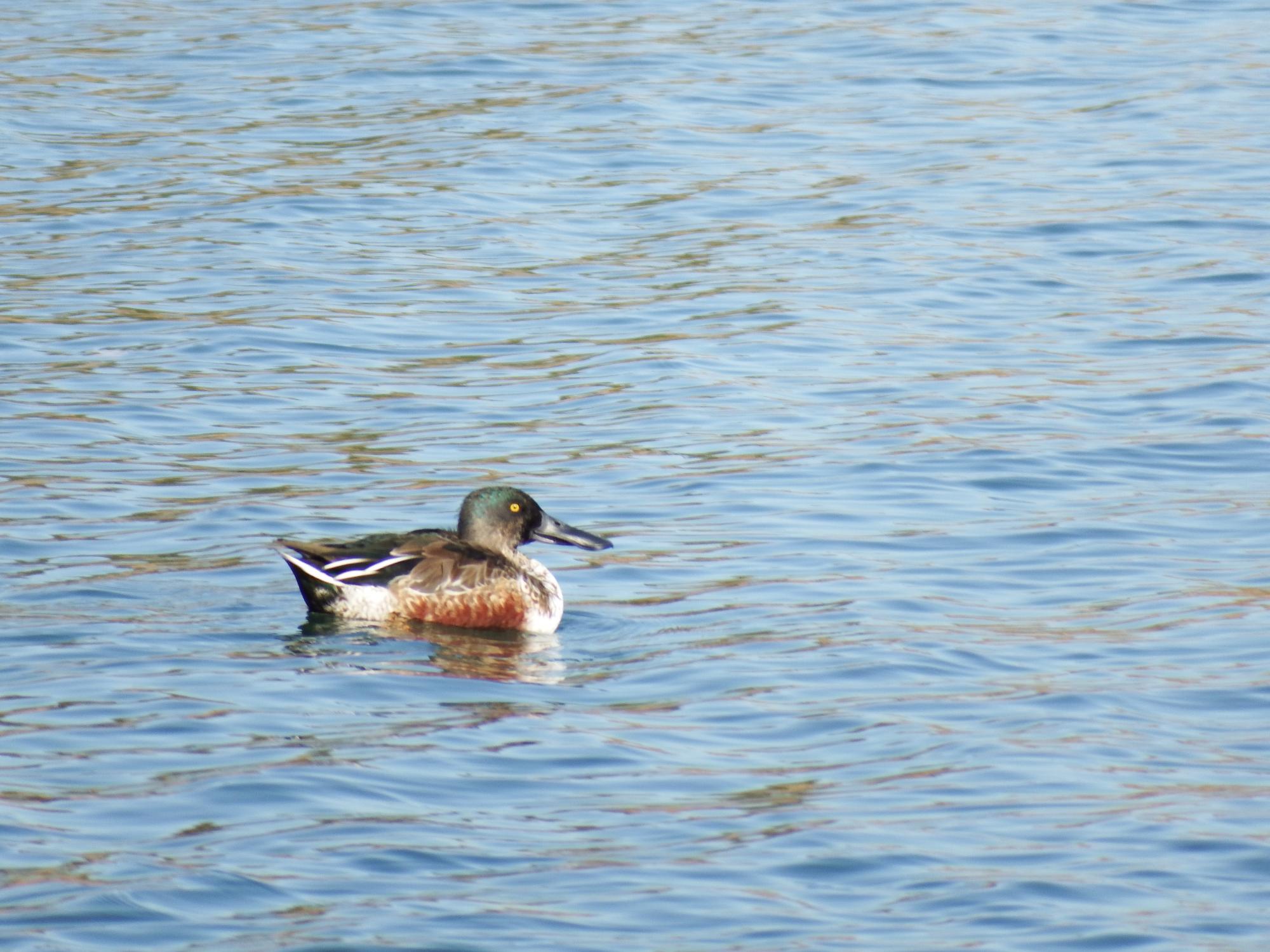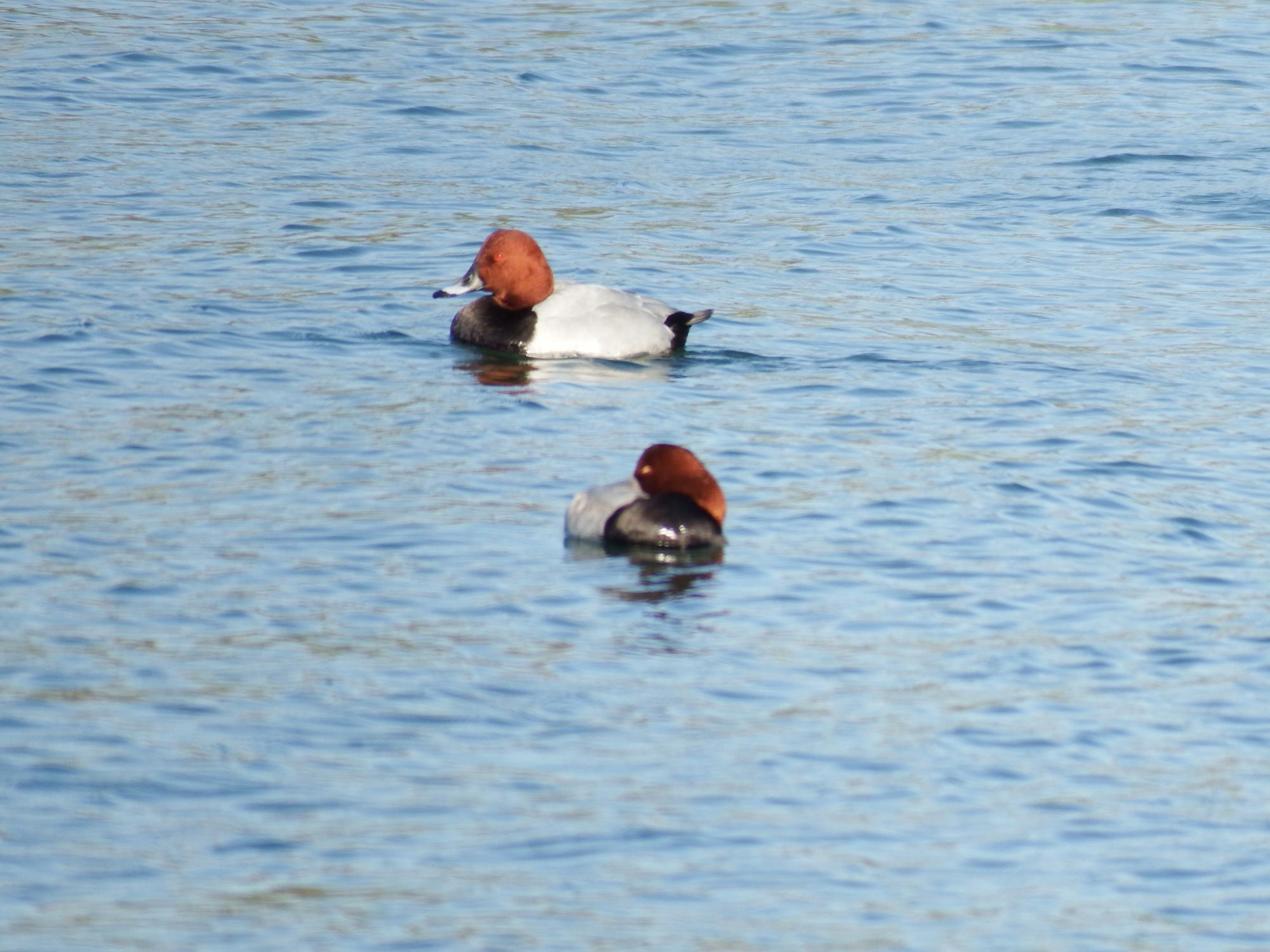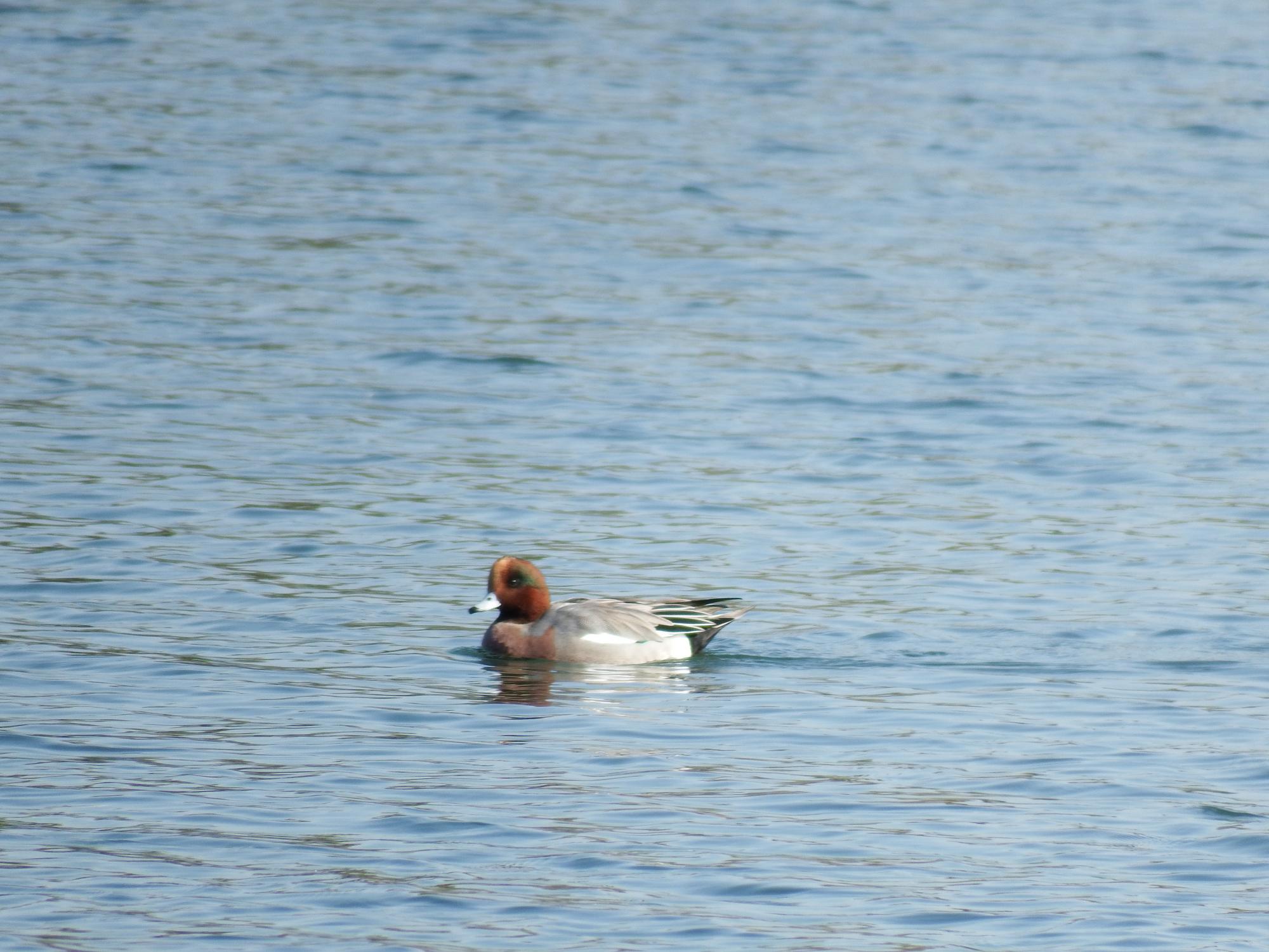 アイリングが白い、のんびり泳いでいるのはホシハジロの♀。コガモが飛んでるのも初めて見ました。