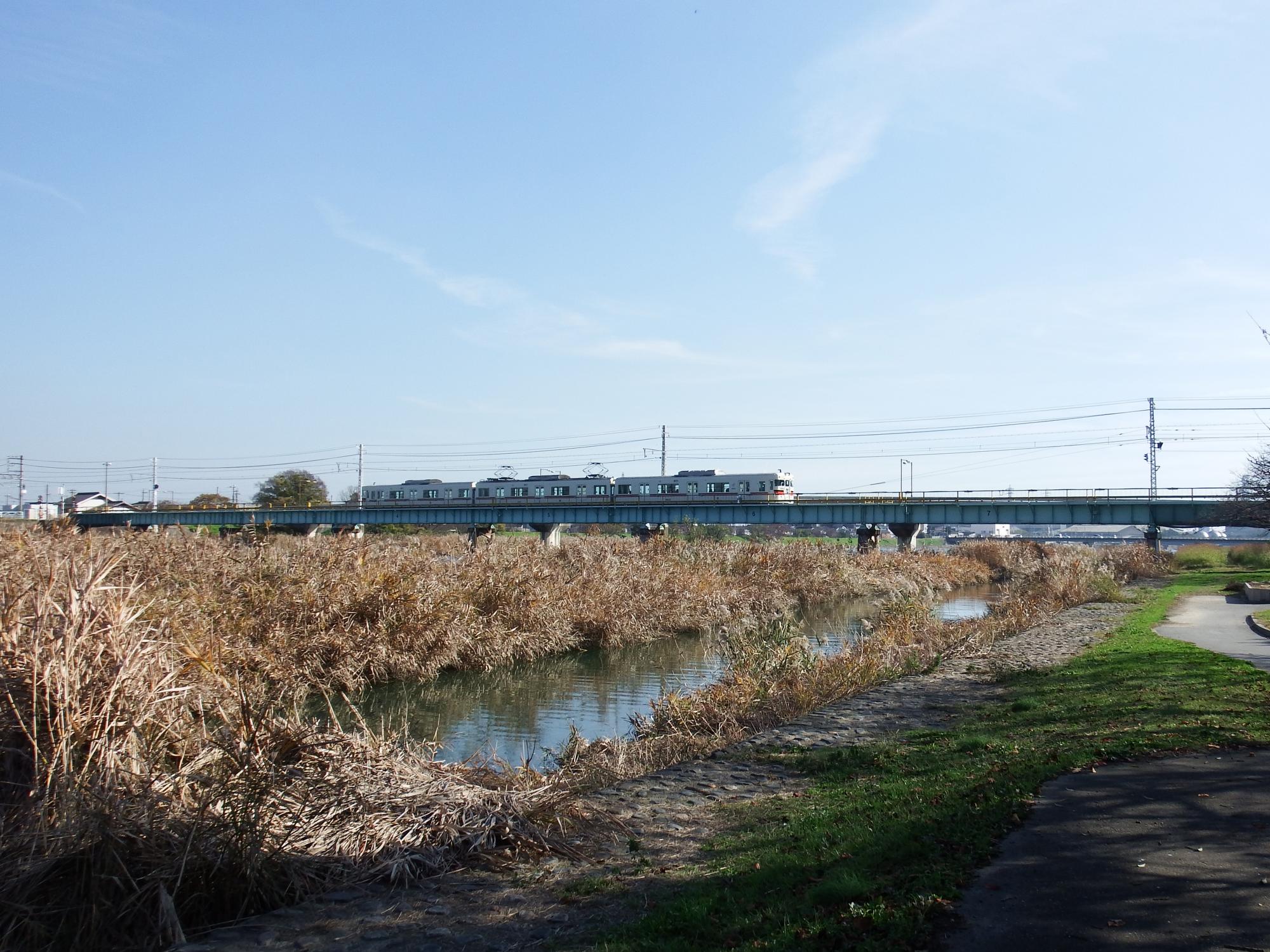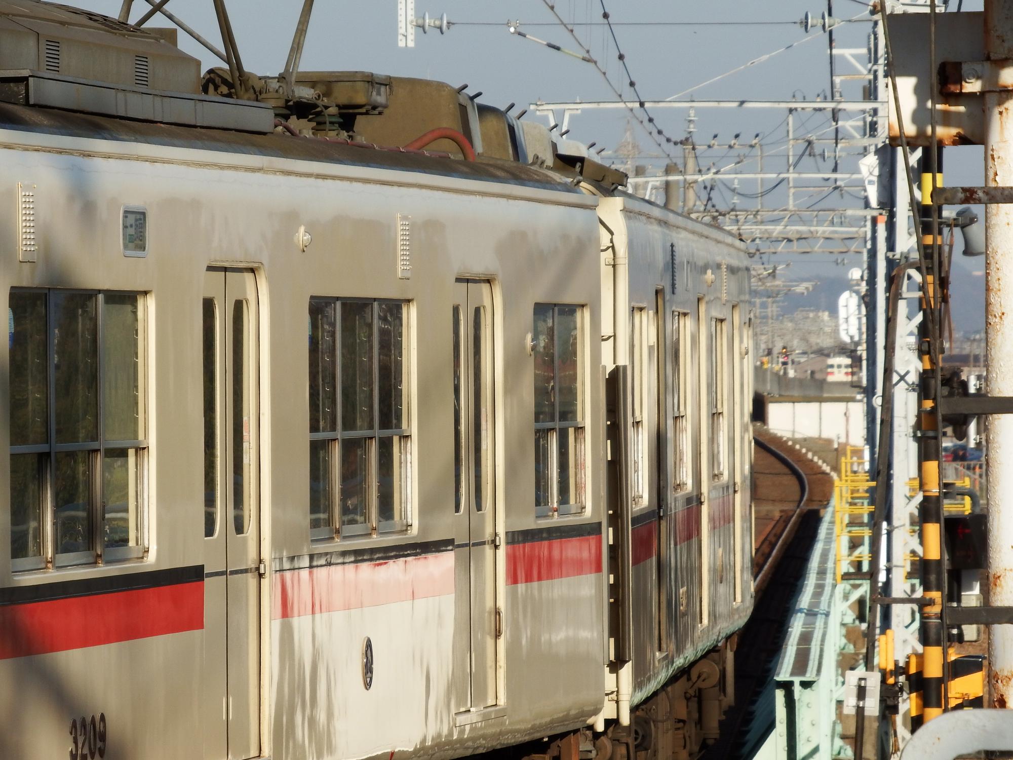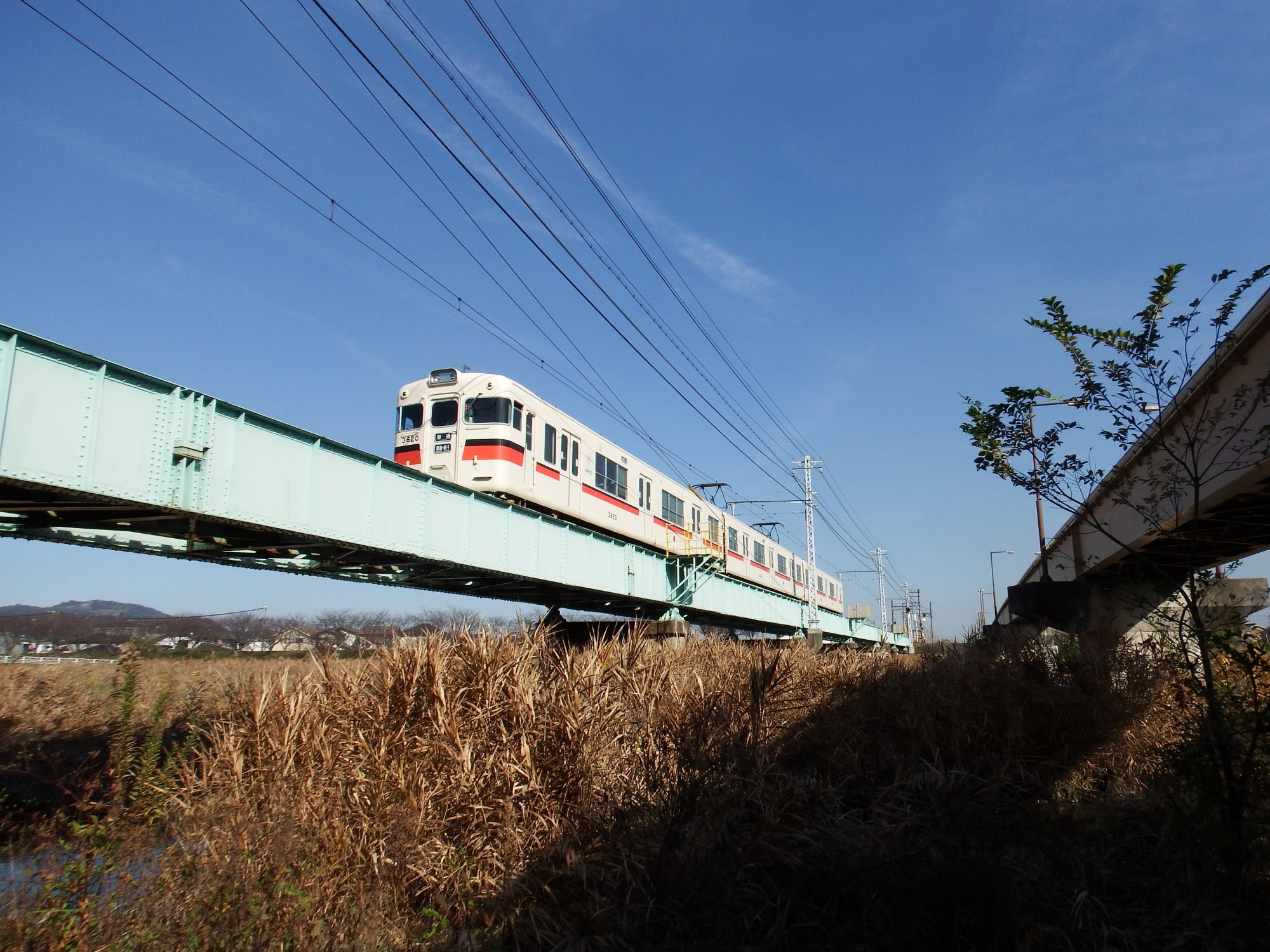 飾磨行の電車が夢前川を渡ります。向こうの方に高架上にある隣の西飾磨駅で交換待ちしている網干行電車が見えます。