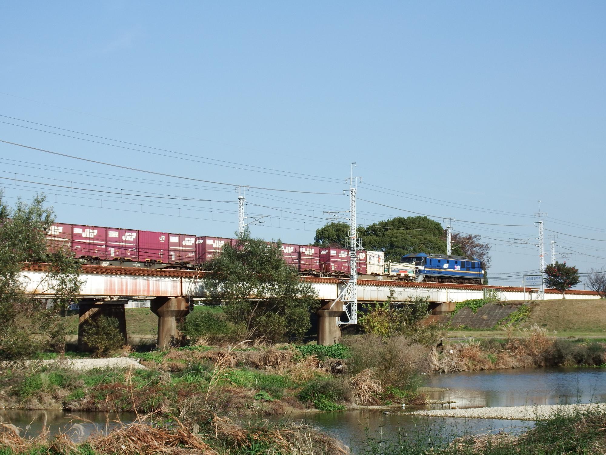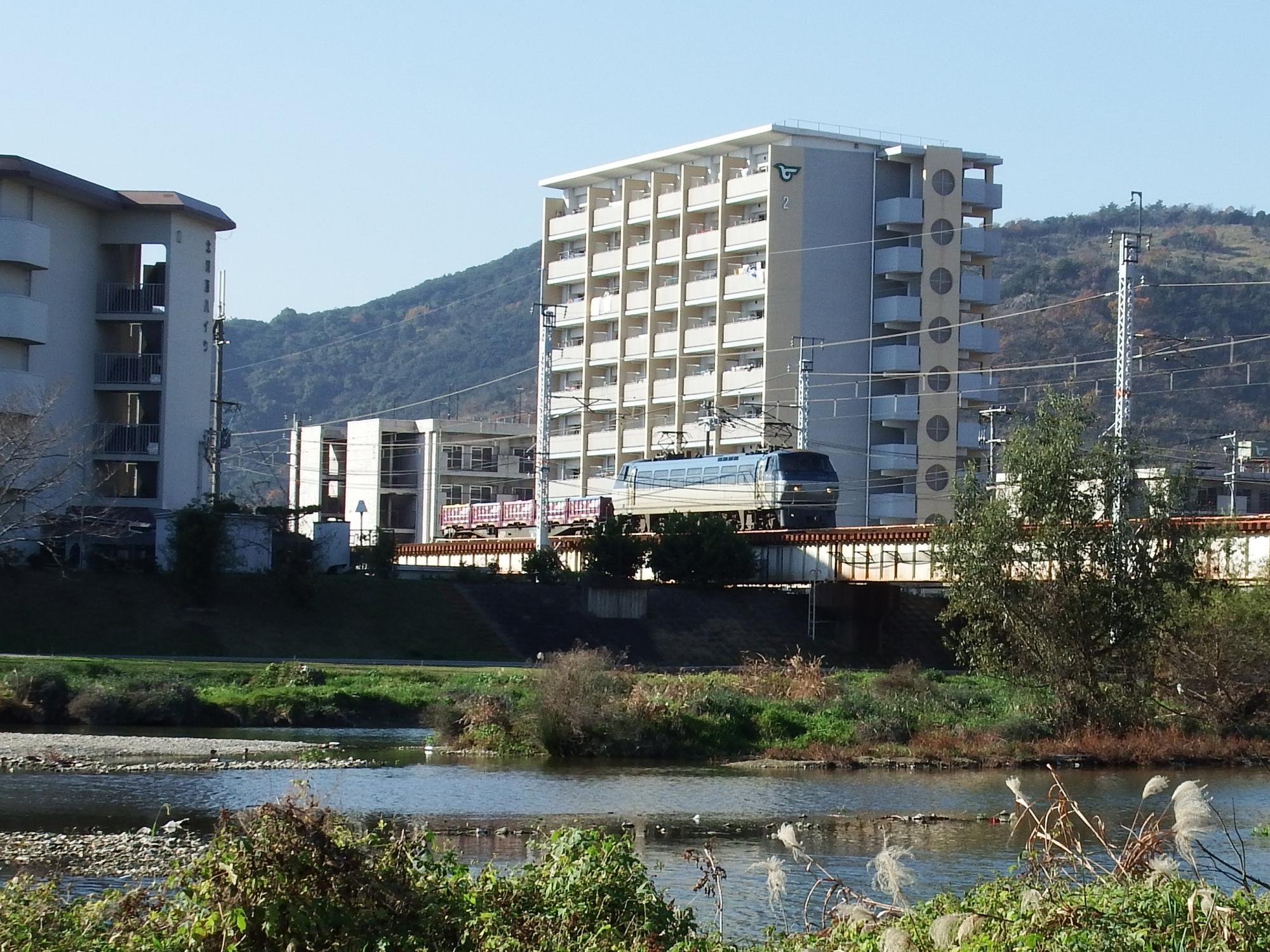 とても気持ちのいい河川敷です。1.5km程歩くと山陽本線の夢前川鉄橋、EF210がやってきました。