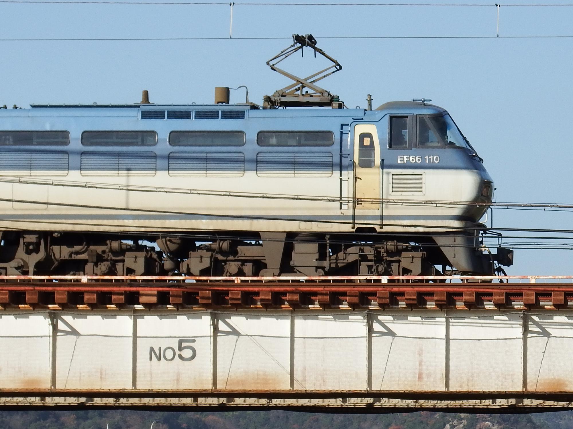 EF66改が無蓋コンテナ4つを積んだコキ1両だけを牽引してきました。ZM8A形コンテナで鉄道車両の車軸運搬用らしいです。横顔カッコいいです。