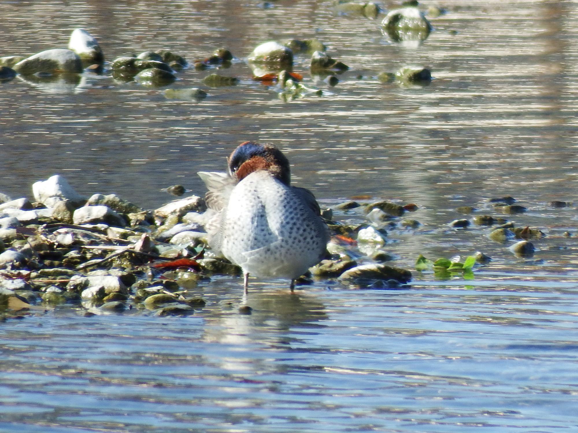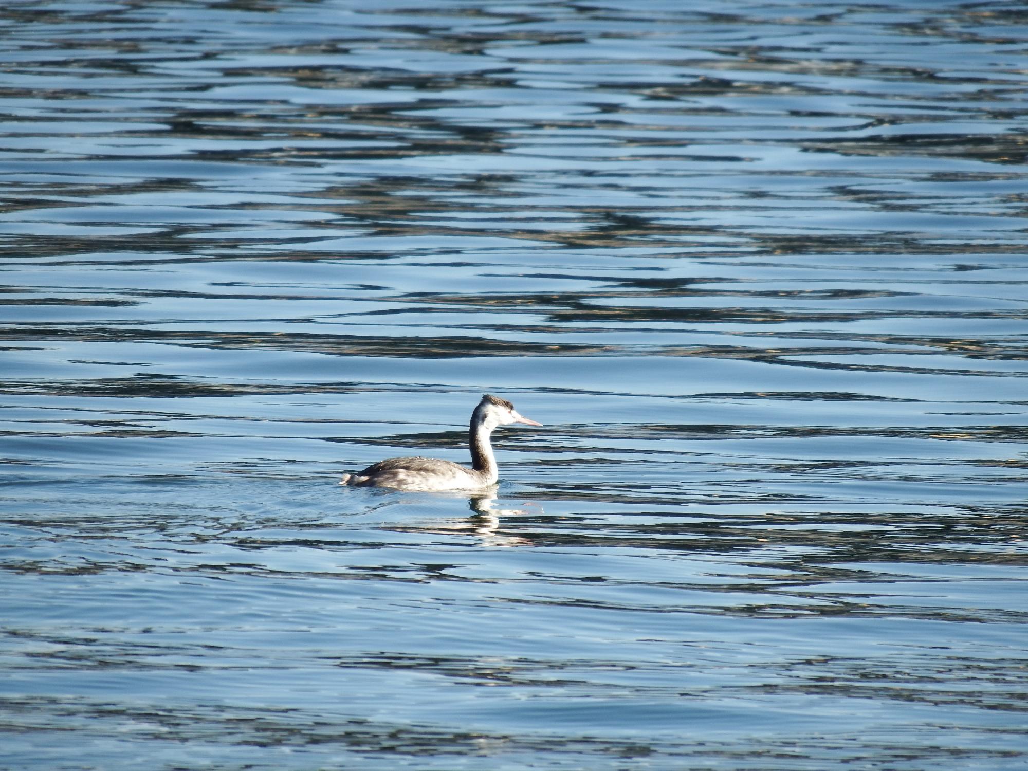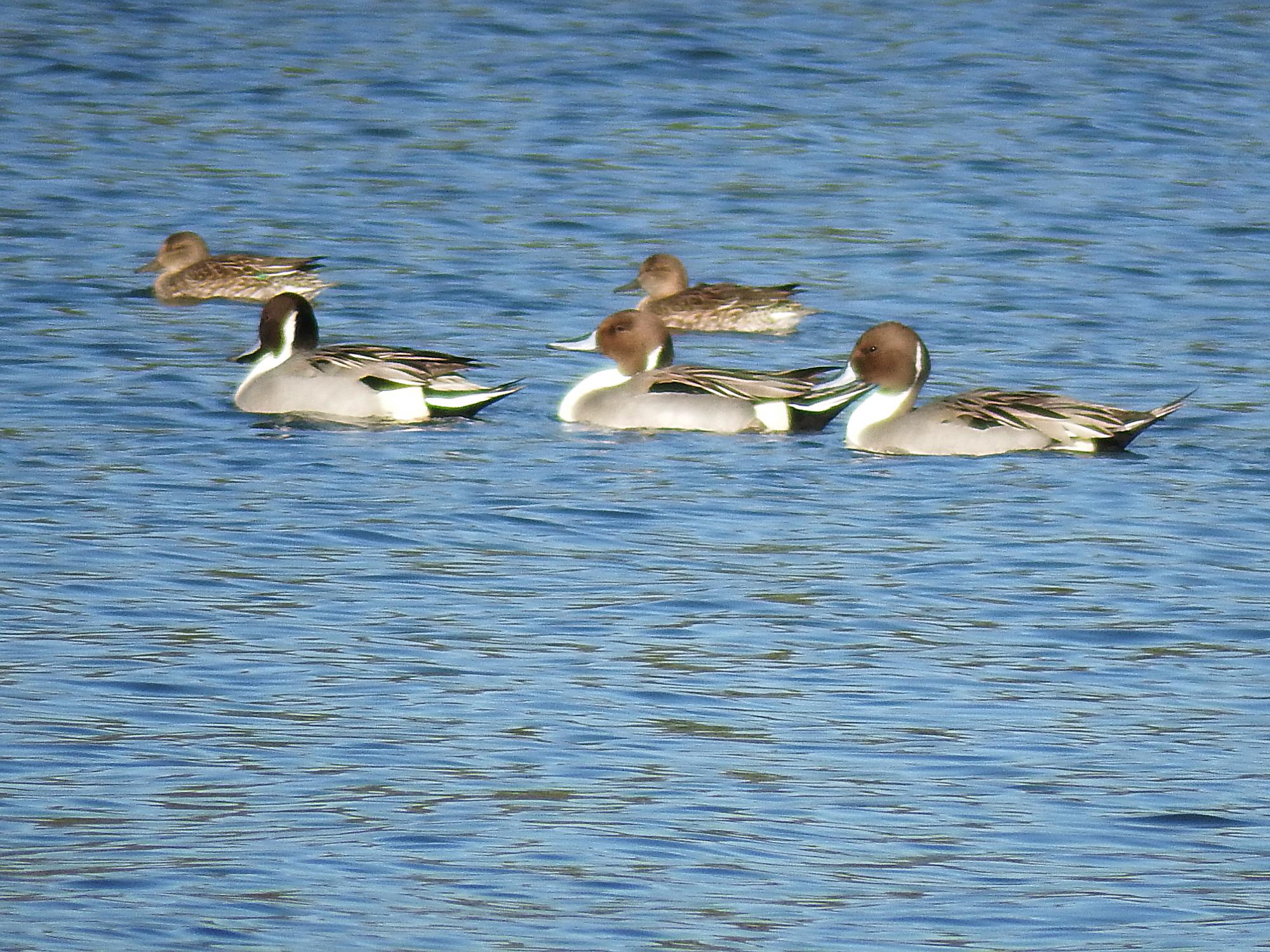 右岸へ戻ります。西浜橋から見えたカモ、ホシハジロ、オナガガモ、コガモ、カンムリカイツブリ、と色々いました。