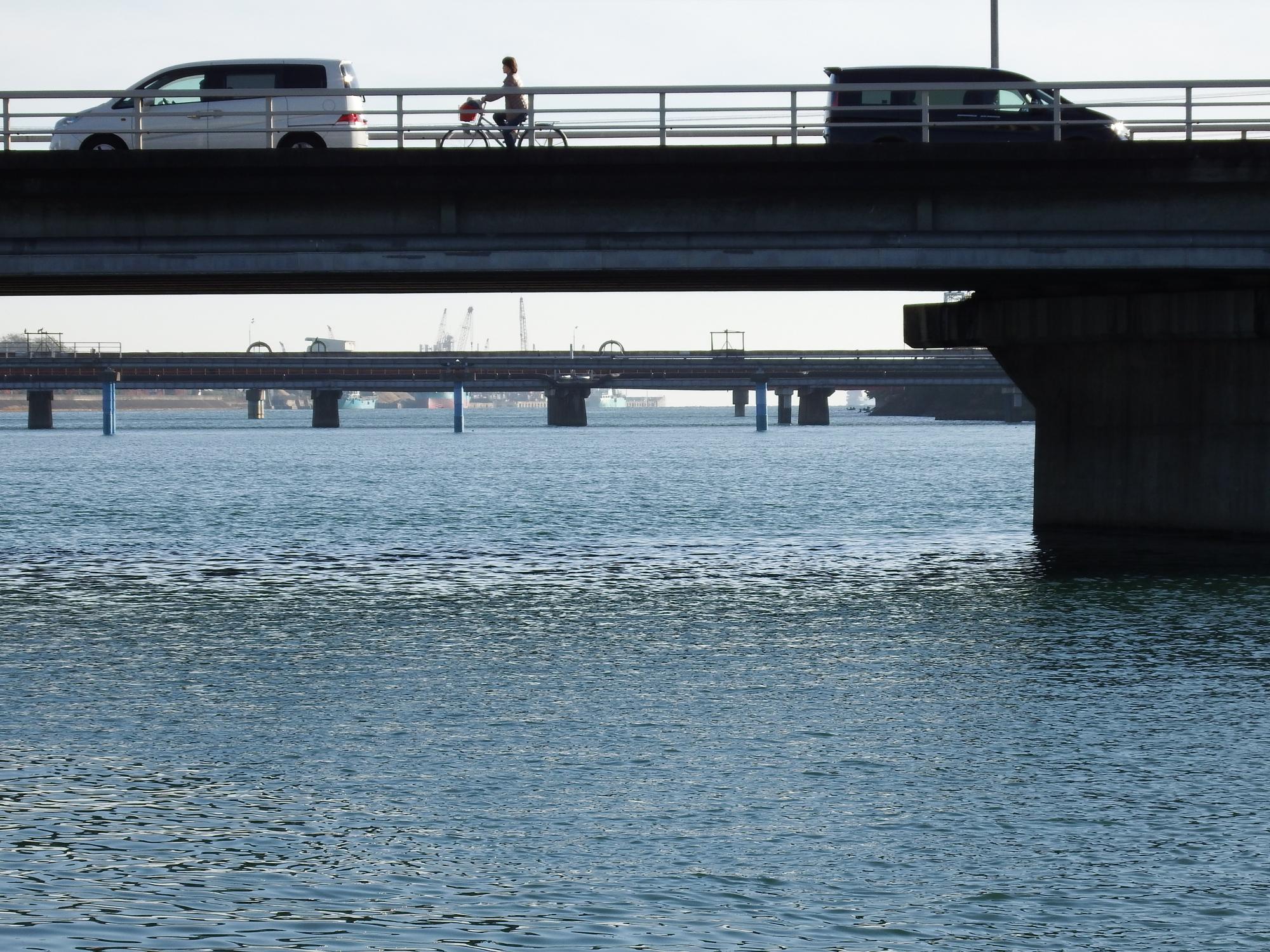 交通量の多い国道250号線の西浜橋の橋の南側は海岸まで新日鉄住金広畑製鐵所、橋の下から河口が見えます。