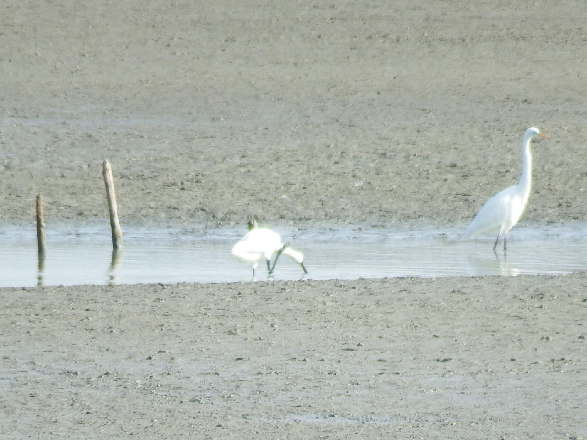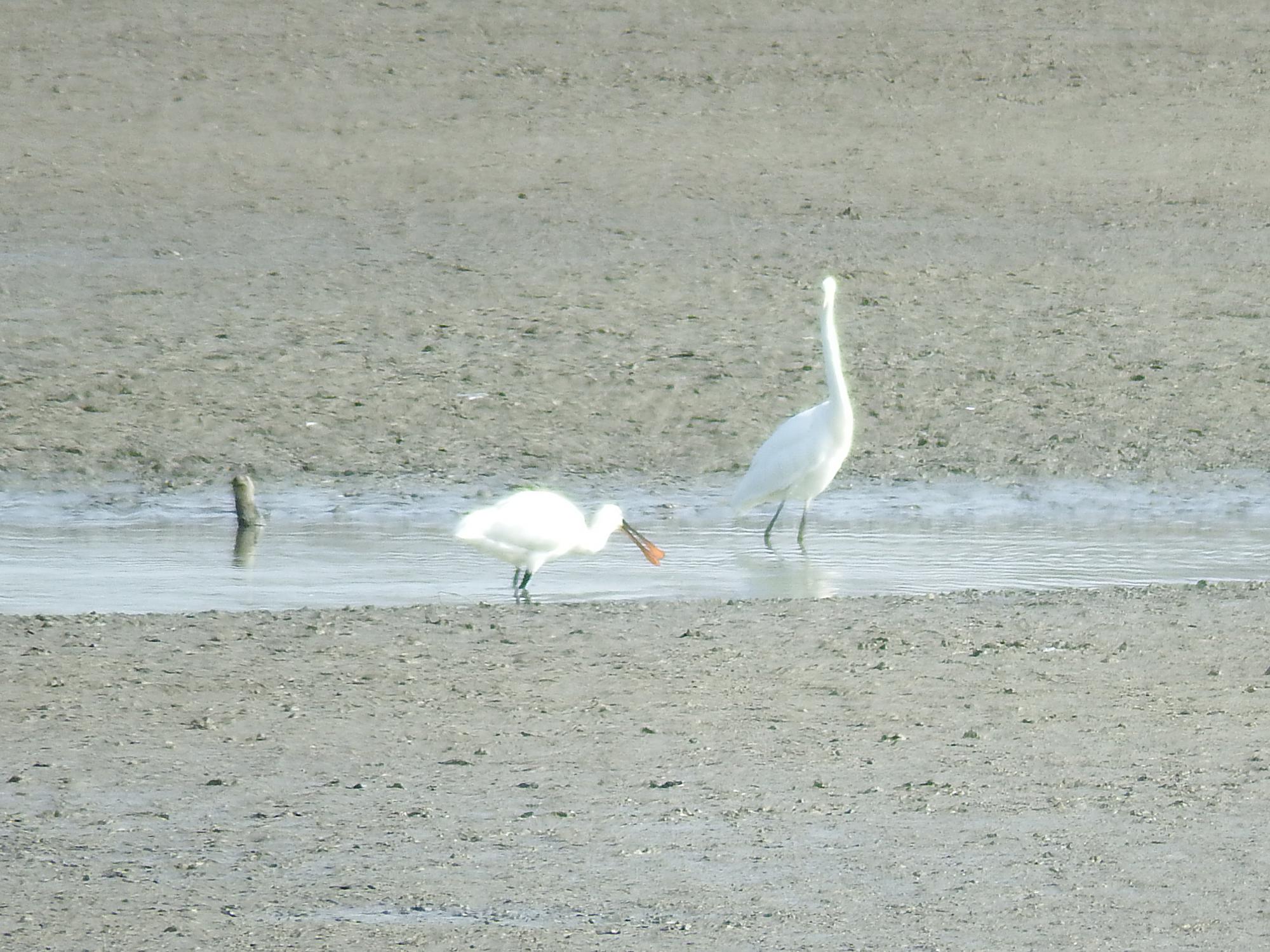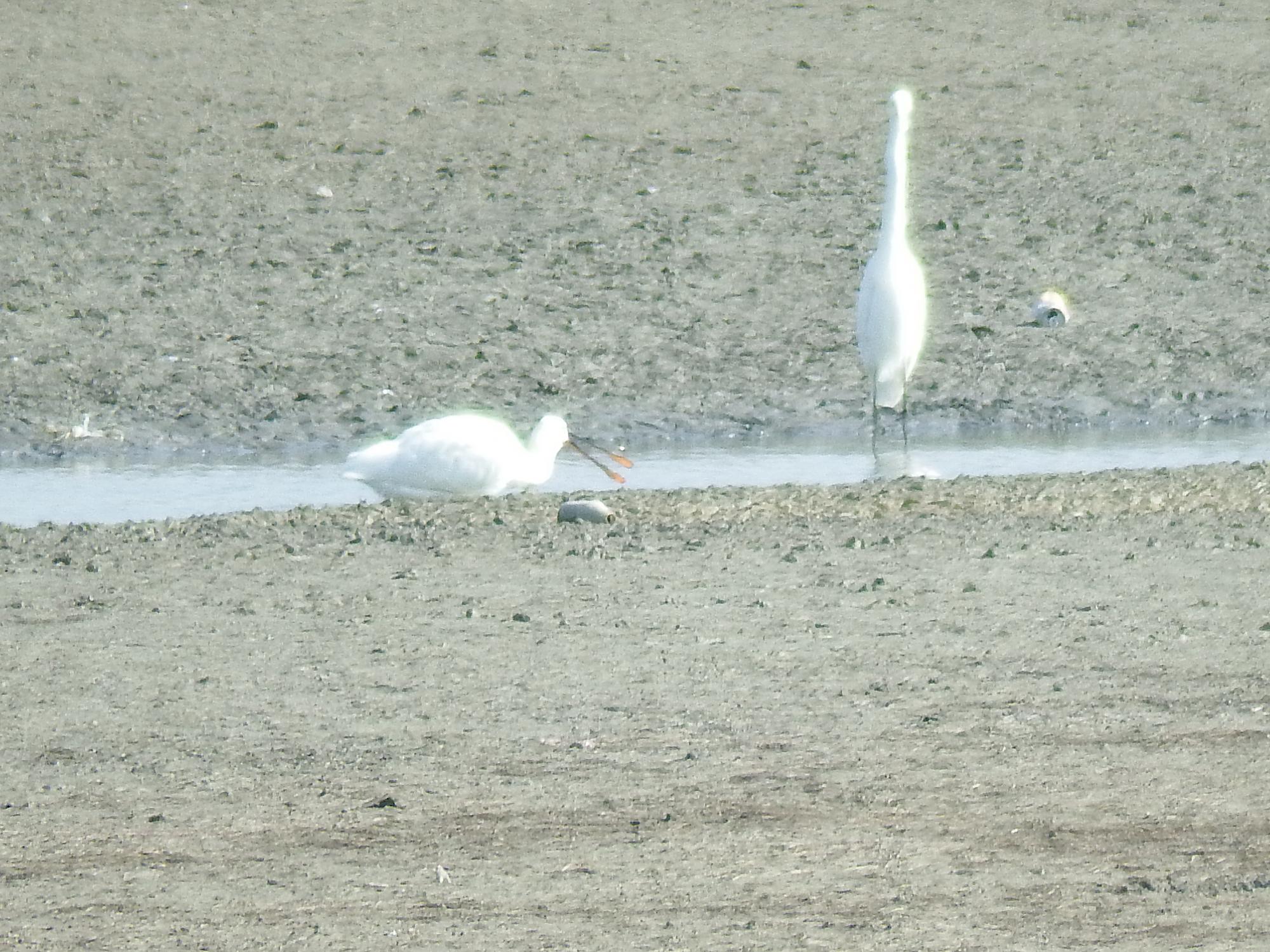 ダイサギたちの中に1羽ヘラサギを発見、初見です。