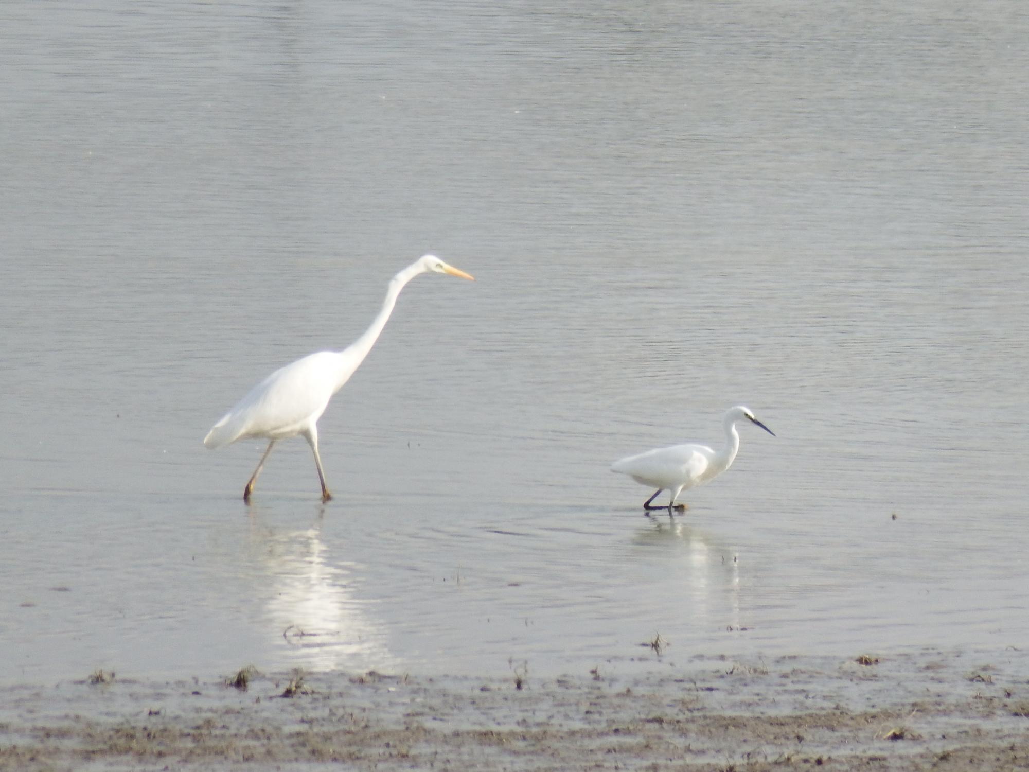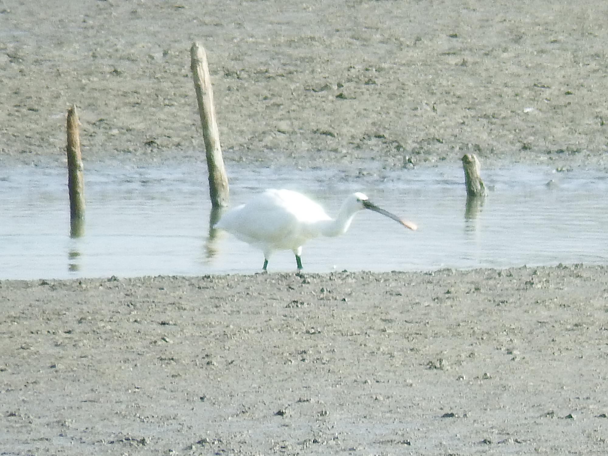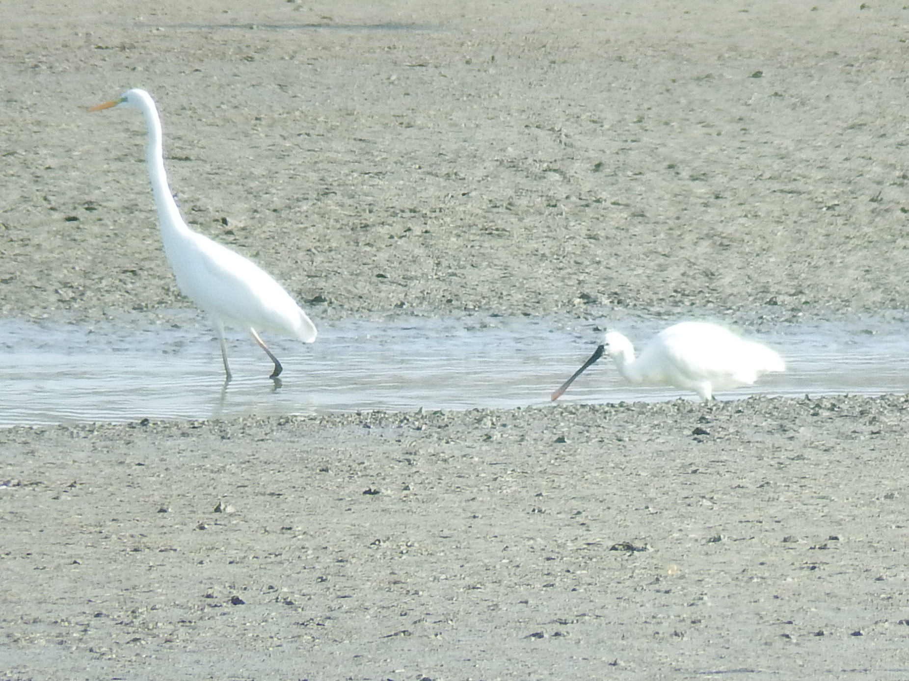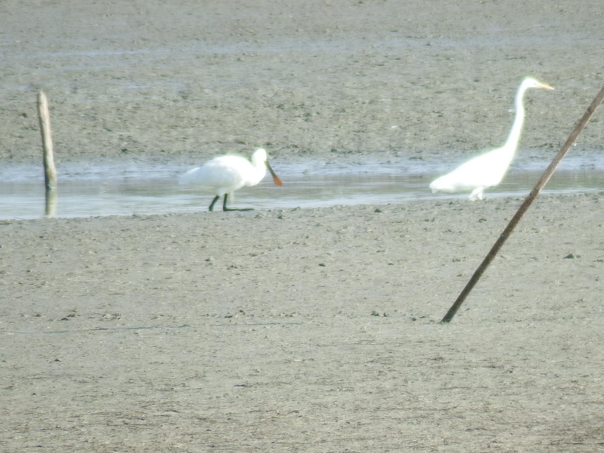 ダイサギたちの中に1羽ヘラサギを発見、初見です。