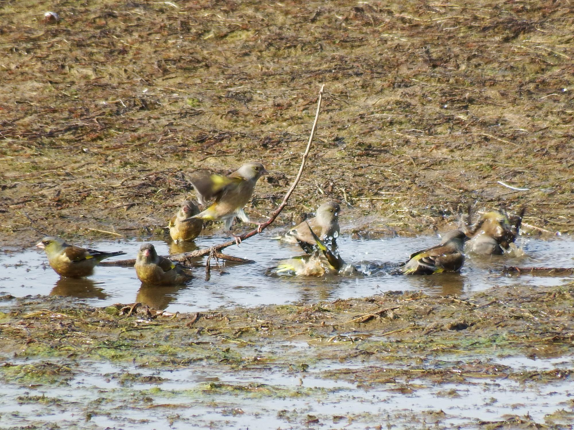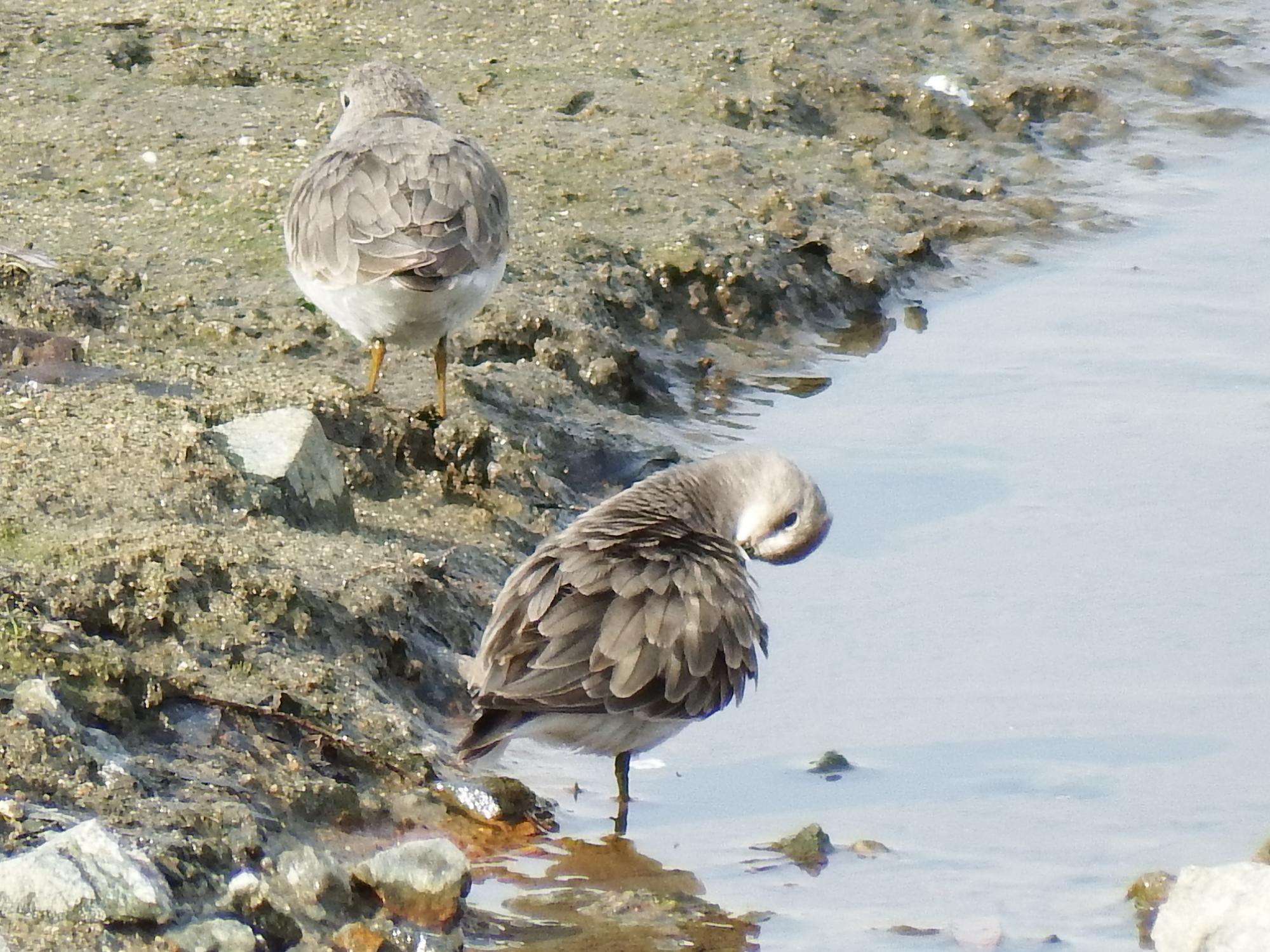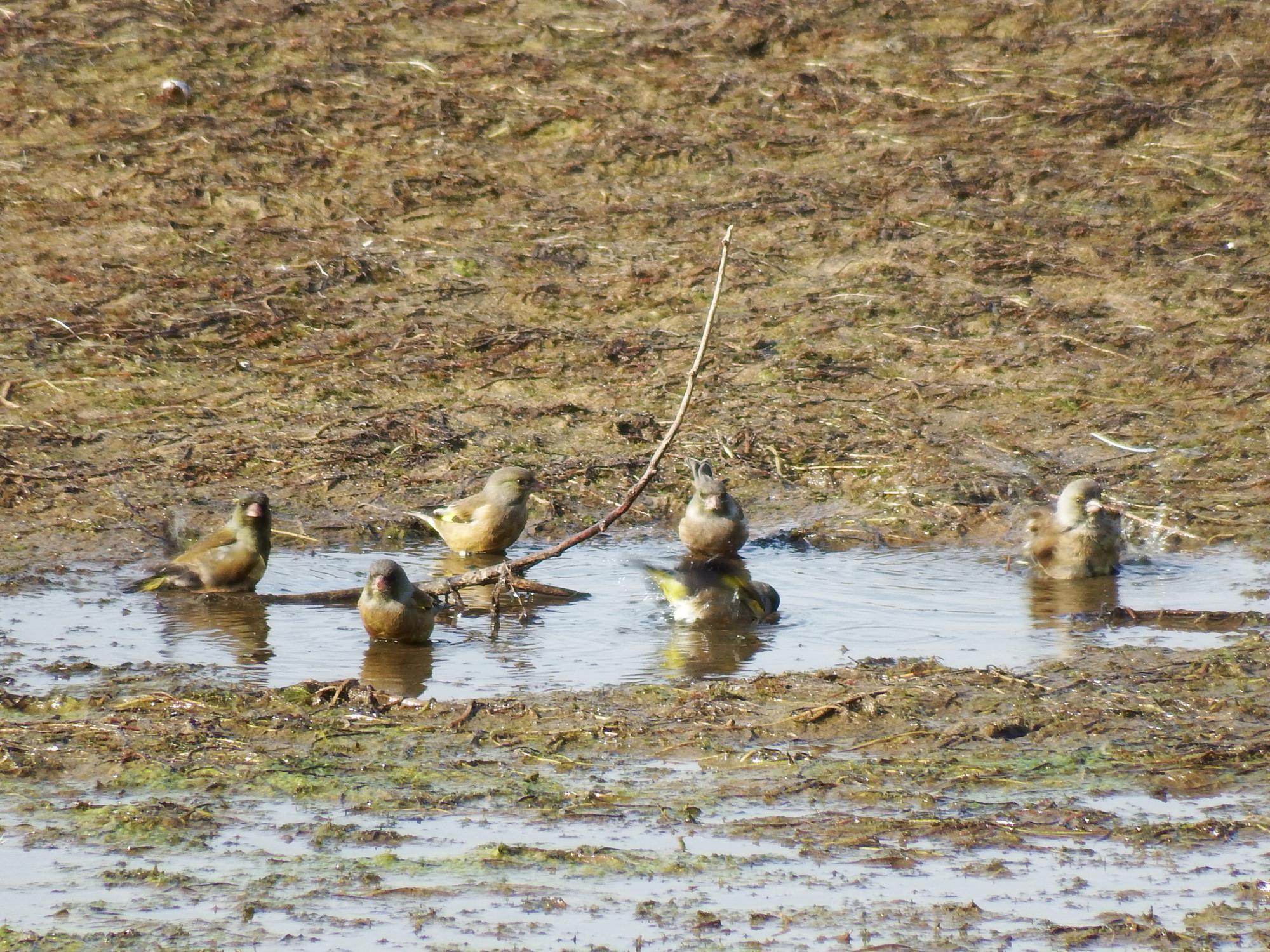 細いクリークのこちら側、自分の足元あたりからチョロチョロと水が流れ込んでいます。警戒心ゼロでのんびり寛いでいる鳥たちです。