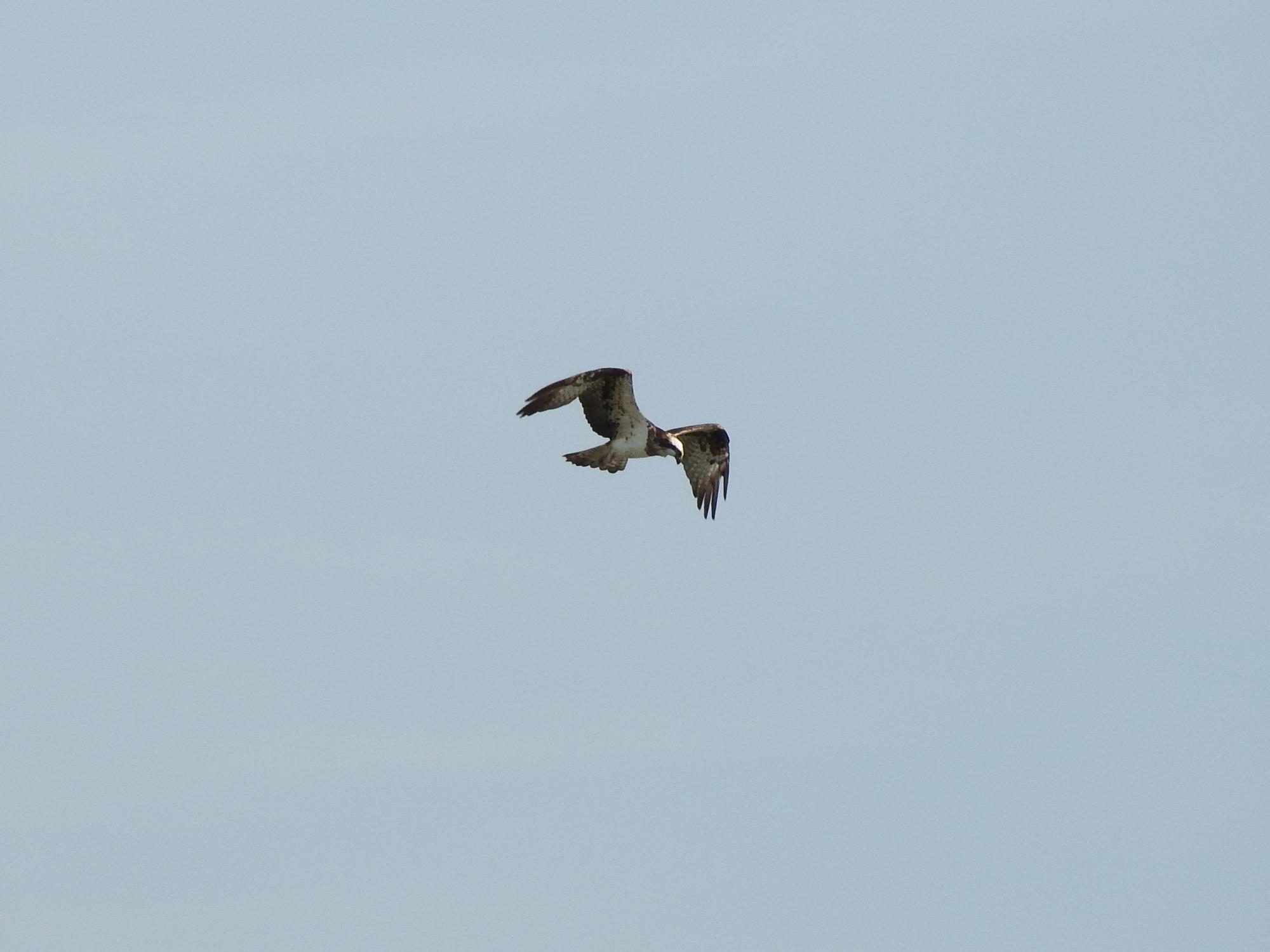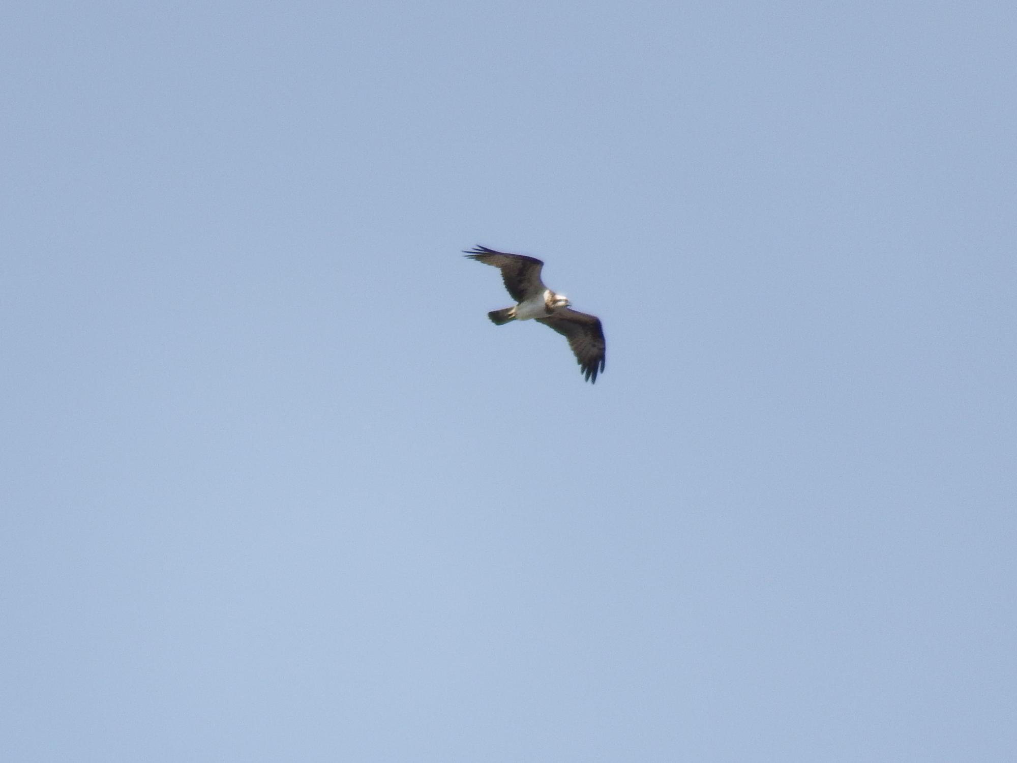 池を1周して帰りかけたら、ミサゴが滑空してきました。水たまりの上空で旋回、上空から獲物を探しています。