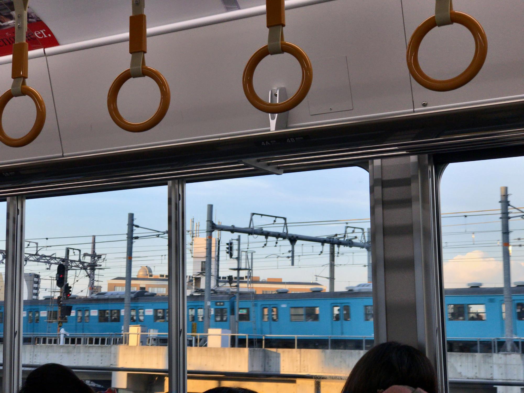 ドア脇に立った人の背中がロングシート端の人の頭に当たらないようにするボードが取り付けられていて、黄色いつり革も長さが3種類。久米田駅で下りると205系同士の行き違い。
