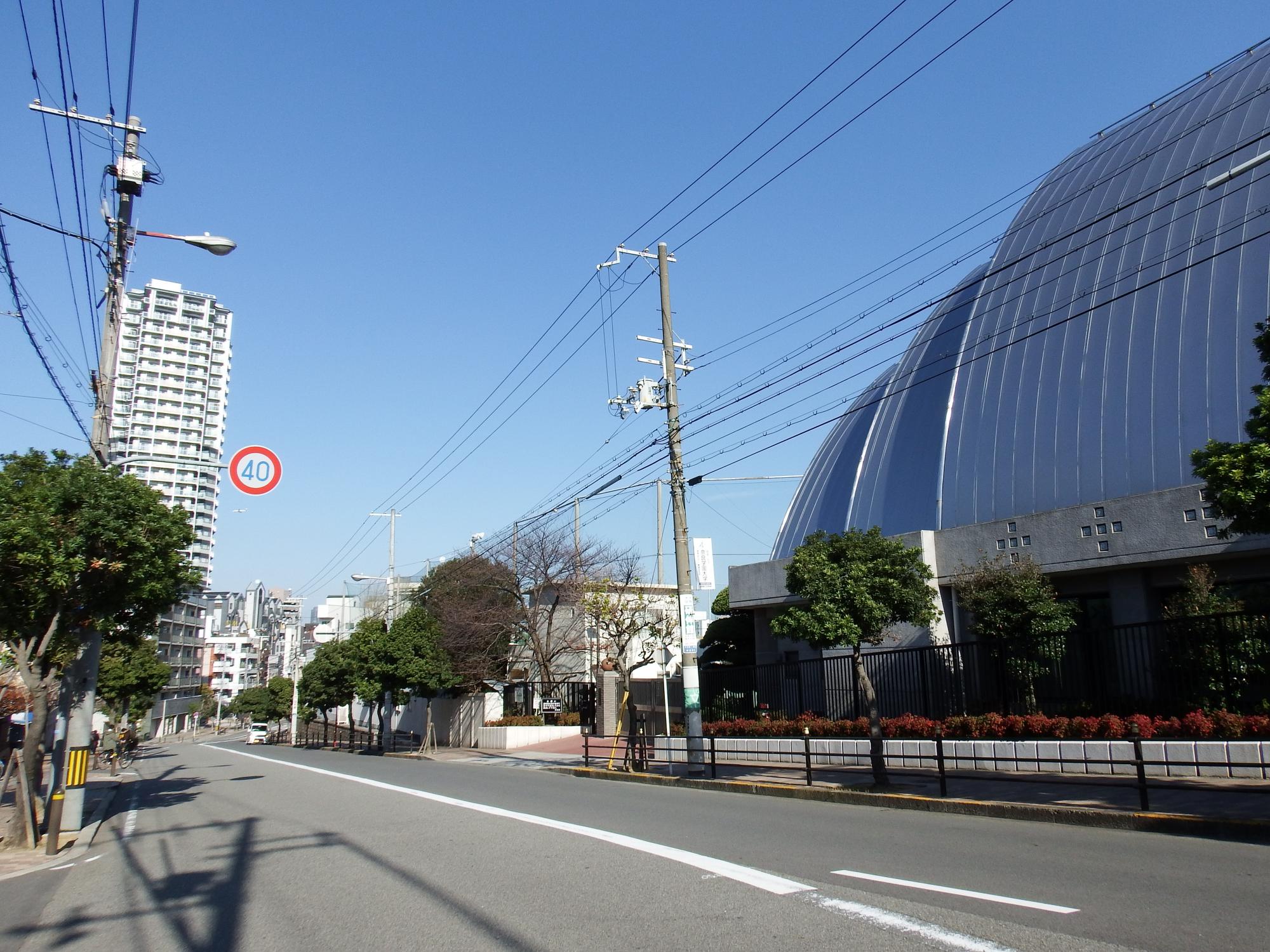 向こうはブラタモリでタモリさんが屋上へ上っていたタワマン。この南側に府立高津高校があります。当時から制服もない自由な校風の学校で、羨ましくてならなかった記憶が生々しいです。
