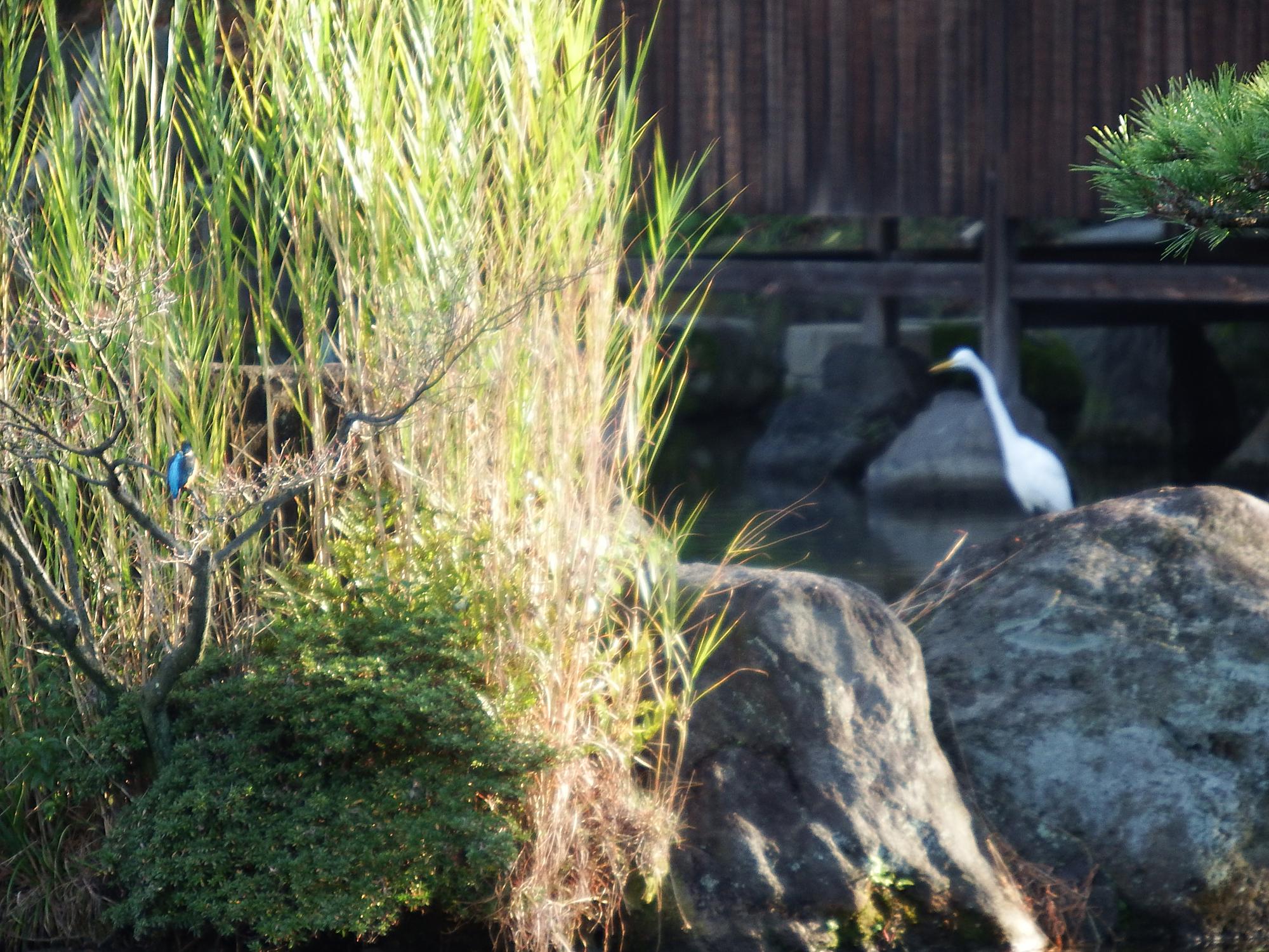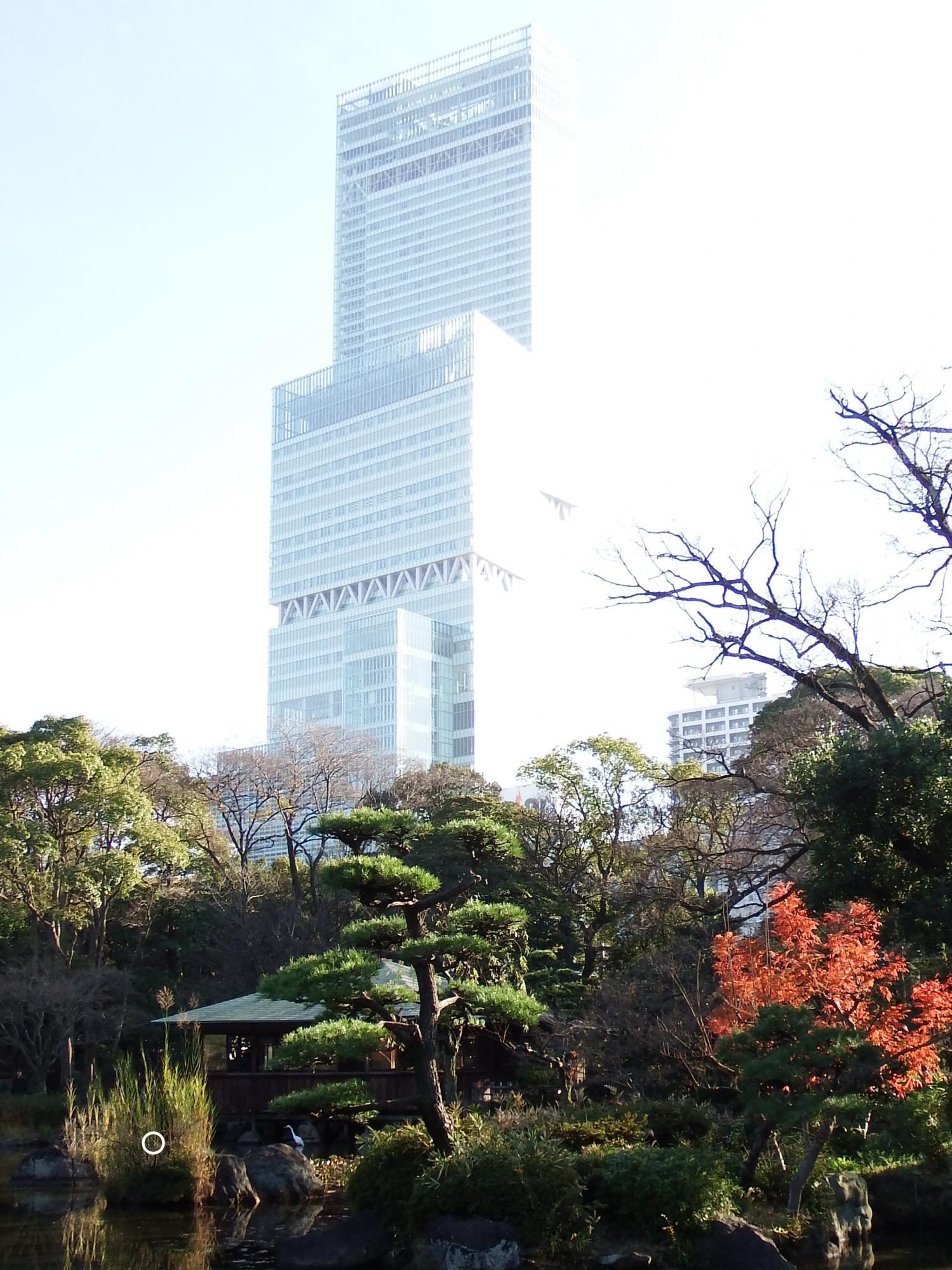 無理くりでハルカスを背景に、左下の丸印がカワセミです。東屋の手前にはダイサギ、池にいた鳥はこの2羽だけ。