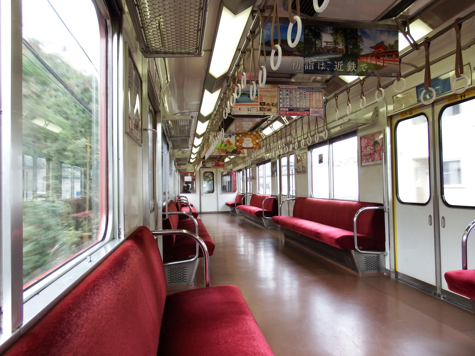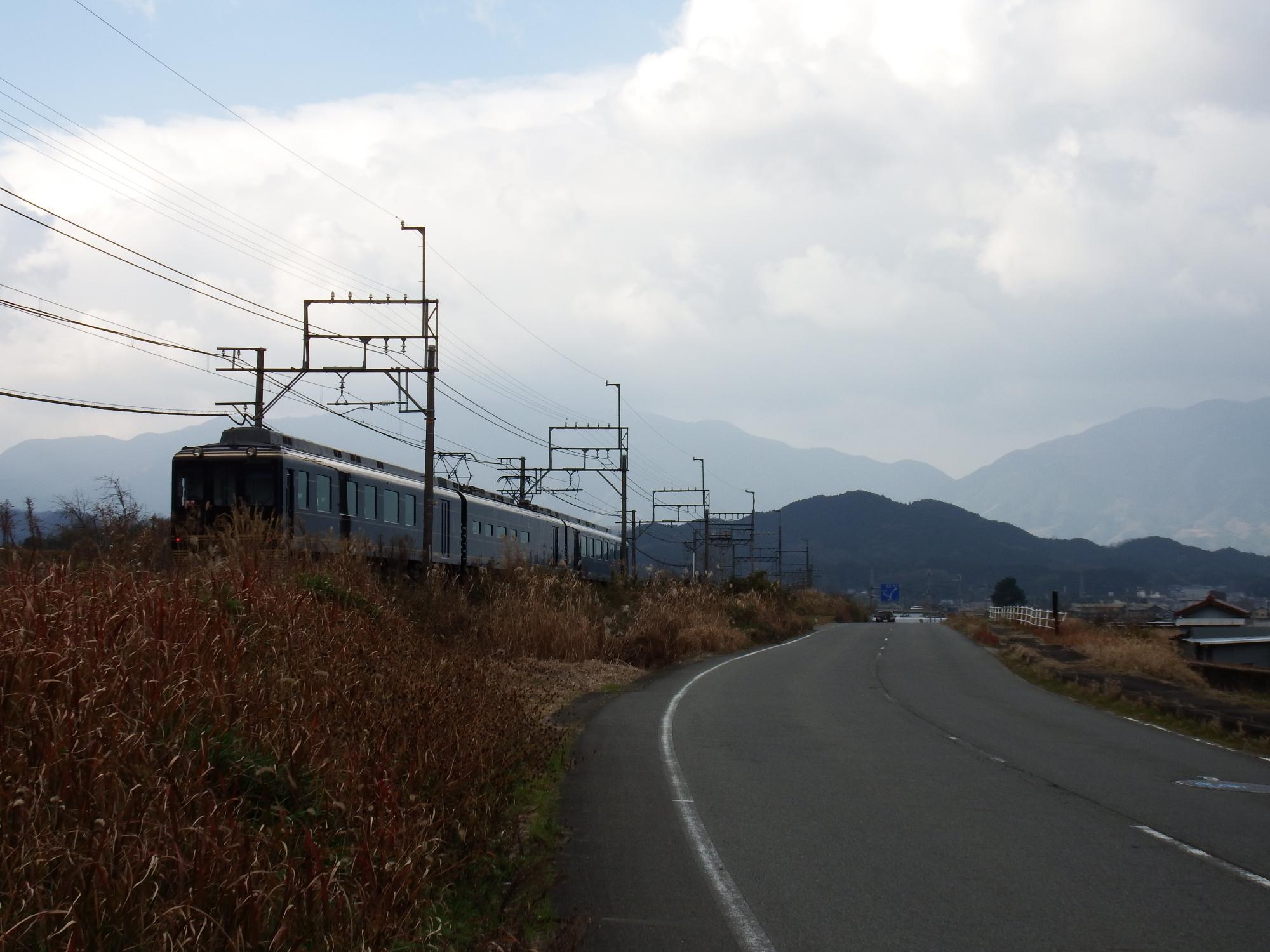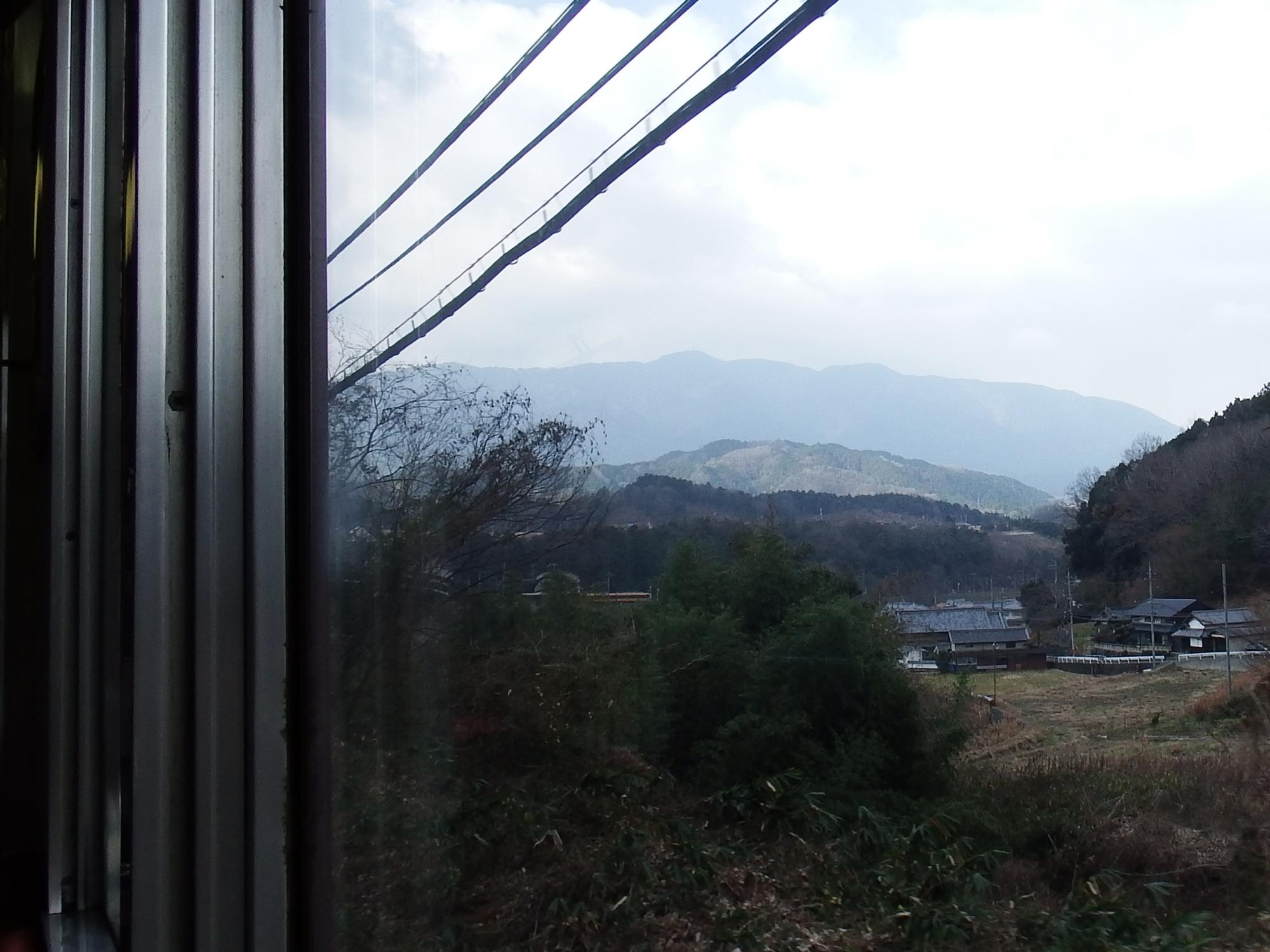福神駅付近から大和葛城山の車窓、特急電車がチラッと見えます。下市口で他の人たちが下車して、前後の車両には何人か乗っているのに3両目は自分ひとりになりました。