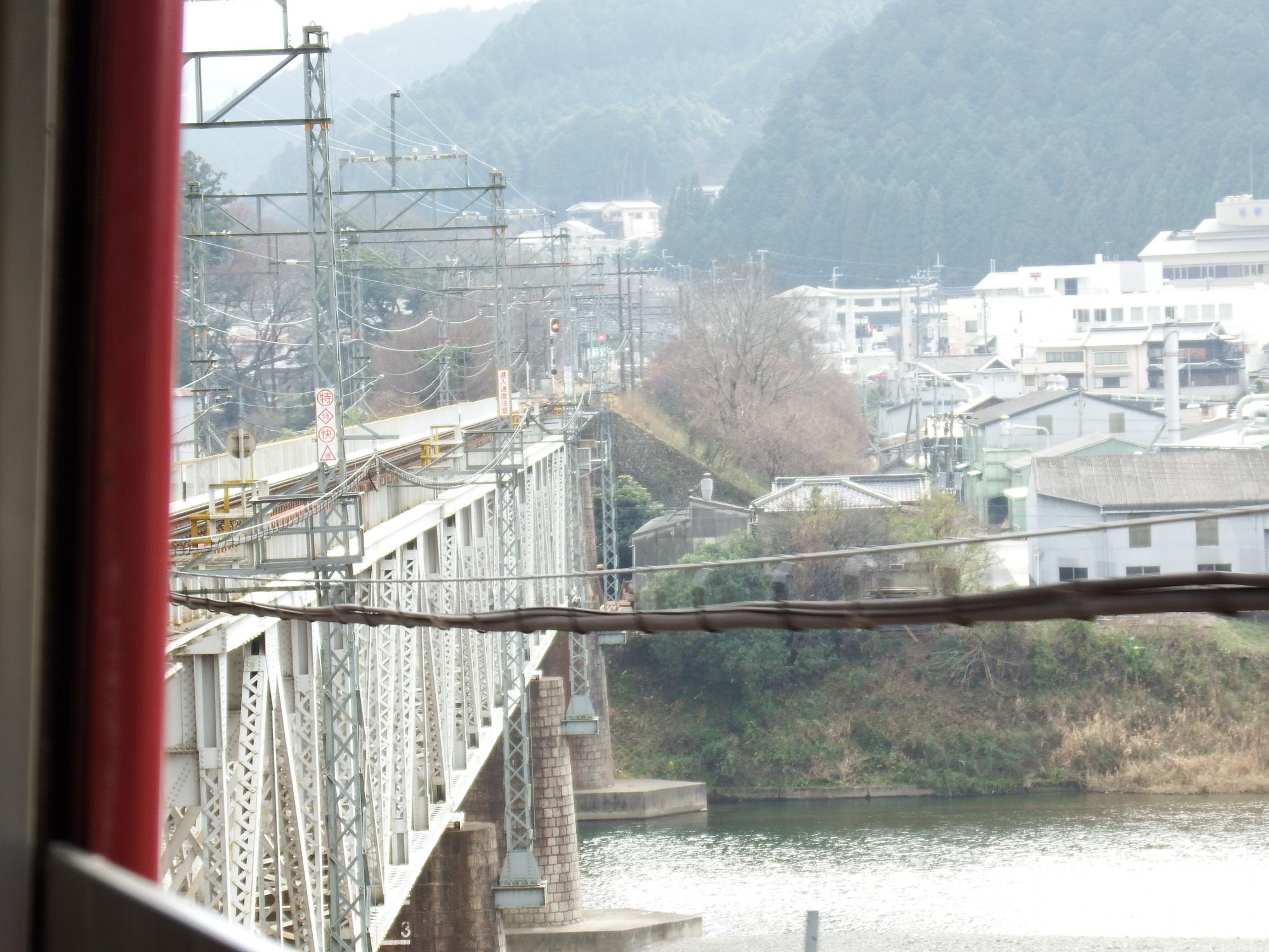 六田車庫の電車を眺め、吉野川鉄橋を渡ります。トロッコ列車に乗っているみたいでめっちゃ楽しい!