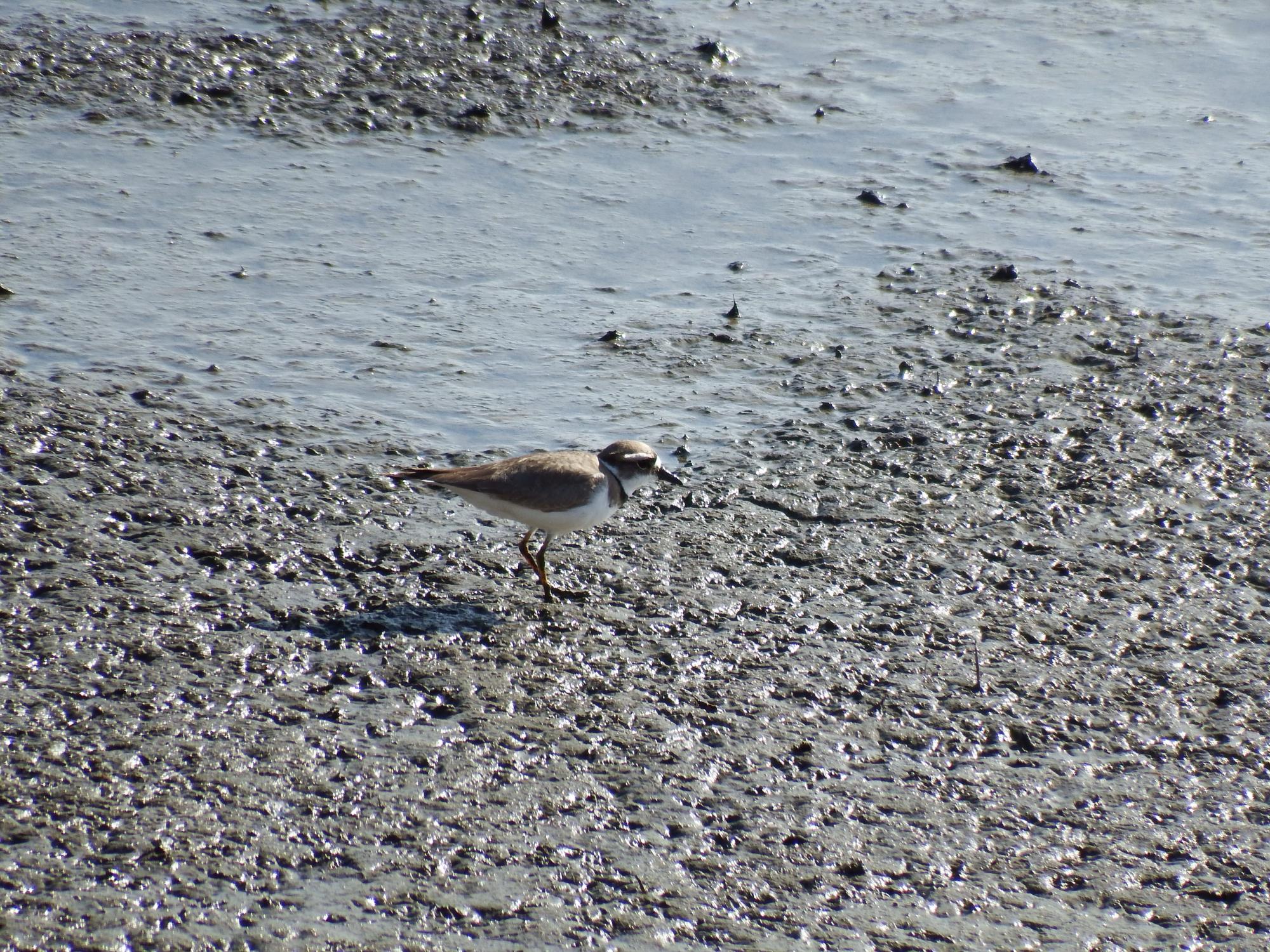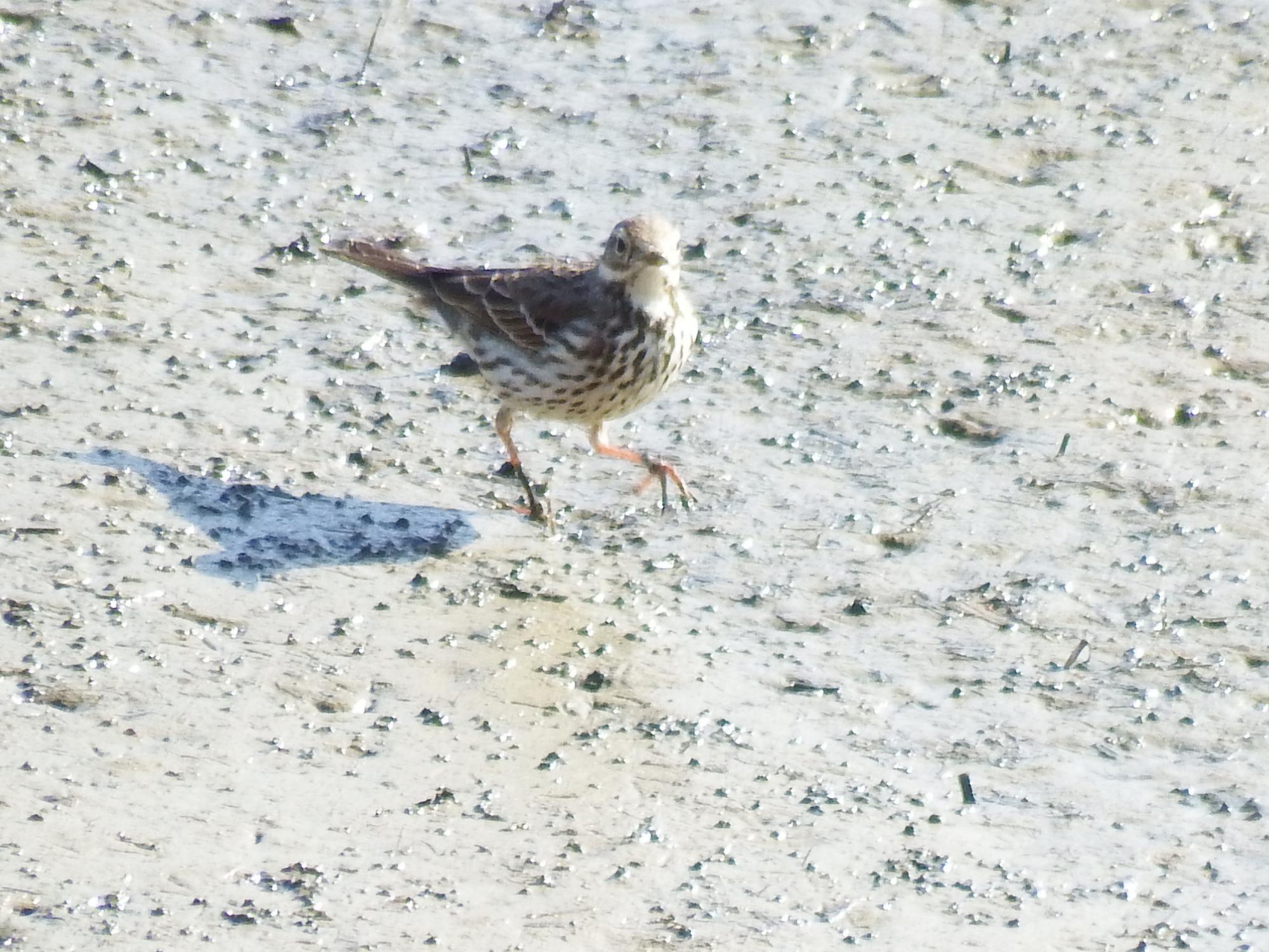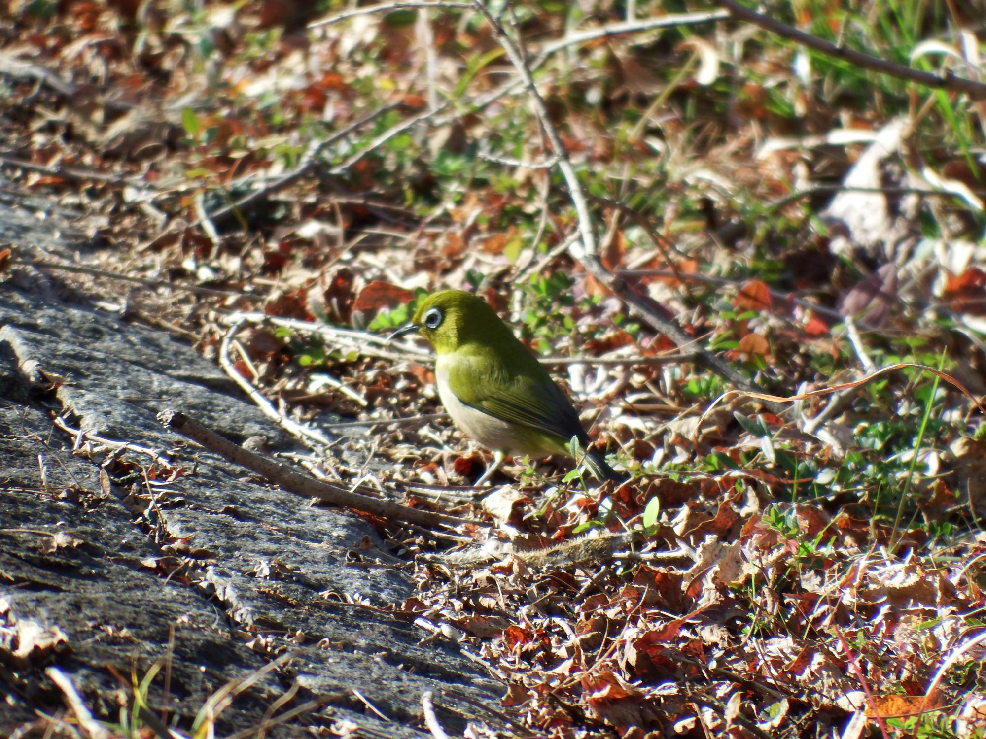 エナガたちは順光の高い木の枝に移動、地べたにはメジロ。かなり足が痛くなってきましたが、カワセミの池へ行ってみます。