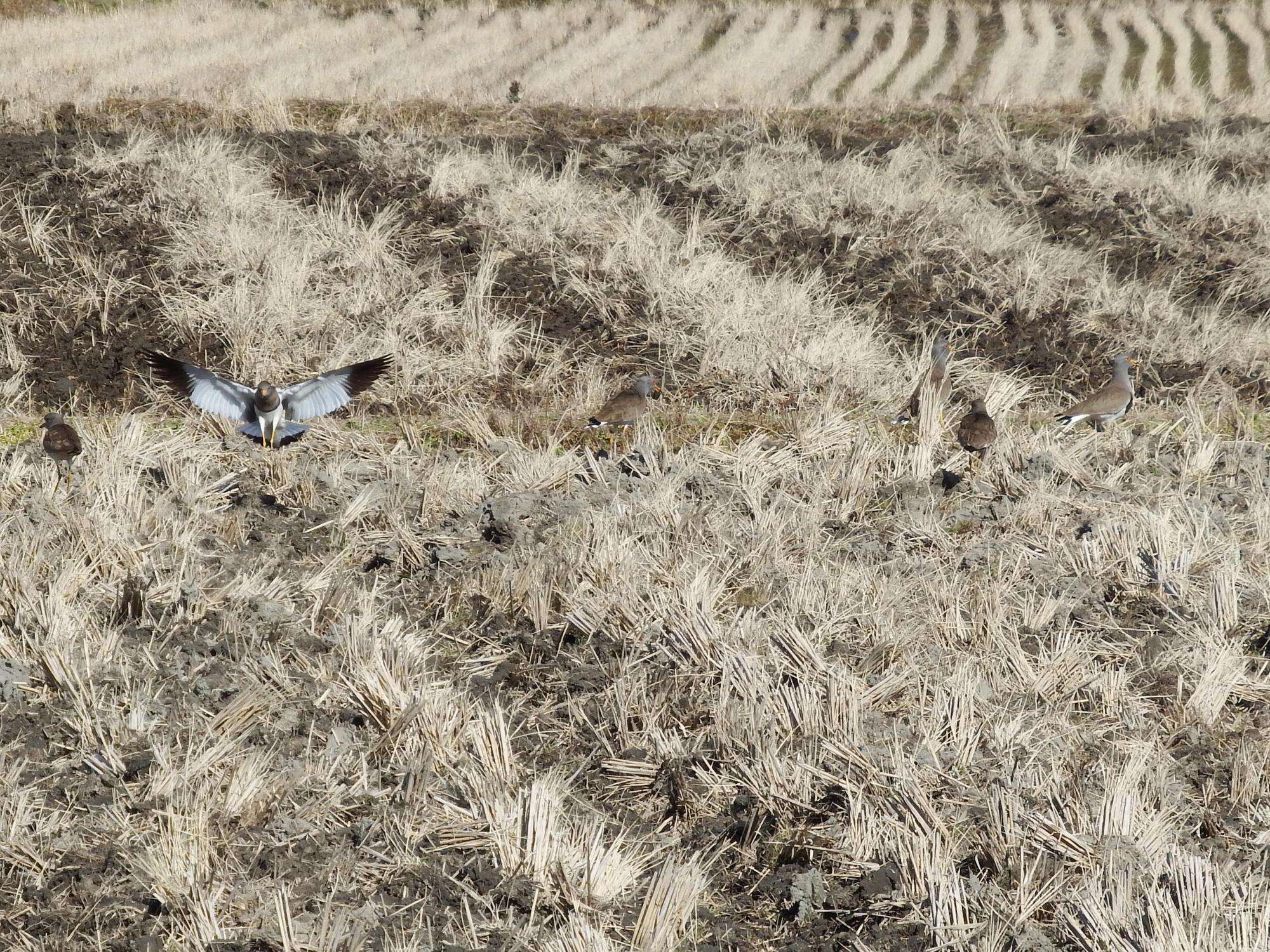 ケリが田んぼに下りたってうるさく鳴いてます。地面に下りたカシラダカも。
