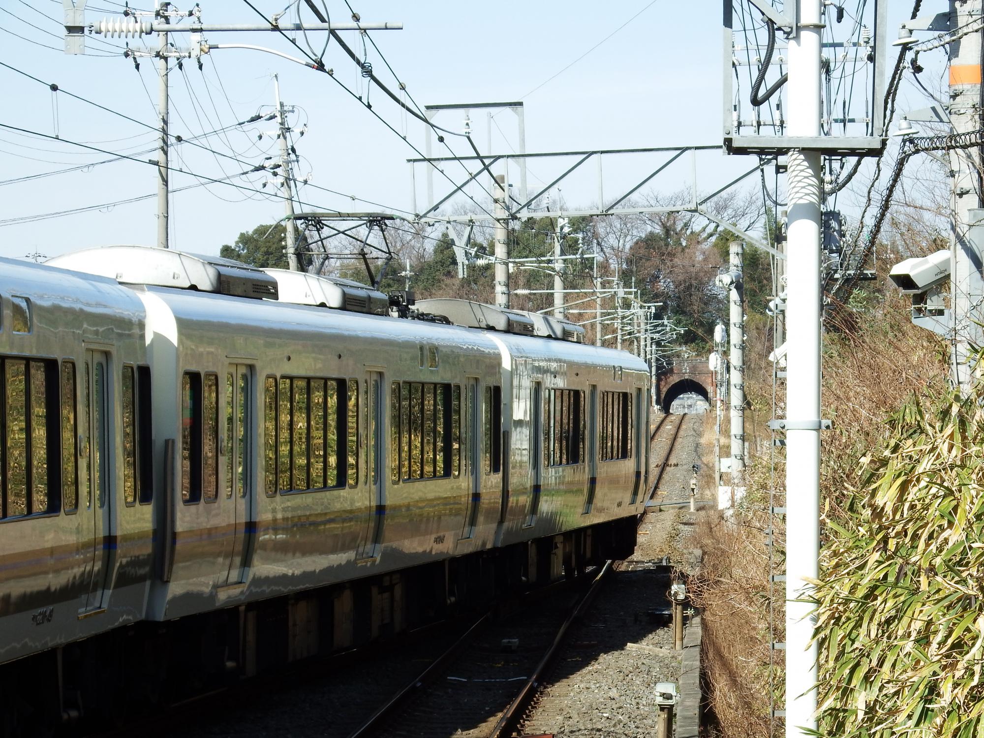 おおっと、という感じで駅の北側にレンガ積みの短いトンネル。しかし103系201系ばかりだった普通電車の221系化が進行しています。