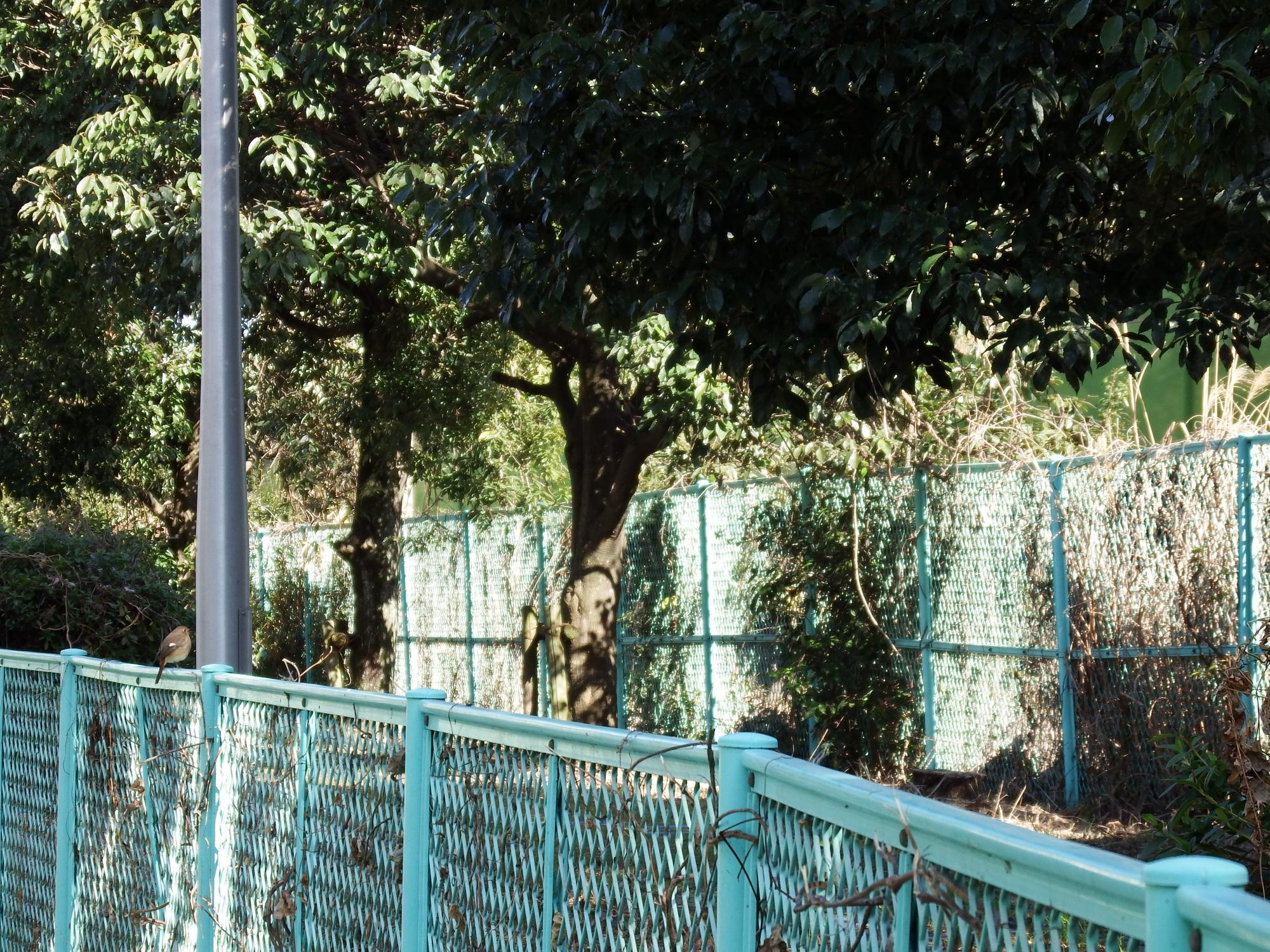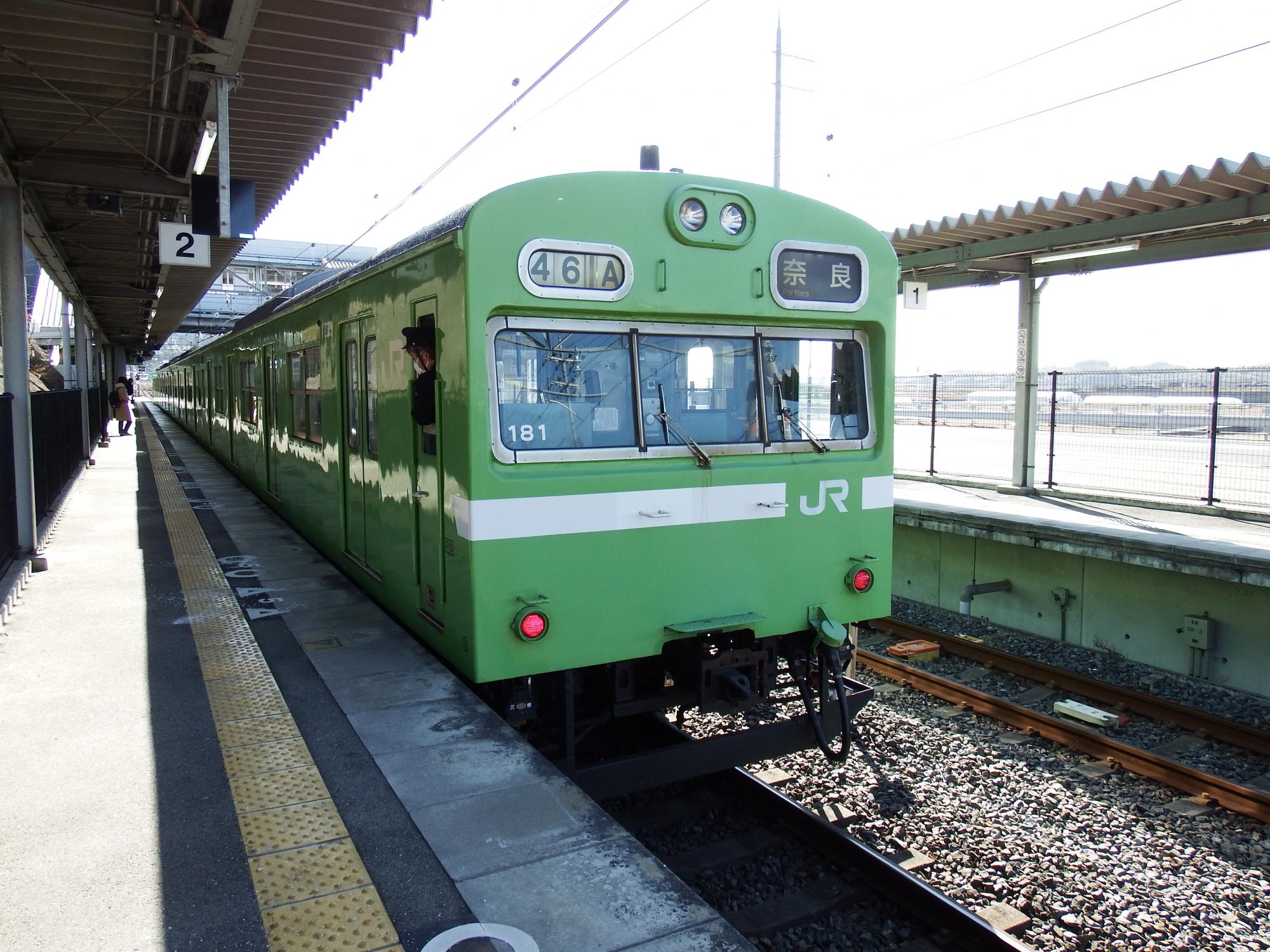 駅近くの公園でジョウビタキと遊んでいたら、柵の向こうを奈良駅から折り返してきた103系が行ってしまいました。木の陰の黄緑が103系です。
