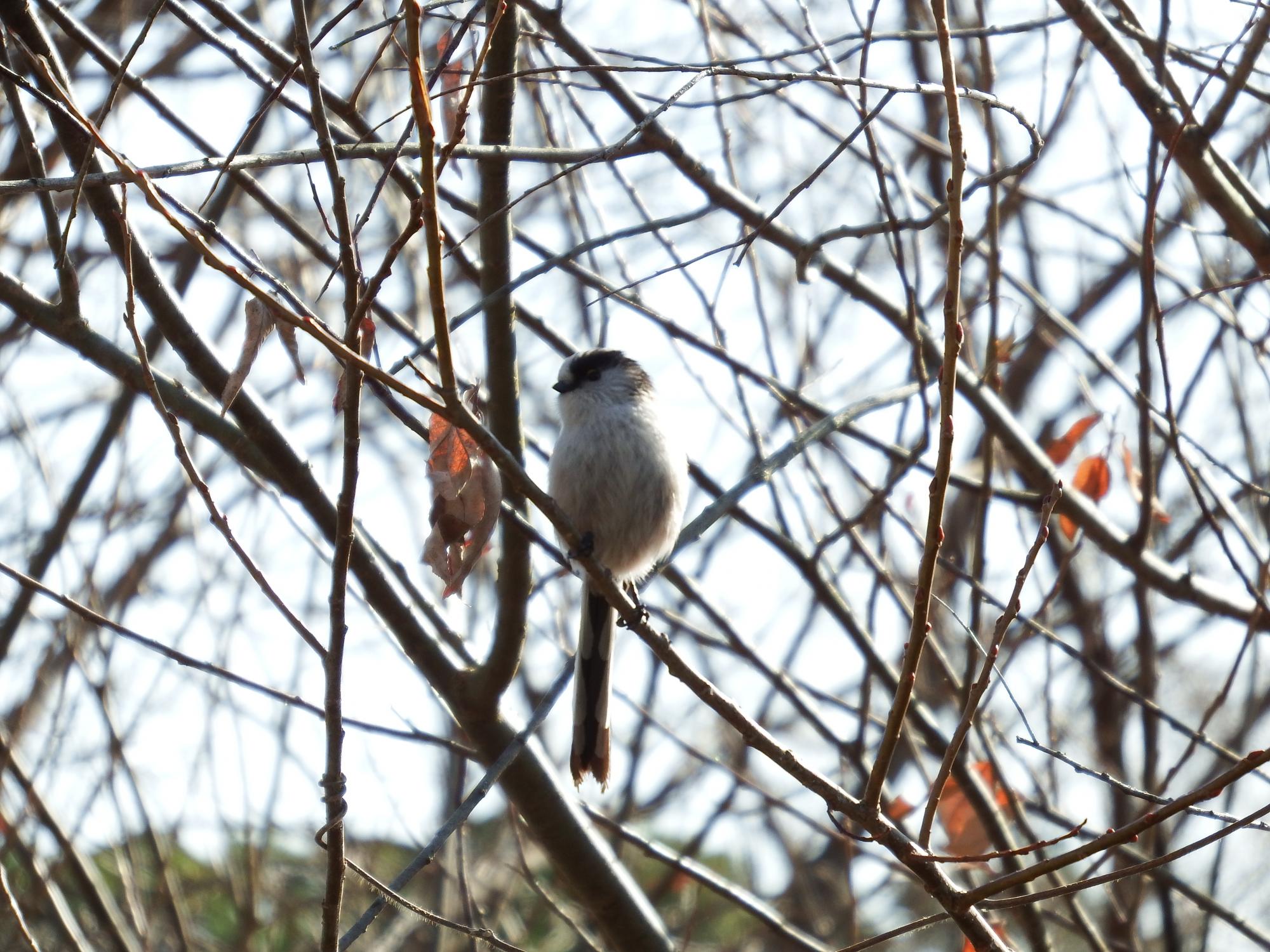 いつも落ち着きがなくて、ちょこまか動き回っているエナガが、思いっきり逆光の中、3mほど手前でじっとこっちを見ています。