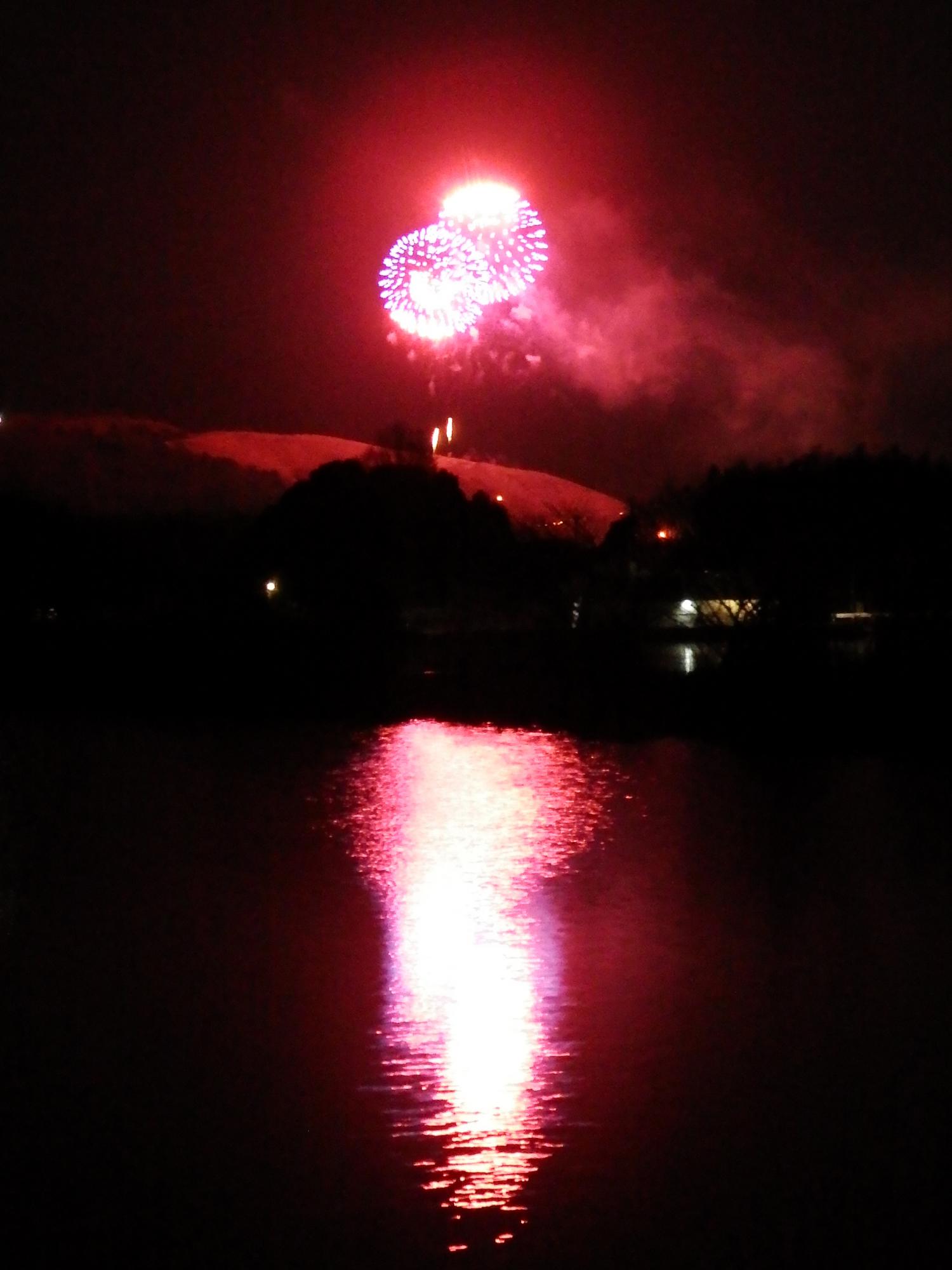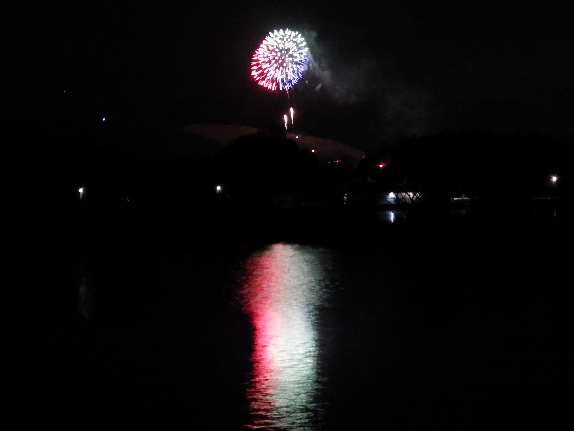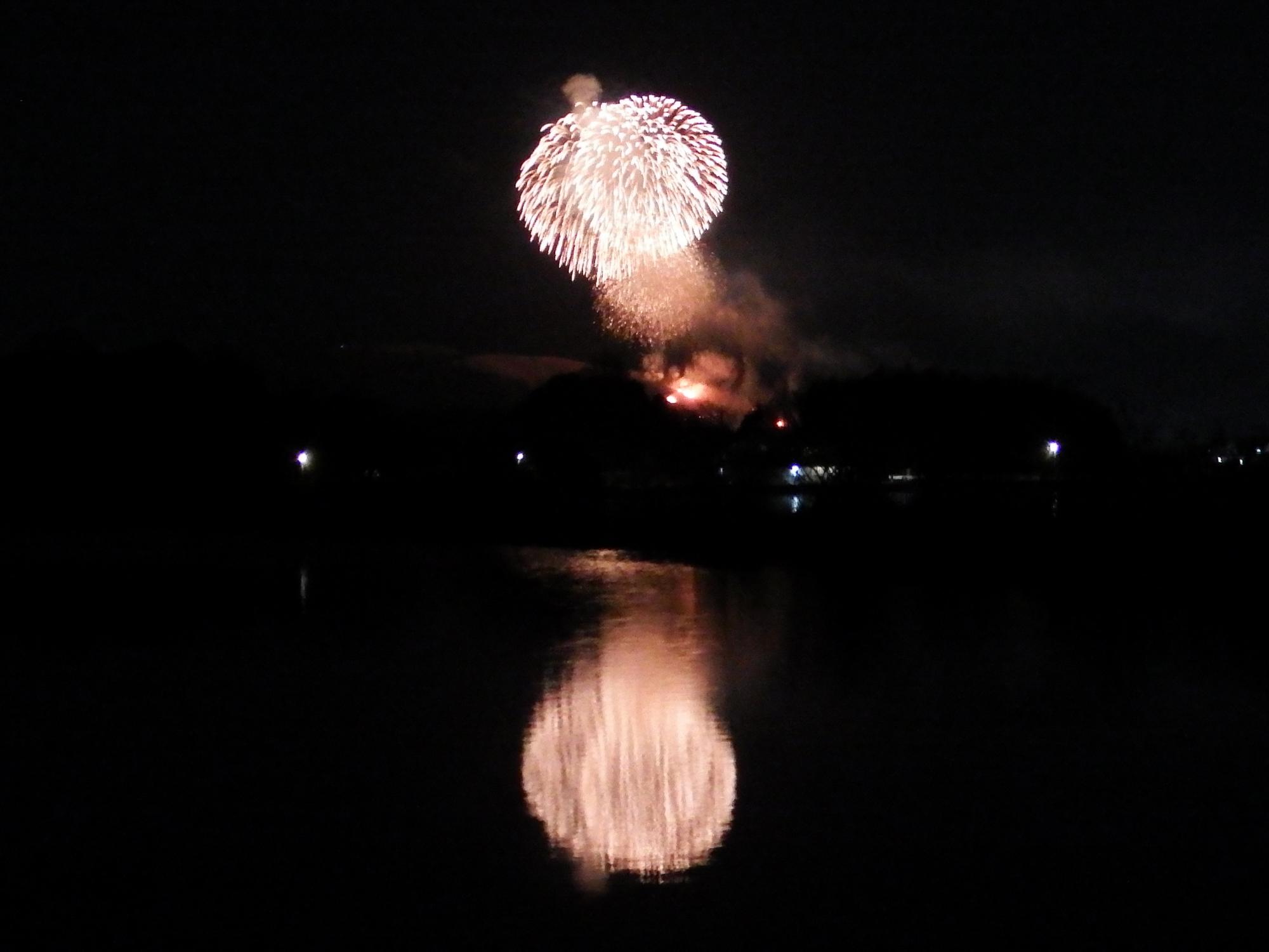 6時15分花火が始まりました。水上池に映る花火です。この辺りではさすがに観光客は少なく近所の人たちに混じって見物、空気が澄んで例年になく綺麗な花火だそうです。