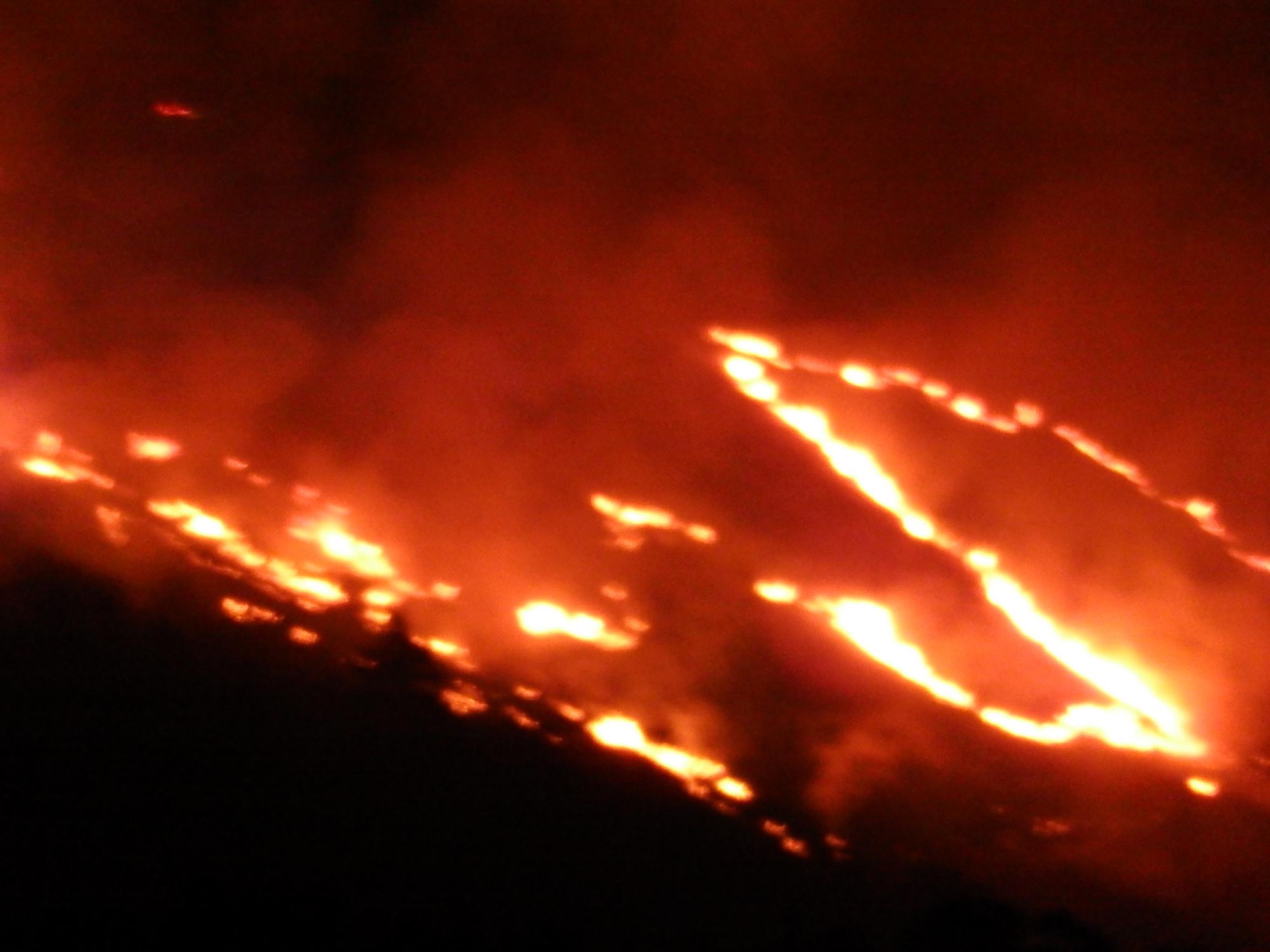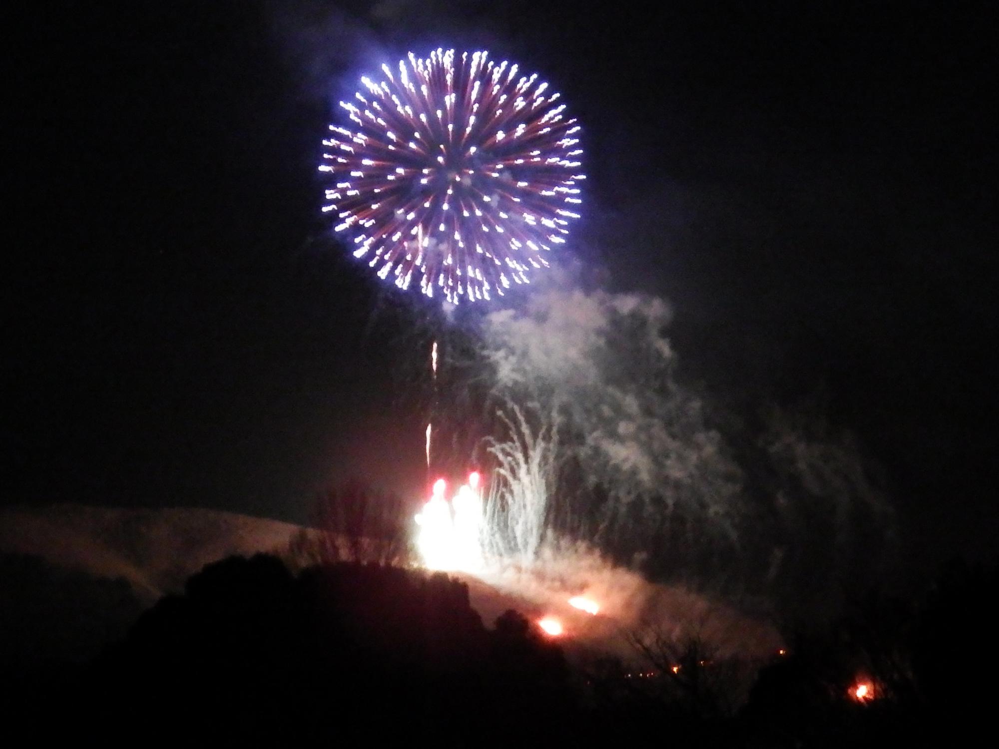 花火を打ち上げている下から山焼きの火が燃えあがってきました。