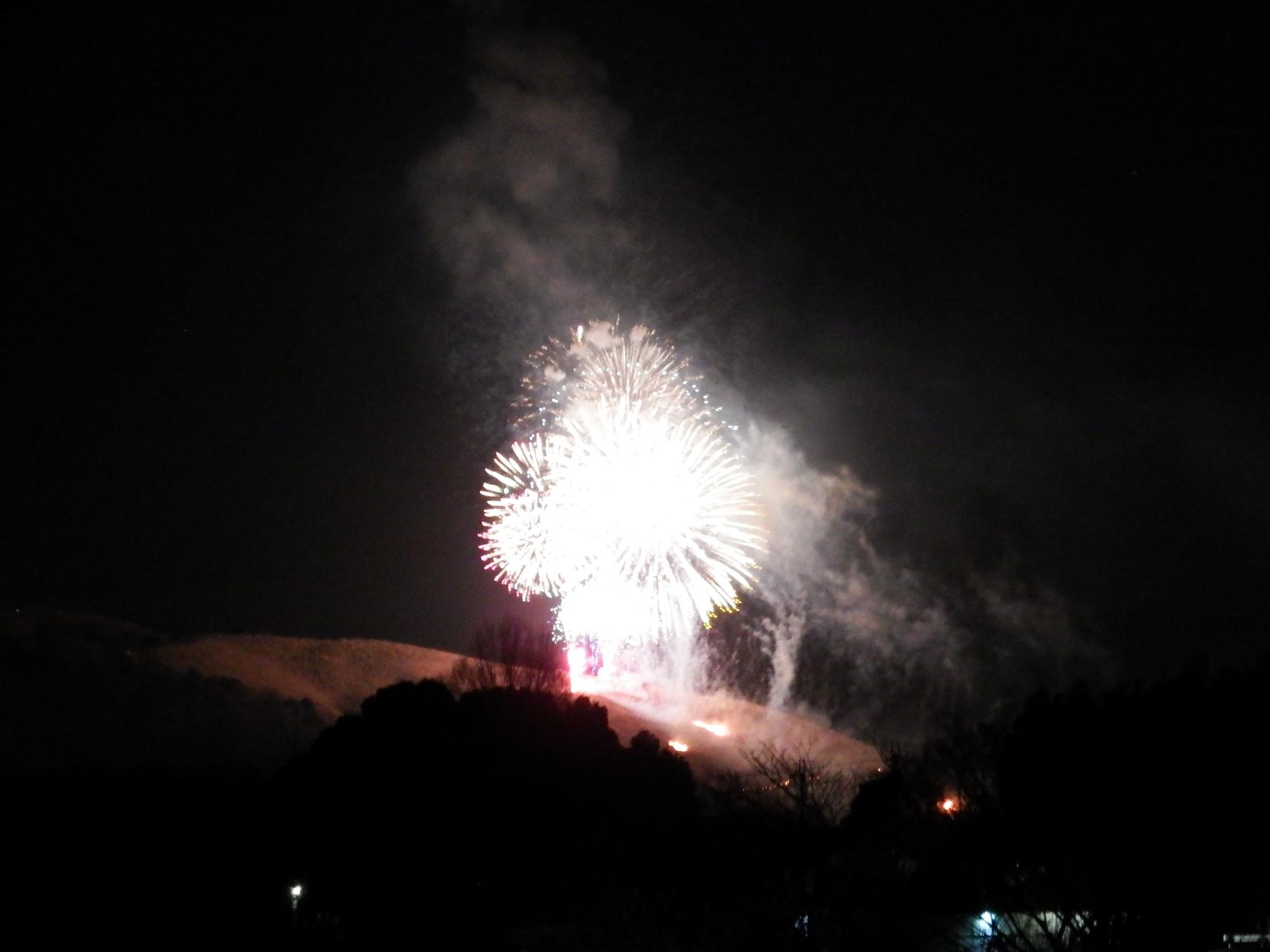 花火は15分ほどで終了、山焼きの火だけが燃え続けていますが、山焼き自体はこれだけ遠いと、山火事のようにしか見えません。