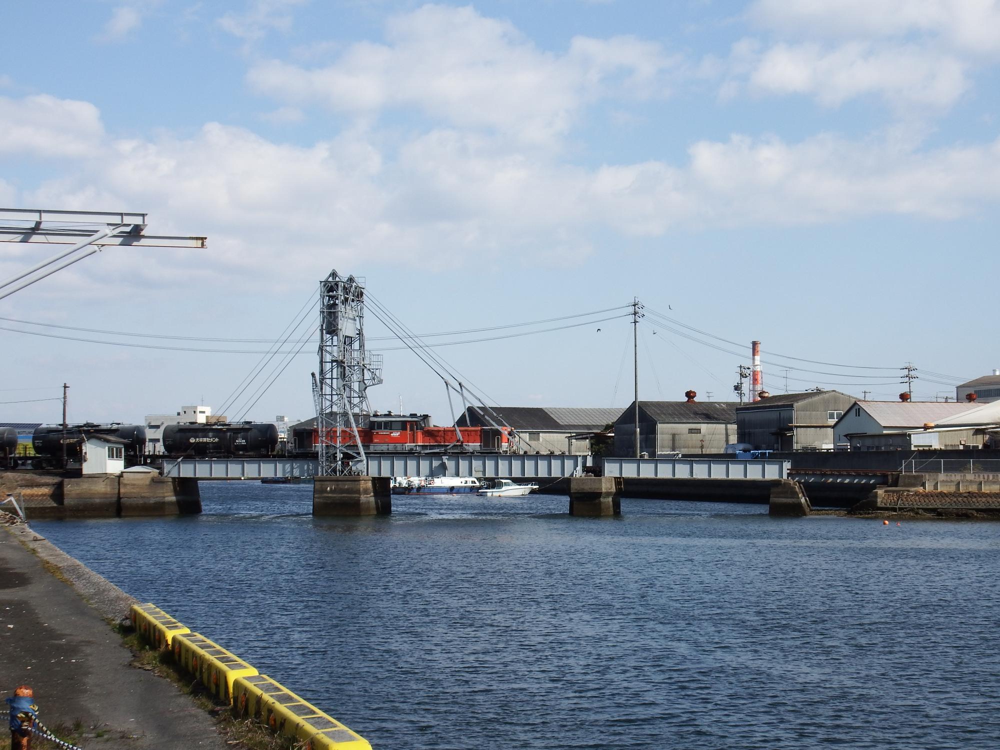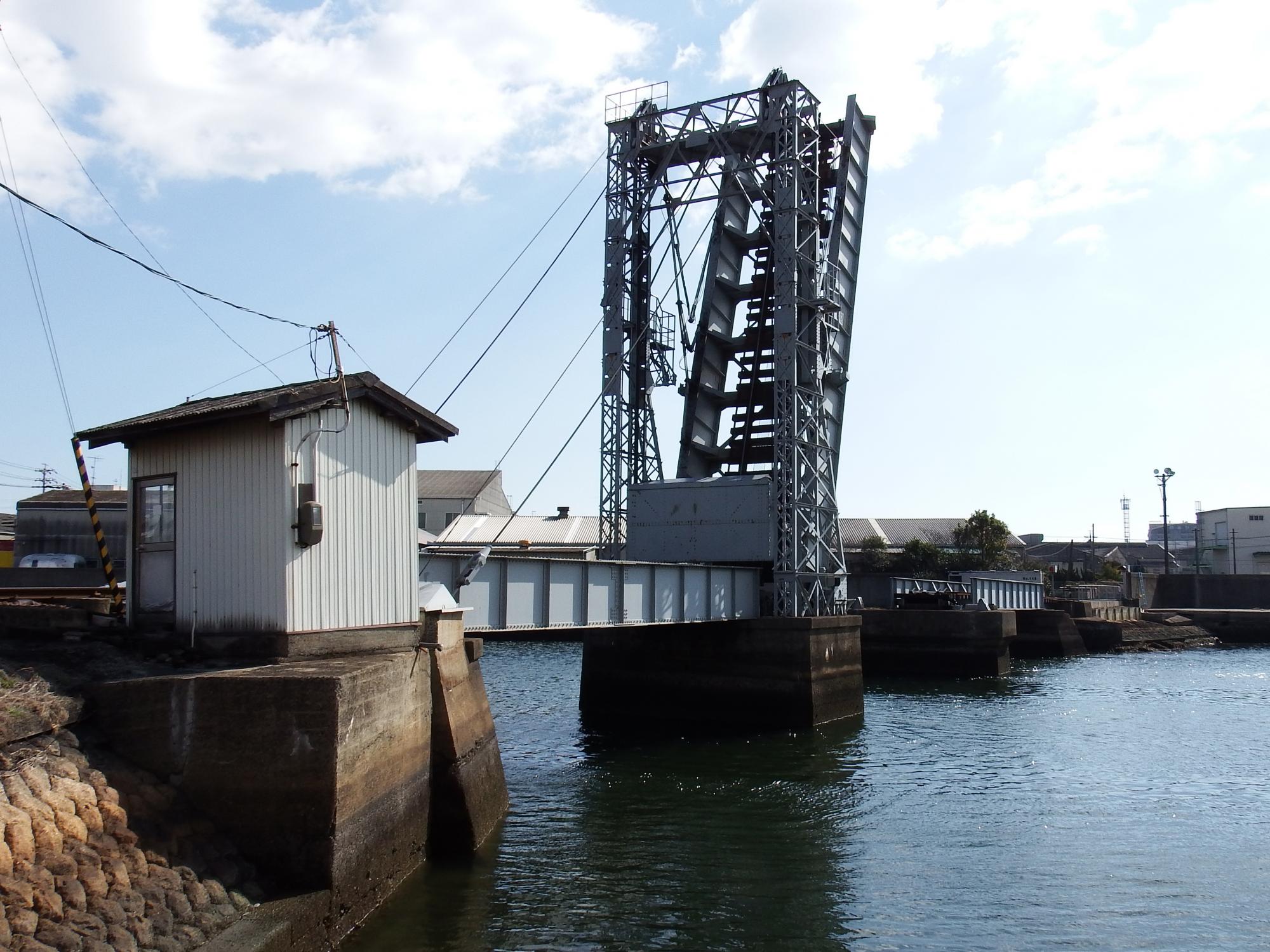 全国で唯一の現役の可動式鉄道橋、末広橋梁。デフォルトは跳ね上げた状態ですが、日曜日は下りた状態のままだそうです。