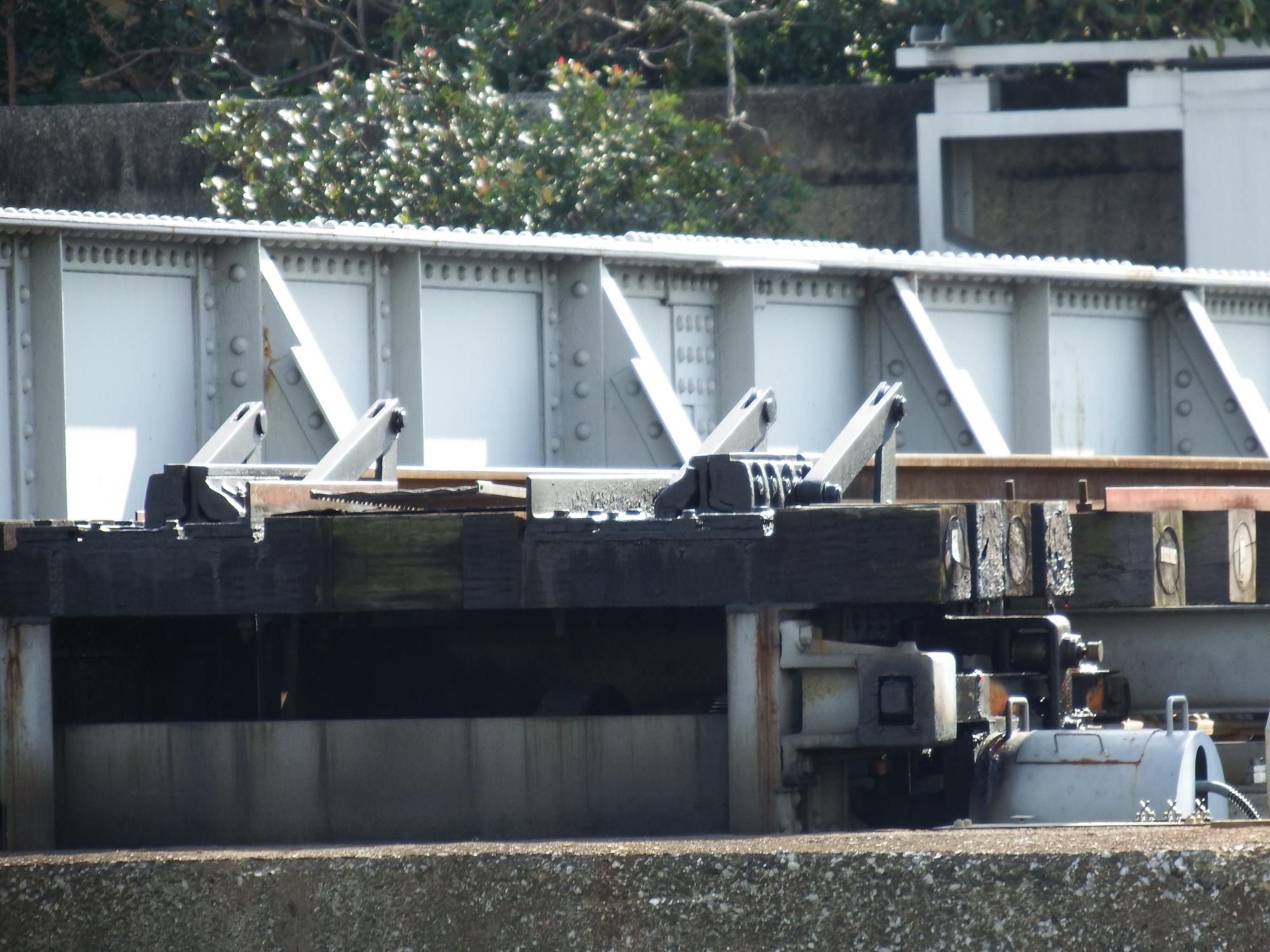 国指定重要文化財になってます。橋の向こう側のレールの接続部分を撮ってみました。このままだと列車は通れないので橋が繋がると金具が機械的に移動するようになっているようです。
