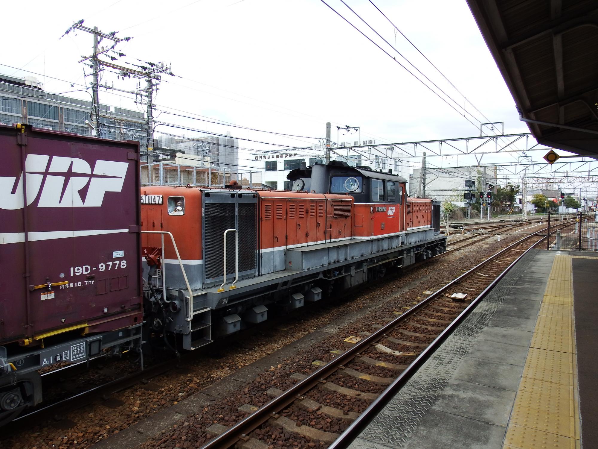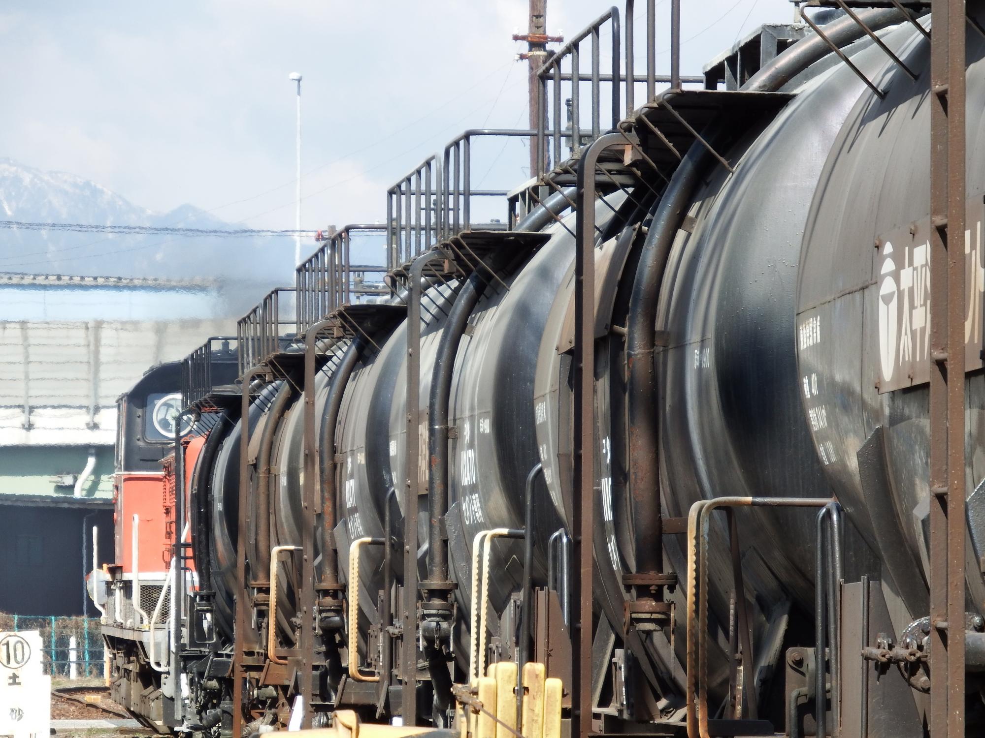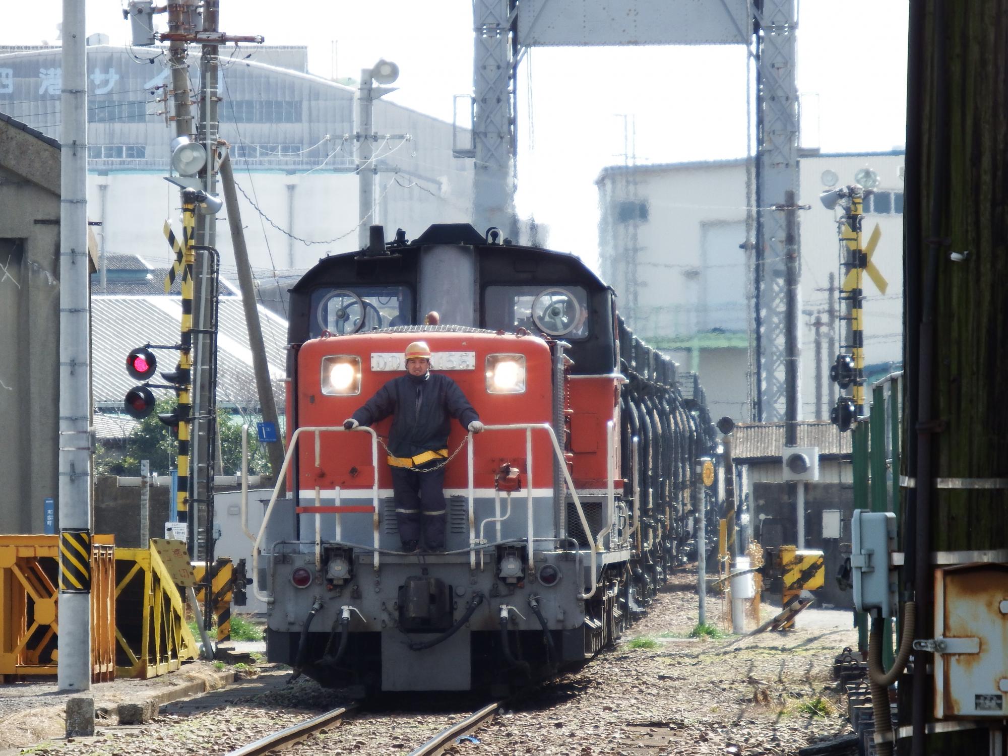 JR四日市駅、東側の側線にガソリンタンカーを牽いたDD51重連、西側の側線にコンテナ列車も入線。