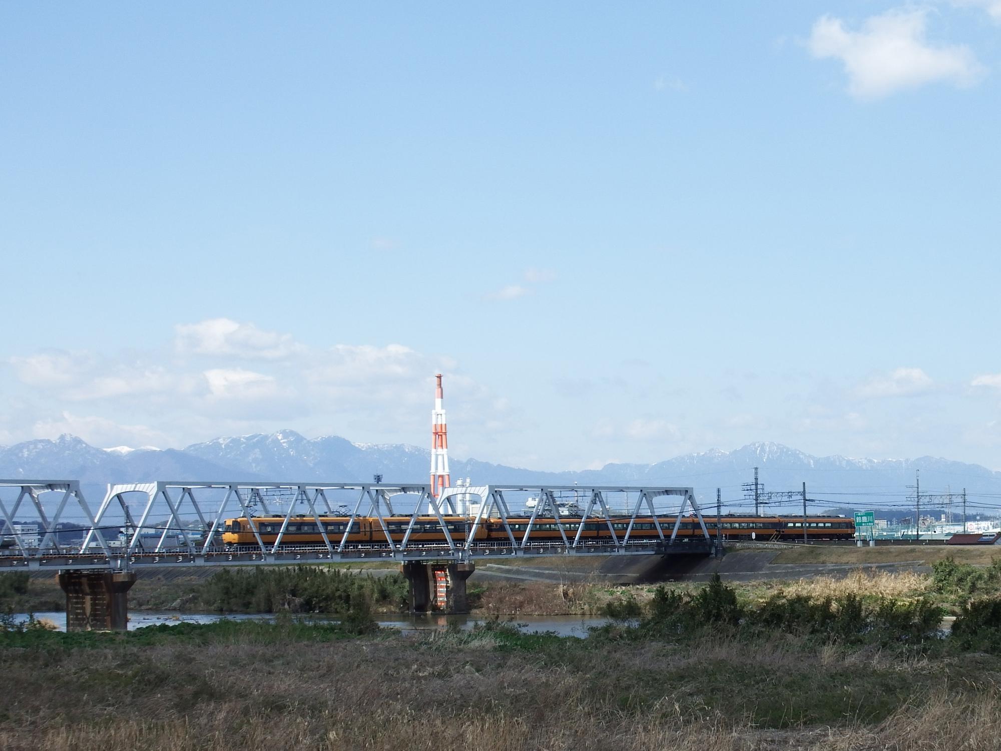 鈴鹿川を渡る近鉄特急。塩浜駅でタンク車の陰に旧塗装の近鉄電車がちらり。