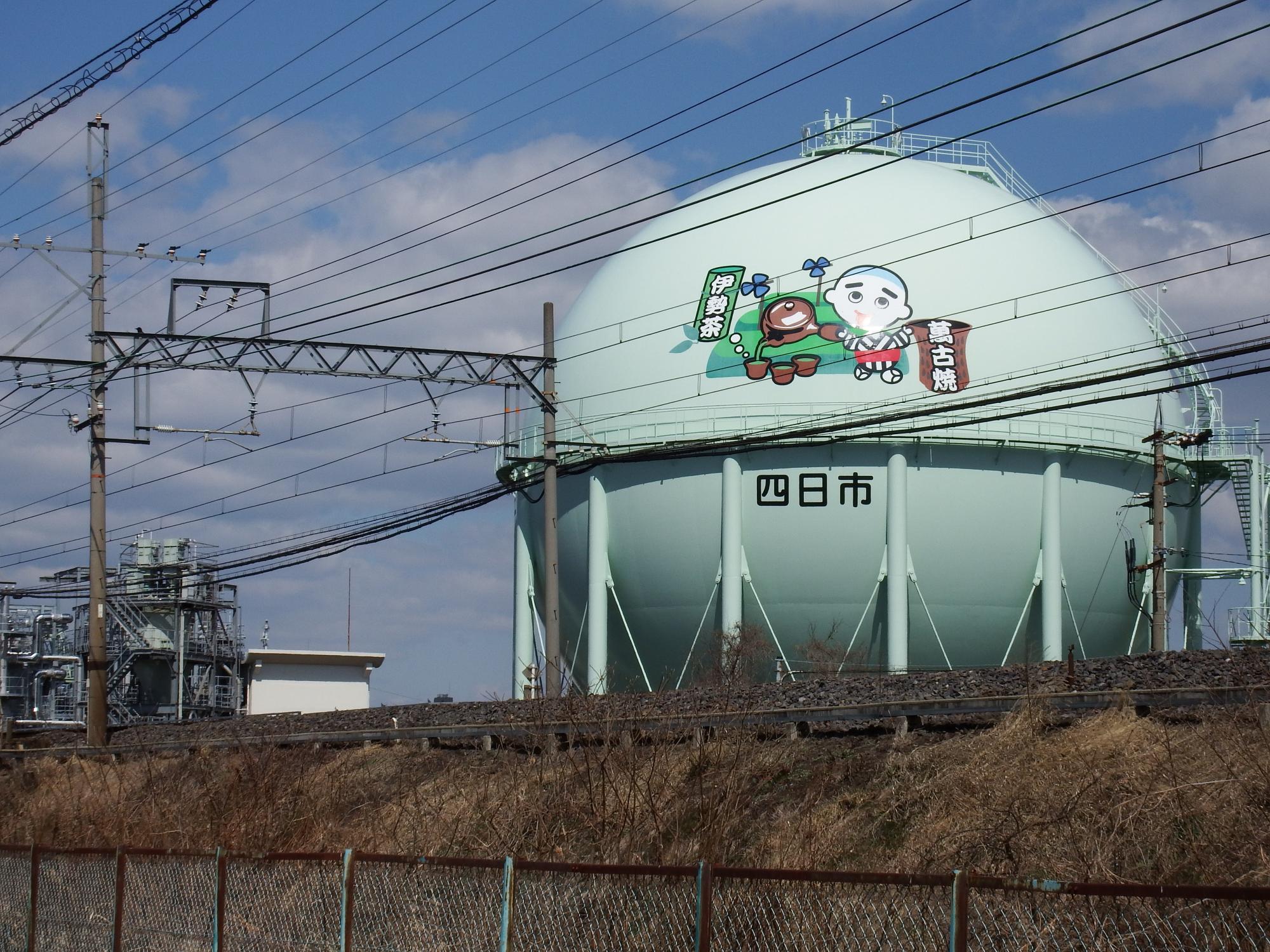 四日市市内のいろんなところで登場する「こにゅうどうくん」、ガスタンクにも。