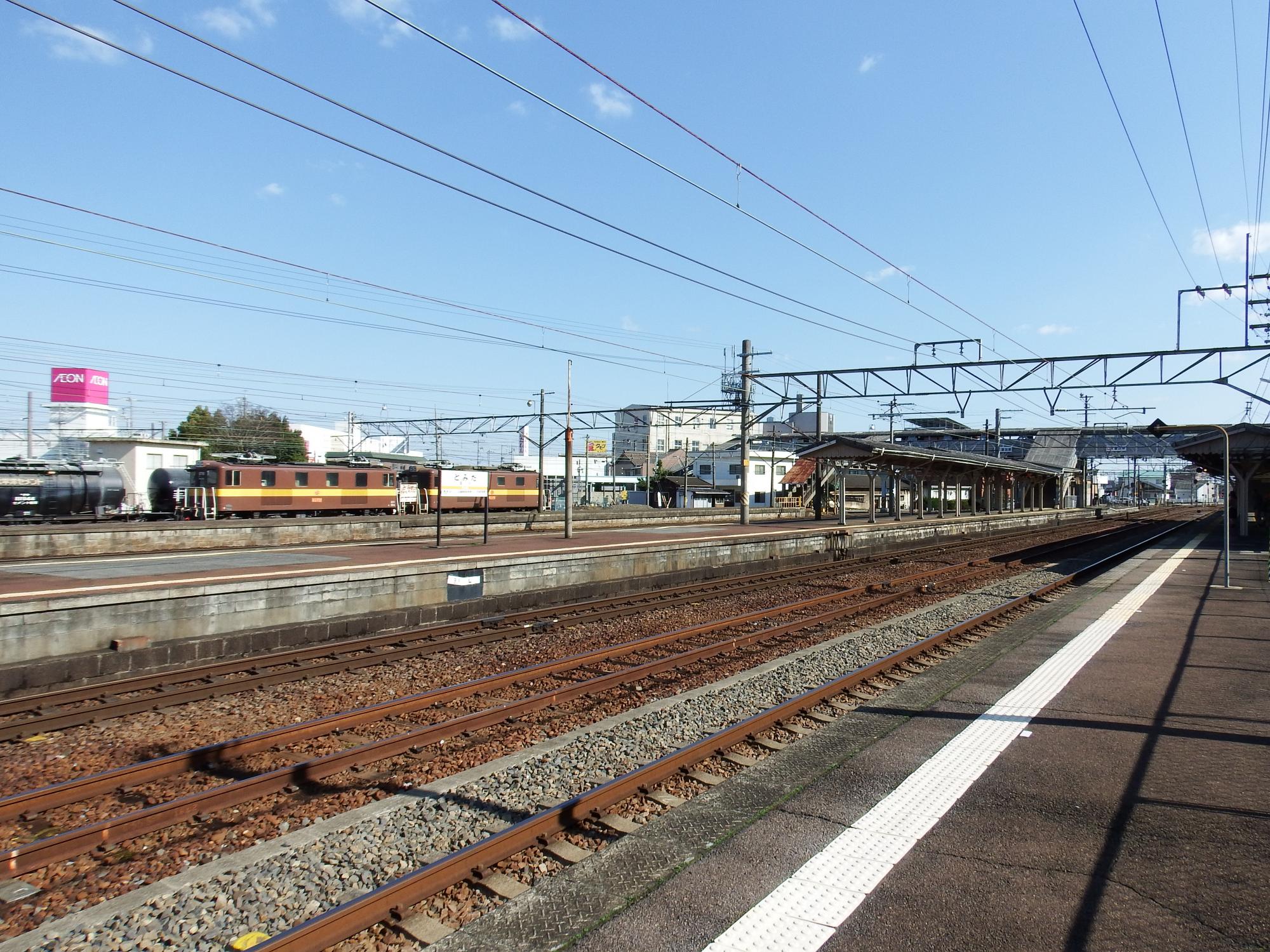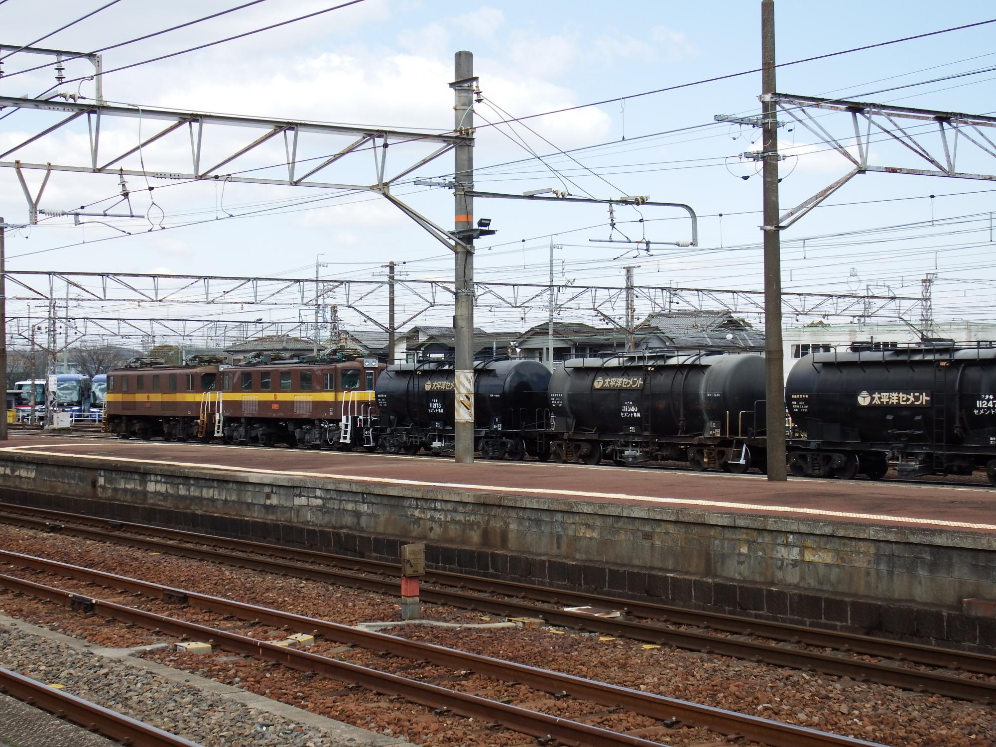 富田駅に着くと三岐鉄道のED45形重連がタキ1900の先頭についています。つまり四日市港から東藤原までの途中、ここ富田でDD51から三岐鉄道の電気機関車に付け替えるわけです。