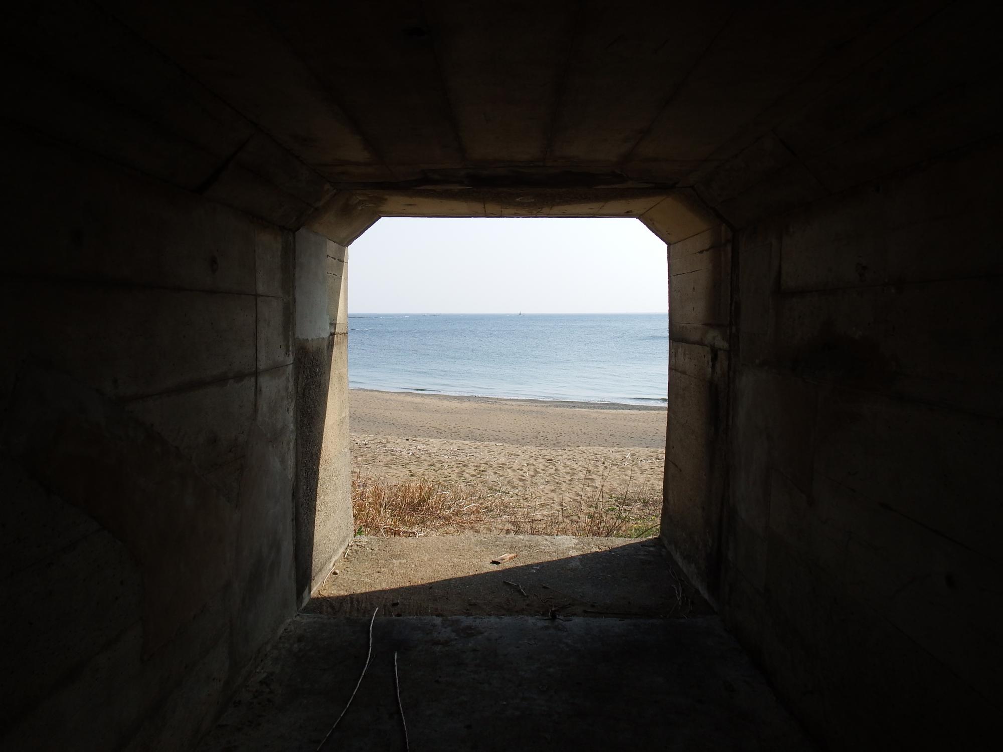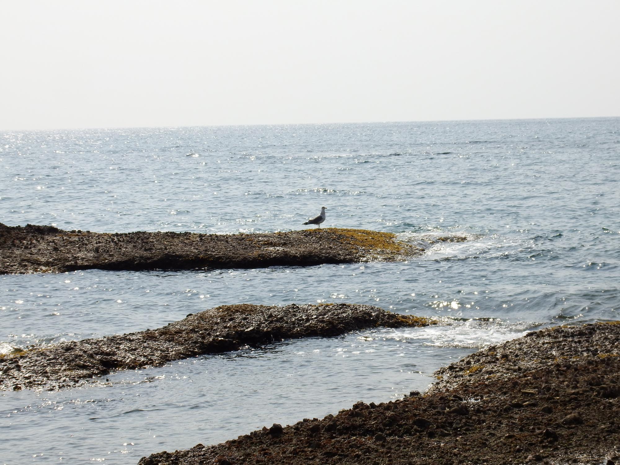 浜の中ほどの小さな磯にウミネコが一羽、物思いげにじっと海を眺めています。浜に続く自分の足跡、5月頃になるとアカウミガメが産卵にやって来るそうですが、かなり厳しく保護されていてアカウミガメに会うことは容易ではなさそうです。