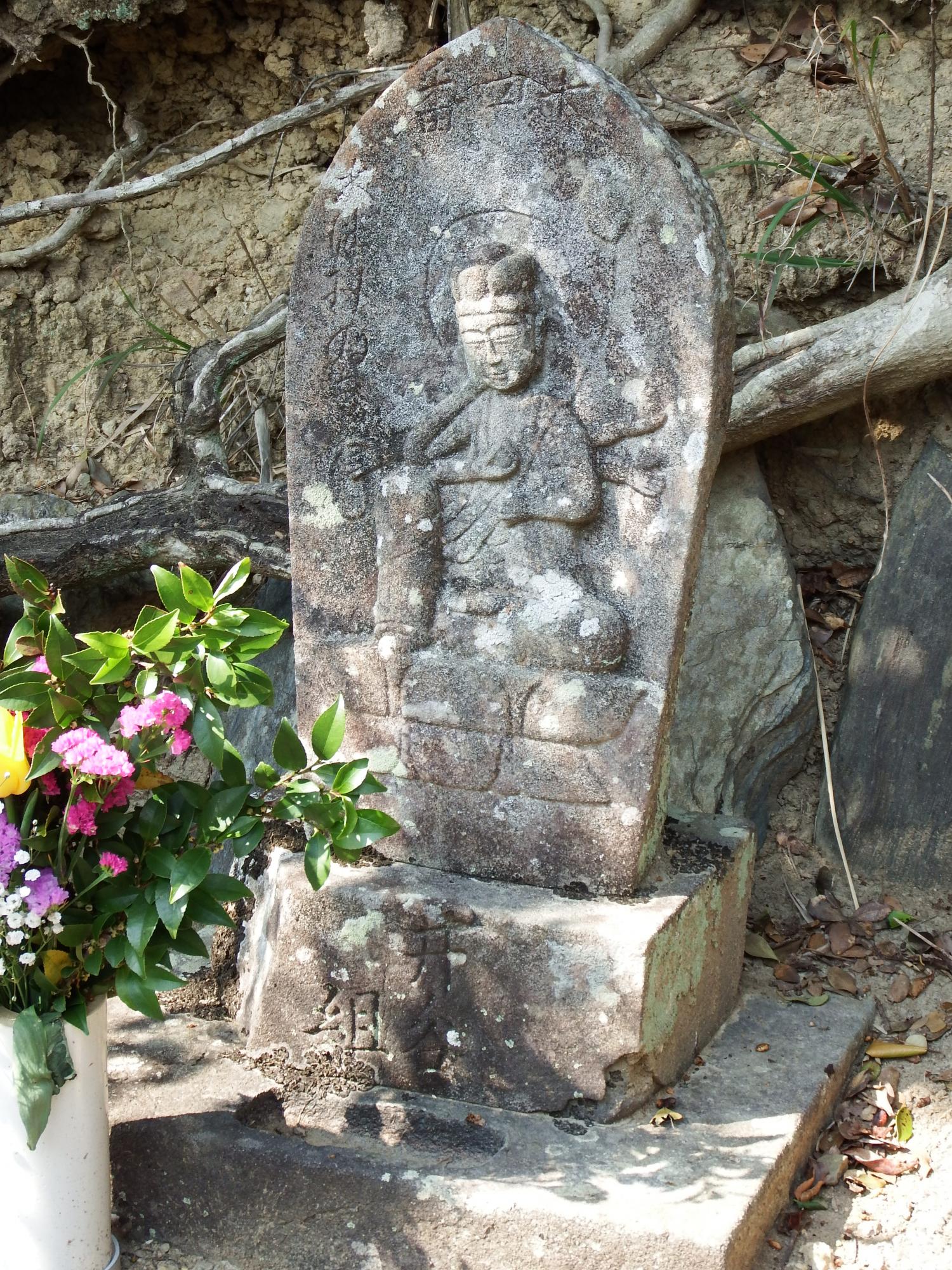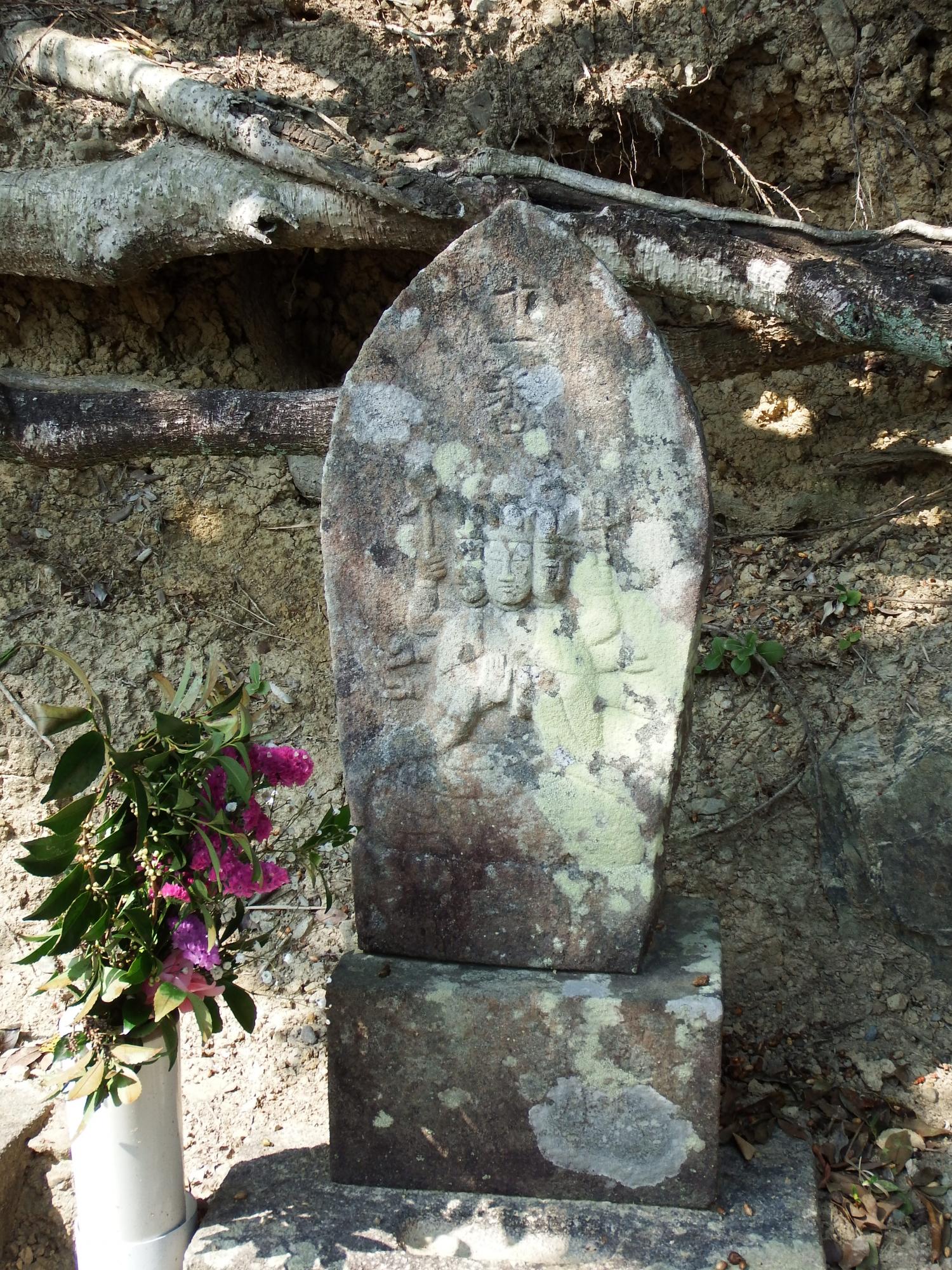 千里の浜の北端に千里観音と千里王子が並んでいます。千里観音の参道に33体の石仏が並んでいます。その14番の千手観音と、11番の三面観音、なぜか十字架を掲げているように見えます。