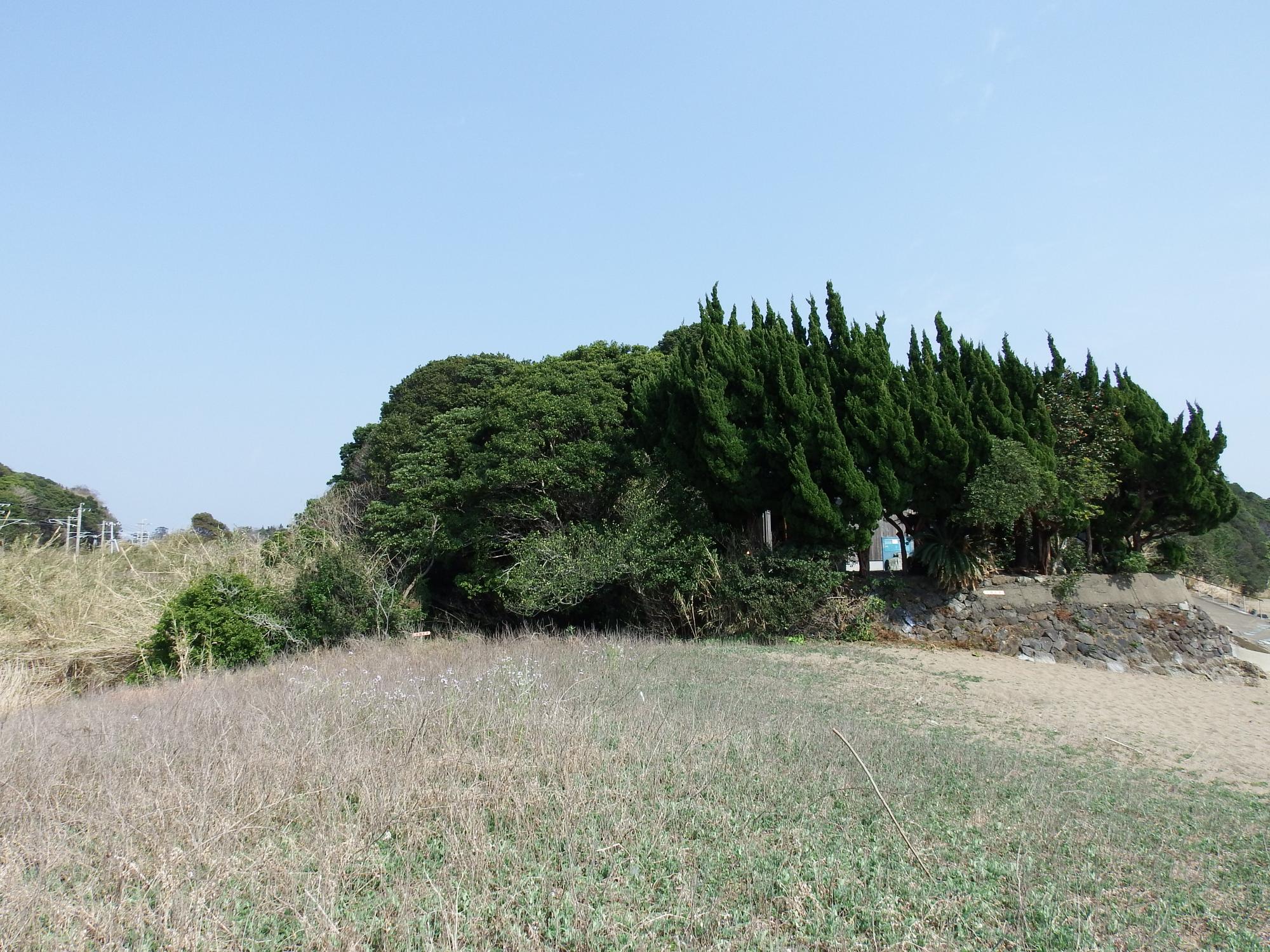 砂浜の石垣の上で防風林に囲まれた千里王子。