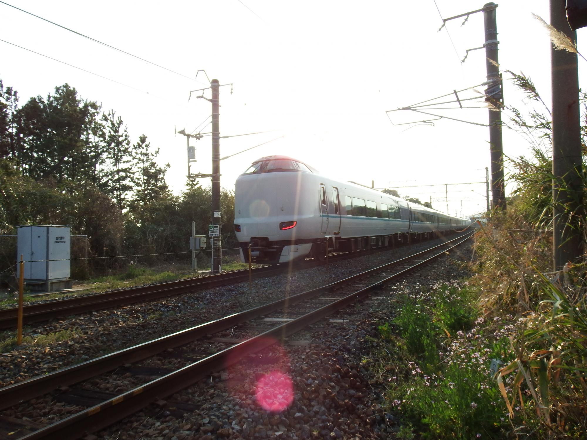 夕日と特急くろしお。でもやはり薄雲が厚く夕日は水平線に沈む前に見えなくなってしまいました。