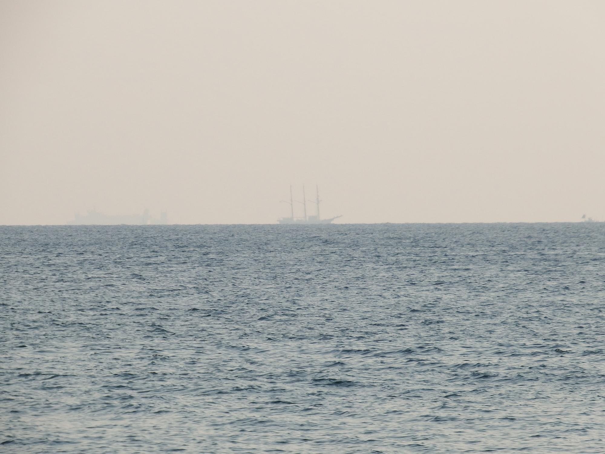 遥か沖、3本マストの船、ググってみたらすぐわかりました。みらいへという人材育成の研修のための船です。289系のくろしおがへばりつく様に崖を登って行きます。