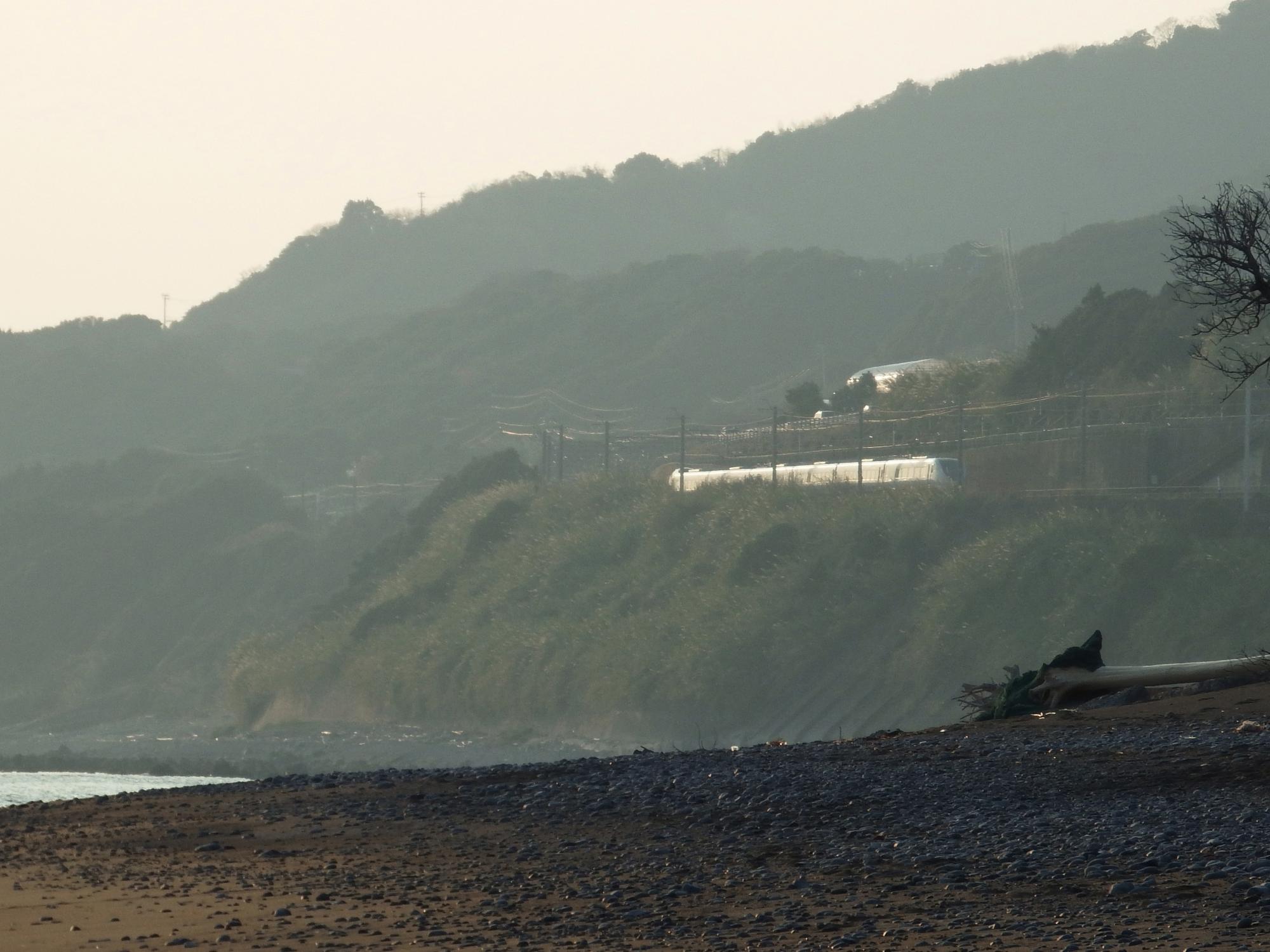 何かの稚魚がいるばかりです。向こうの海辺は289系くろしお。