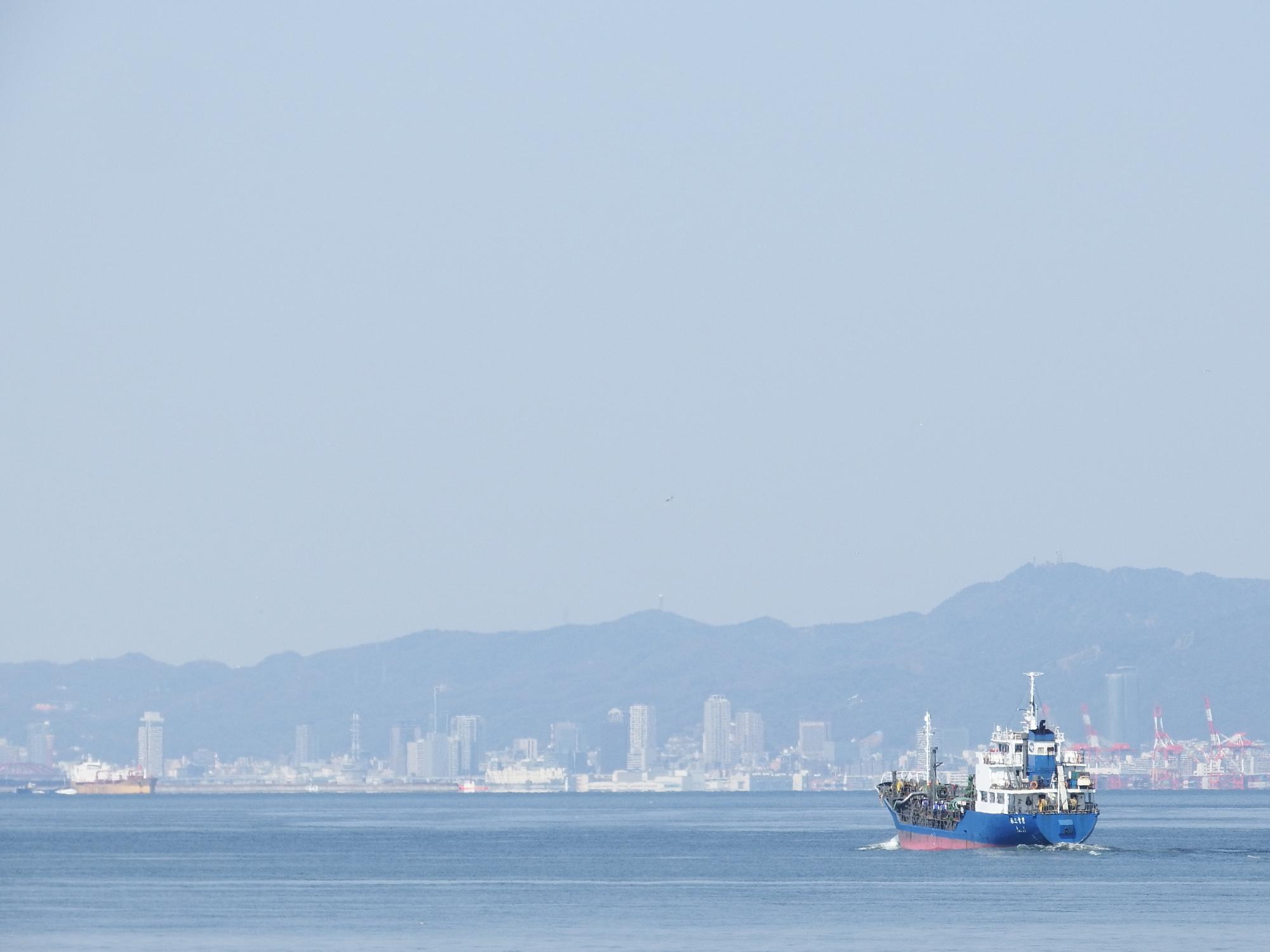 神戸と六甲を背景に第三青鷹(せいよう)というケミカルタンカーです。よーく見ると左端に小さくポートタワーが写ってました。