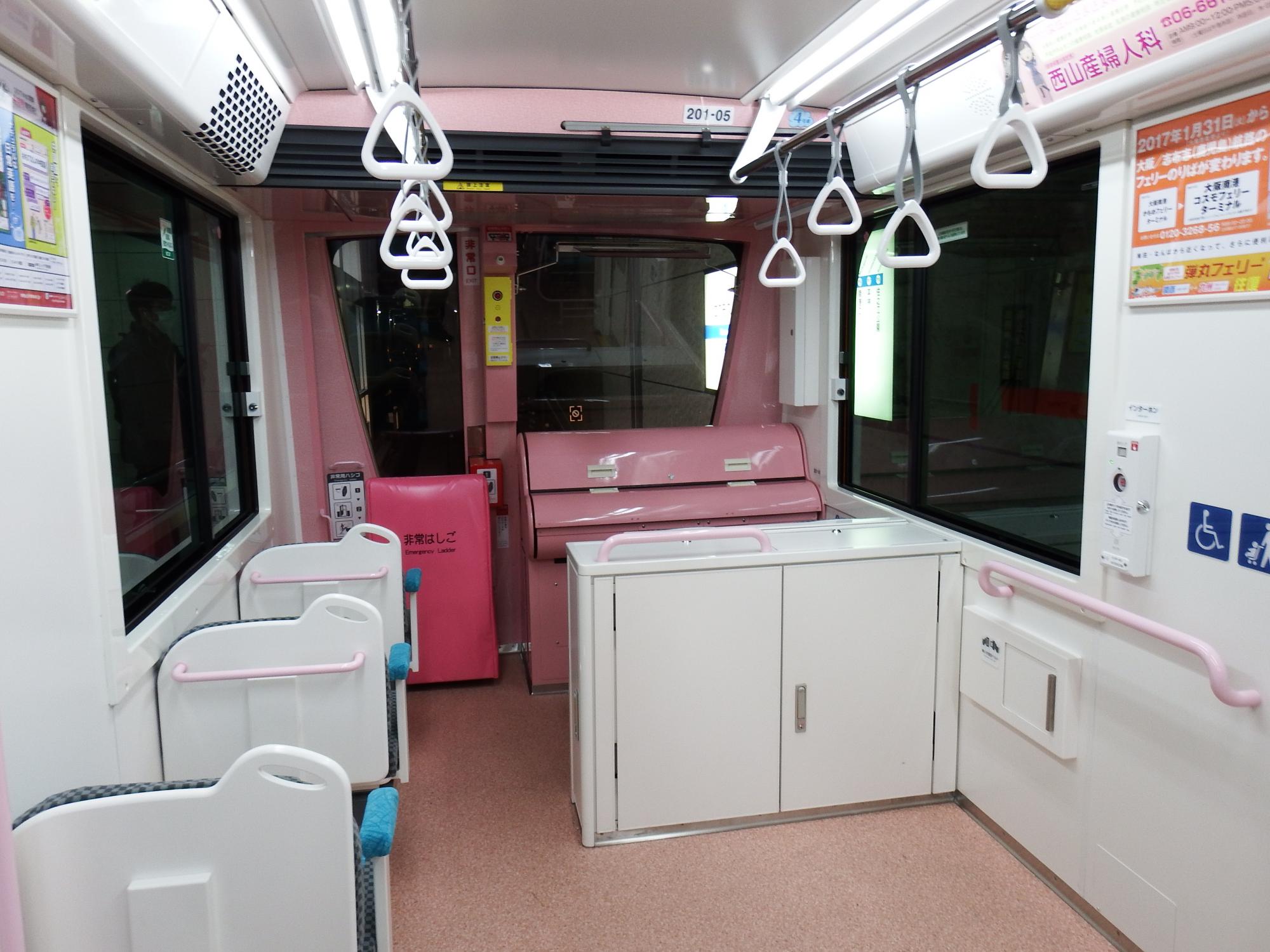 ニュートラムの新型200系に初乗車、7色あってこれはオレンジ。かぶりつきがクロスシートになってます。