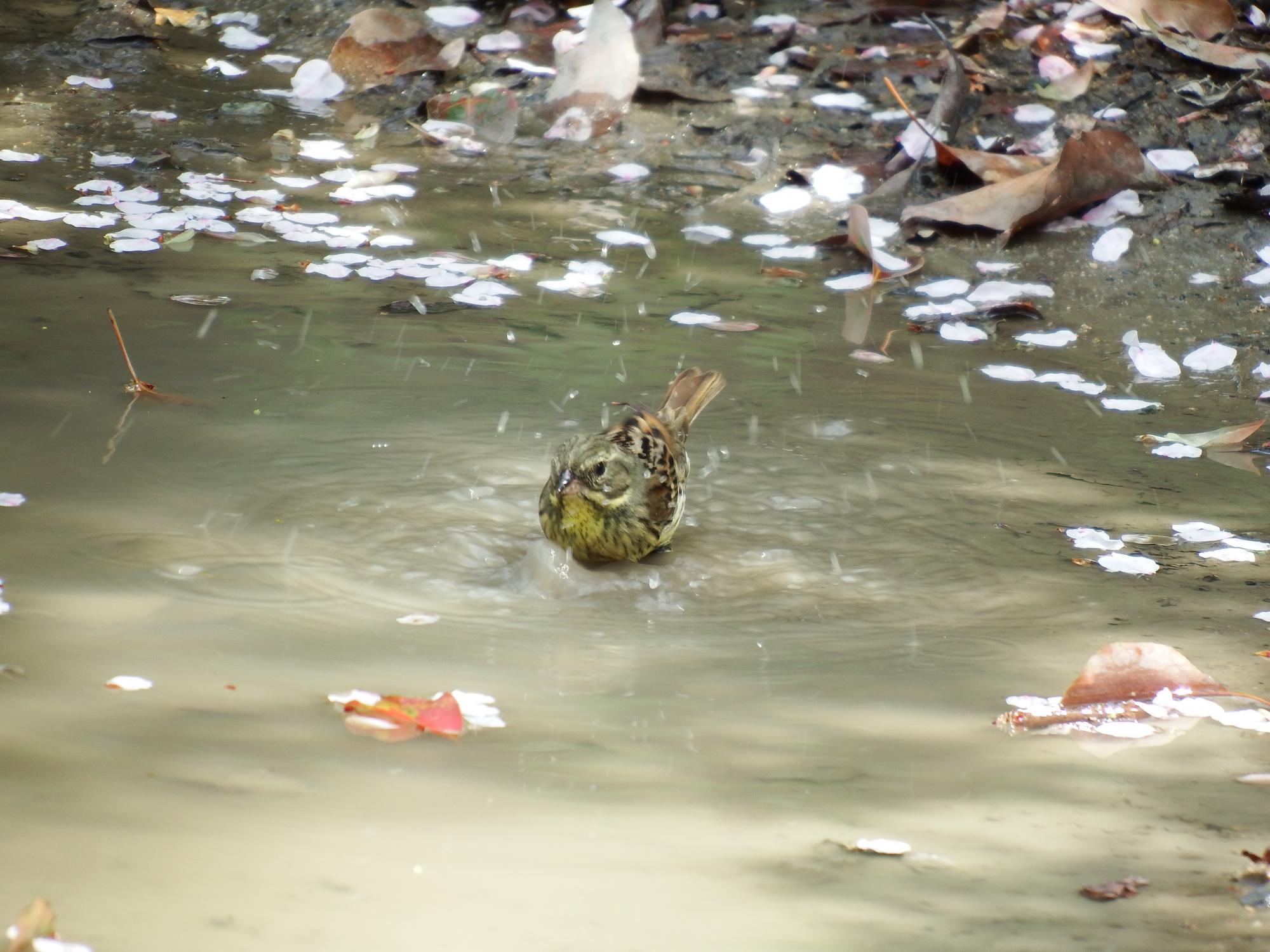 人恐れを全然しなくなった北へ帰る前のシロハラとショボく水浴びのアオジ。