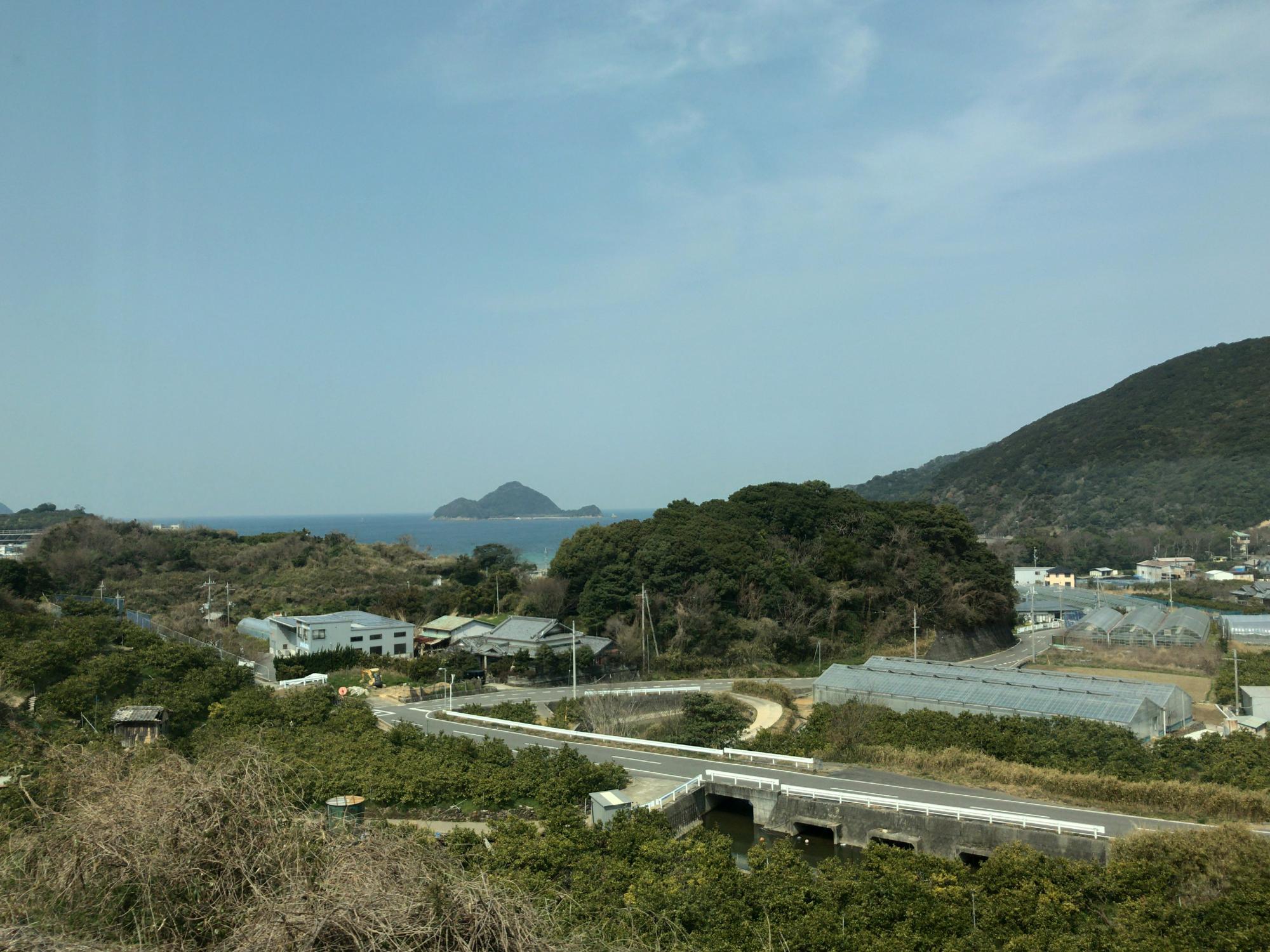 海は太平洋、紀勢線に乗ると冷水浦を過ぎたあたりから車窓に海。写真は広川ビーチ駅を過ぎたあたりから見える唐尾湾、浮かんでいるのはひょうたん島みたいな島は、鷹島という無人島です。この先、切目辺りから太平洋はどーんと車窓に広がります。